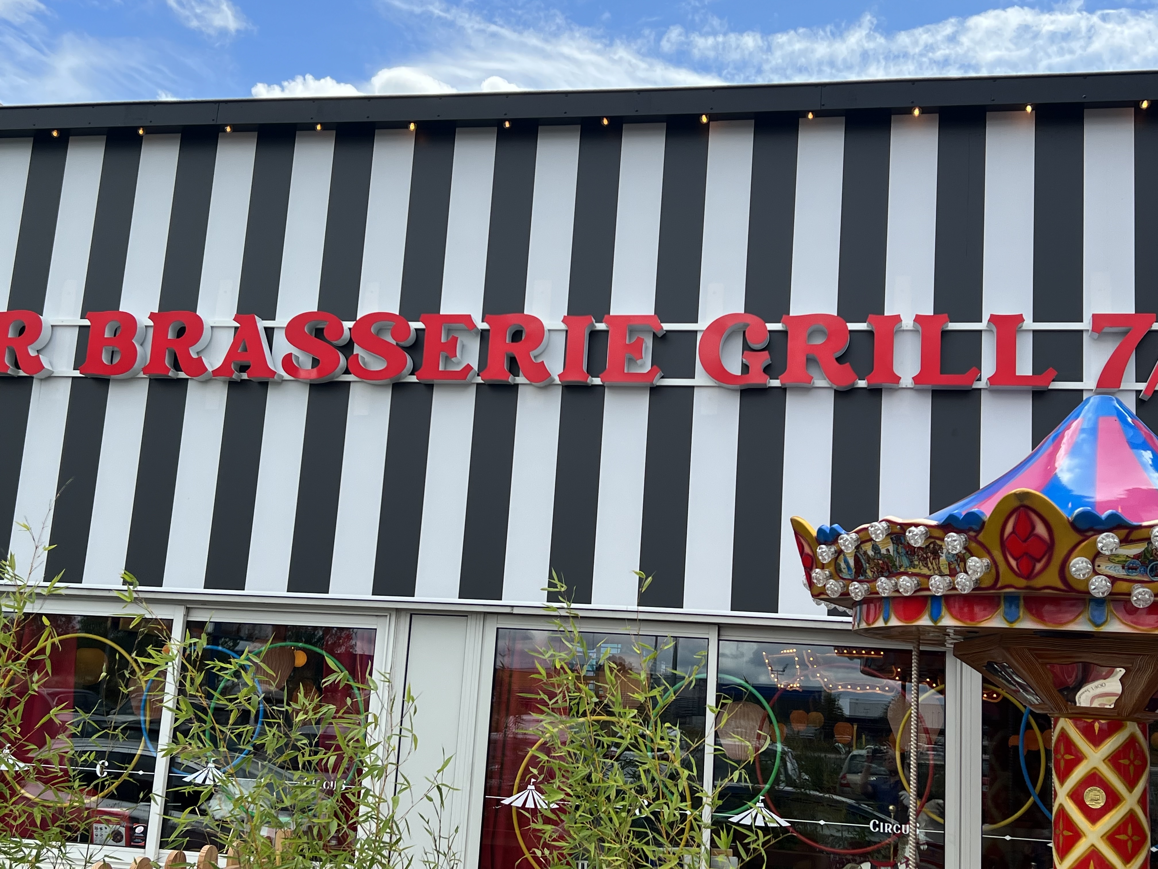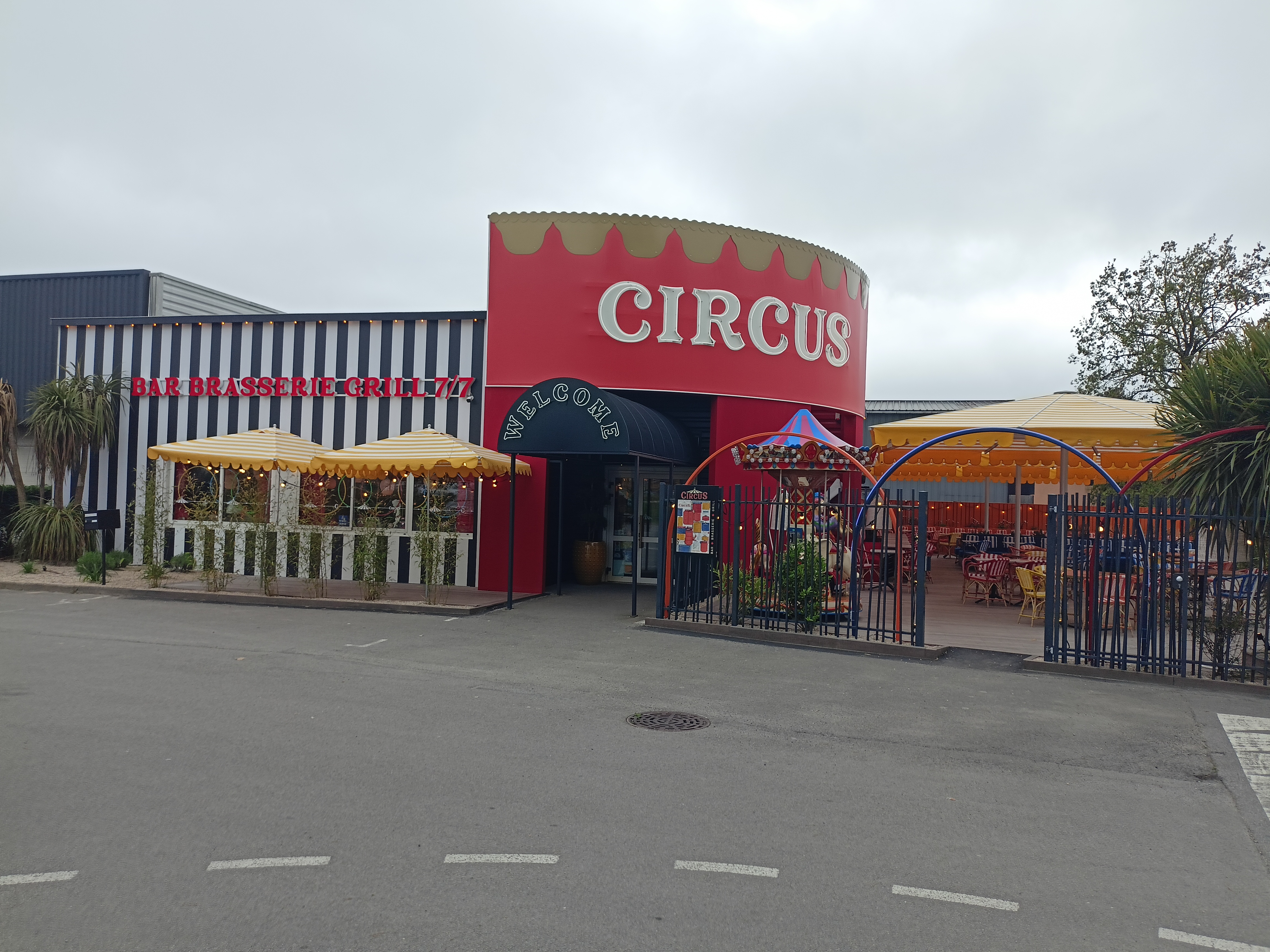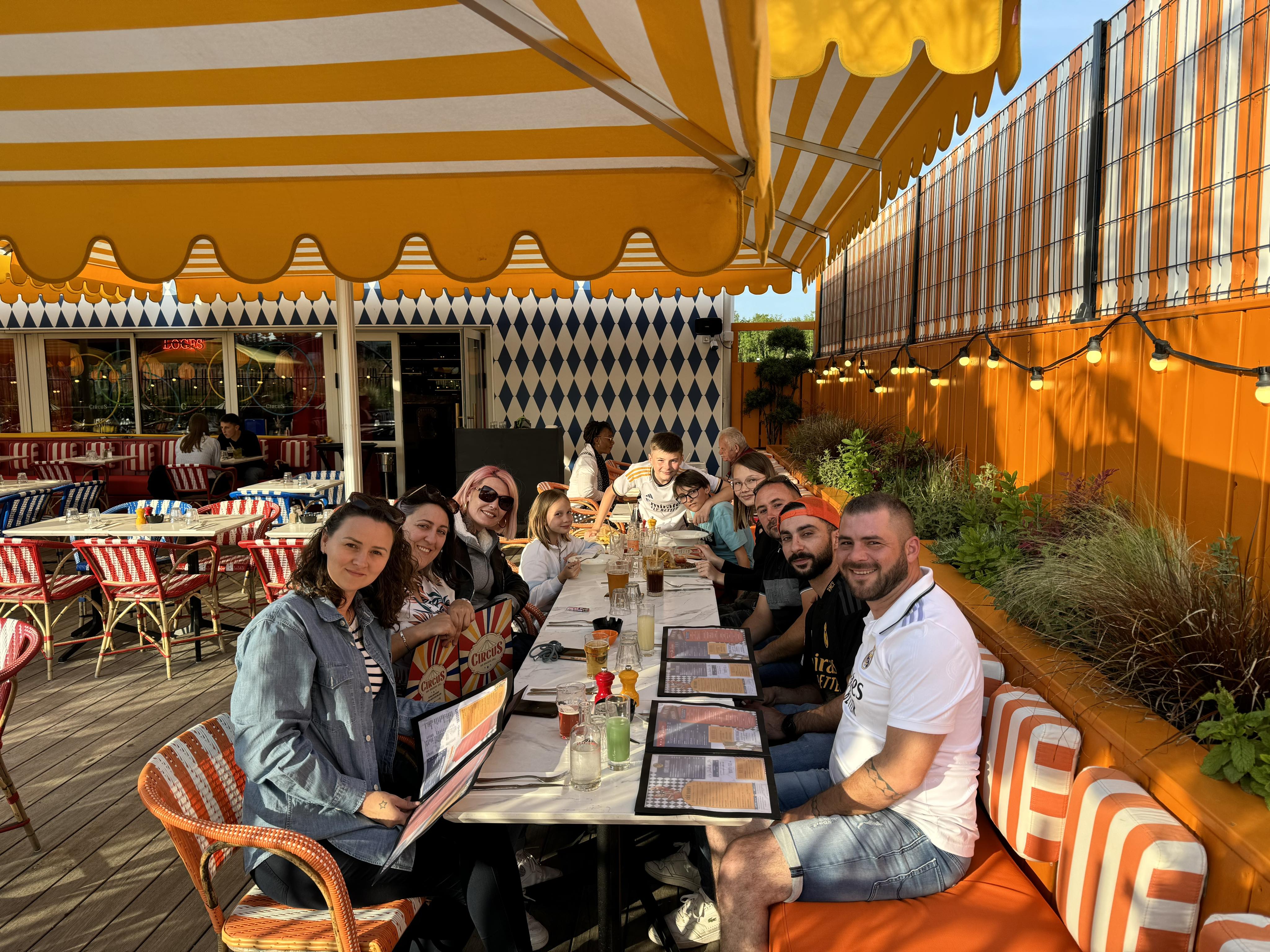 Nous sommes venus un dimanche midi. Nous avons été surpris par la cadre qui ressemble bien à un cirque (nous aurions mis une piste au centre avec le bar et la caisse pour appuyer encore plus le thème du cirque.... Nous avons profité de la grande terrasse extérieure qui accueille de grands groupes, pour manger tranquille on repasse. Les serveurs sont très gentils et souriants. Le service va vite, on attend très peu entre les plats. Les plats sont un peu chers mais c'est bon et copieux. Le menu enfant donne le droit à un jeton pour faire un tour de manège (tout petit).