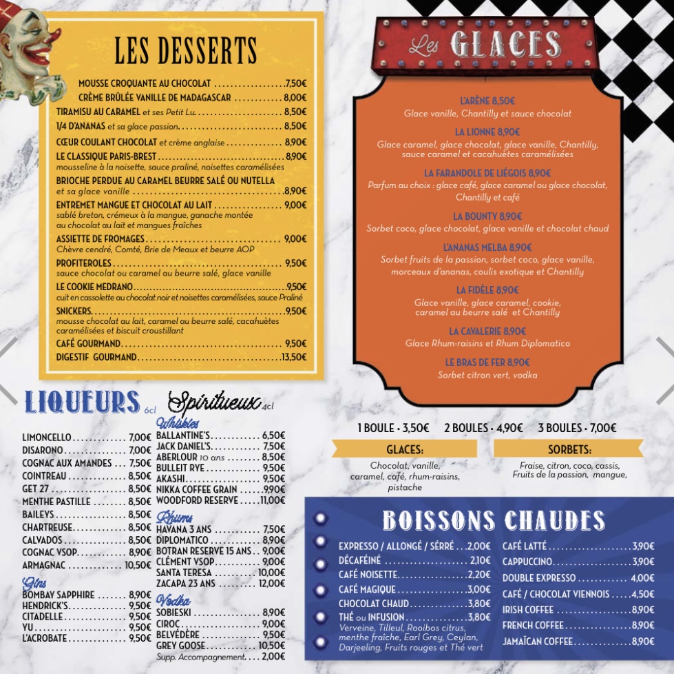 Cadre très agréable avec une décoration atypique sur le thème du cirque, ce qui n’est pas commun pour un restaurant. Concernant les plats, il y a de nombreux choix à la carte et les tarifs sont plutôt corrects. Je n’ai pris que le burger qui était bon même s’l manquait du fromage et de la sauce à mon goût (ce qui le rendait un peu sec). Je n’ai pas eu l’occasion de tester les desserts qui avait l’air délicieux, il faudra donc que je revienne !