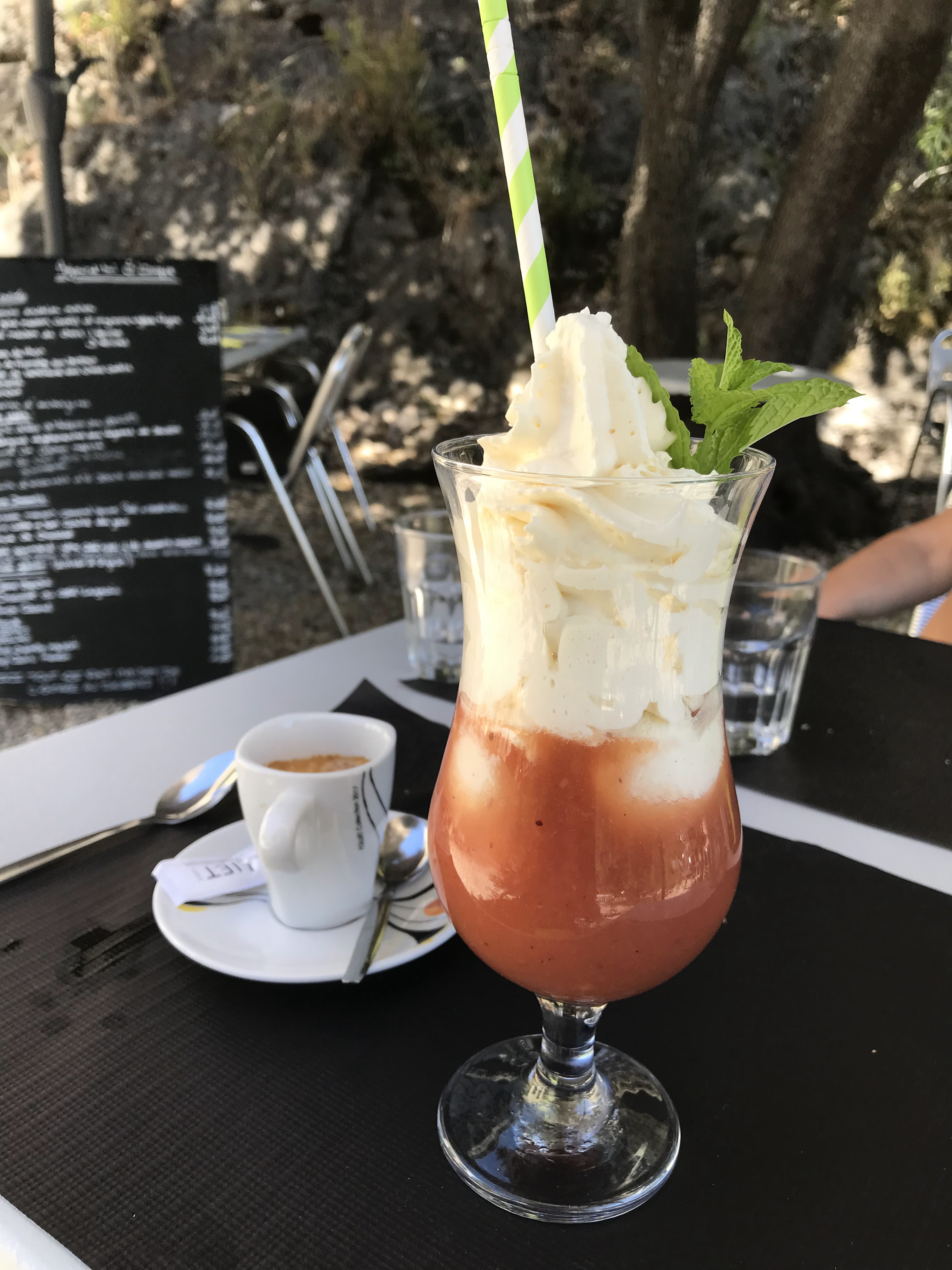 Pour résumer : prix du repas 30€ pour un prix que j'estime au grand maximum à 20€ (sans tenir compte de la qualité qui n'y est pas du tout). Pour ceux qui aiment le détail : Ici pas de menu du jour, tout est à la carte. Je commence par un crémant local délicieux, licoreux et sans bulles. Et avec mon verre ? ... Rien. A moins que je n'achète les petites préparations maison (3€ pièce ou 8€ les trois). Mon budget ne me permettant pas de gros écarts, je bois sans accompagnement. Pas d'entrée pour moi faute de budget. Plat de résistance, lasagne végétariennes. Servies dans un petit plat de 15x15cm sur 2 cm de hauteur. Mon 1,80m et mes 80kg me sussurent : c'est tout ?, Je les rassurent : Il y a quelques feuilles de salade ...😢. Des pâtes, quelques morceaux de tomate et beaucoup de fromage, le tout insipide. (15€) Là je suis très frustré et je me réfugie dans un classique qui me réconforte à coup sûr, d'autant qu'il est assemblé avec des produits d'artisans locaux : le café liégeois 😄 Enfin, je croyait que c'était une valeur sûre : une demi coupe de café avec une seule boule de glace surnageante. 🙄 Et la glace n'est pas fraîche (si on peut dire), de gros cristaux de glace d'eau témoignent d'un séjour prolongé au congel. C'est vraiment une catastrophe pour mes sens et mon portefeuille. 😕 Bon, le cadre est sympathique adossé à la roche, le long du chemin qui parcoure le cirque de Moureze. On est dehors sous l'ombrage fin des chênes du Sud. Le personnel est vraiment accueillant. Pour le reste ...