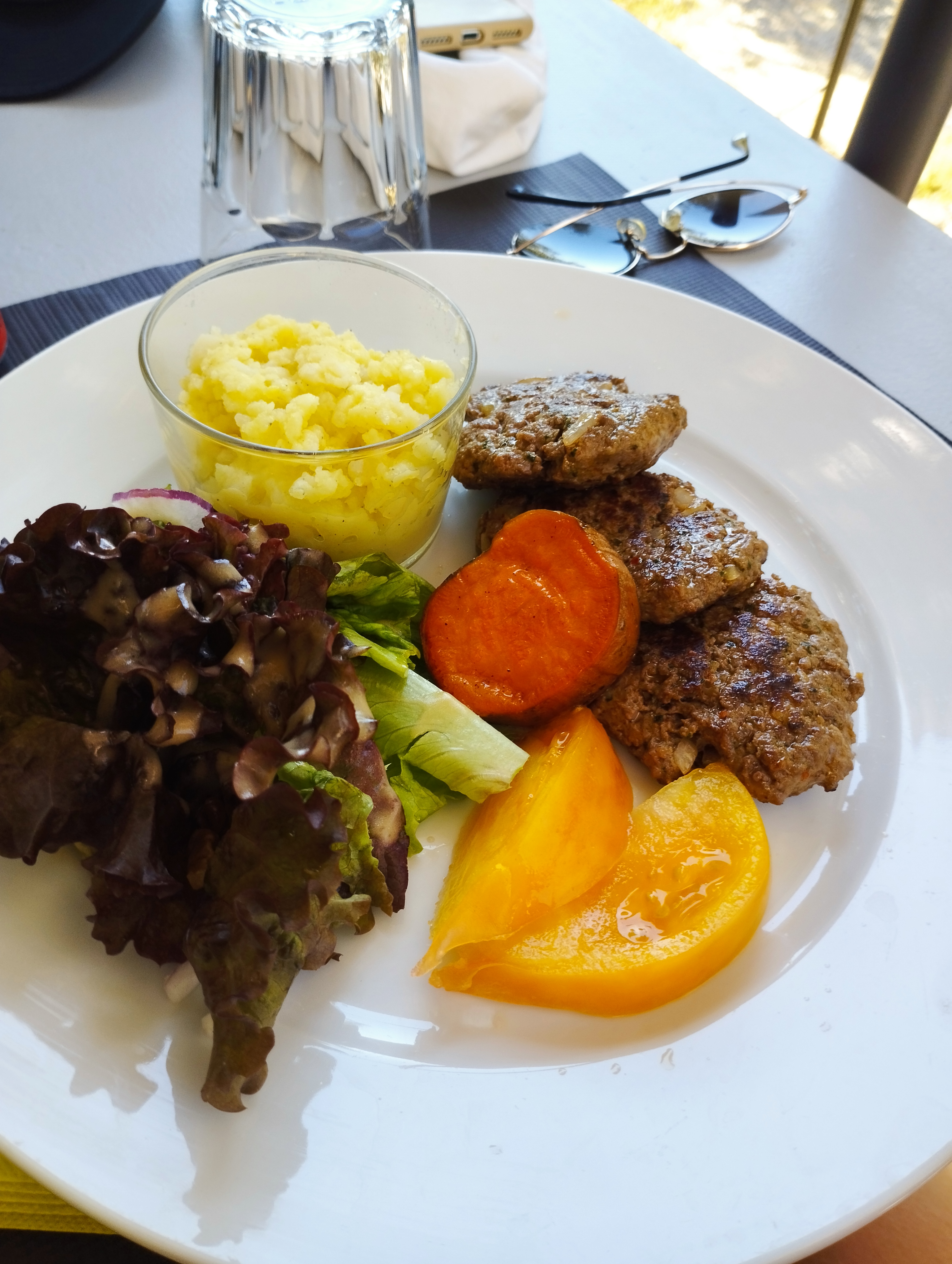 Nous avons pris ici un repas de midi adéquat composé d'Echin de Cochon (cou de porc tendre) et de veau à la semoule et aux abricots. L'emplacement extérieur à côté des rochers et des causses constituait un cadre charmant pour notre repas.