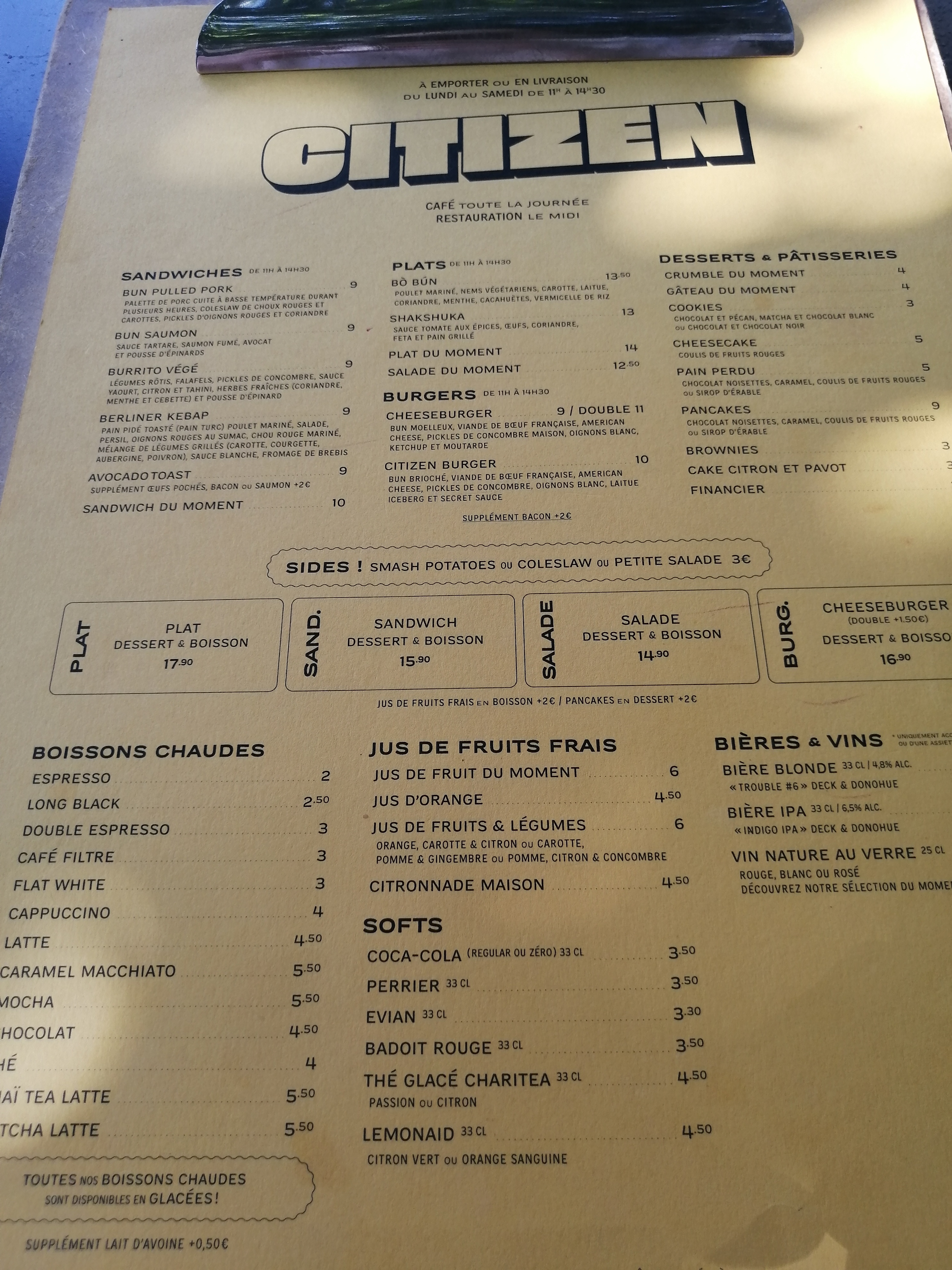 Très déçue Venue déguster un capuccino (excellent),je m'installe en terrasse, au bout de 10 min je vais à l'intérieur passer ma commande et là, surprise ! Ah mais on ne sert plus de café, juste à manger Étrange pour un endroit qui se nomme Ctizen Coffee 🤔et qui se veut accueillant et convi Ici, pas d'accueil, ni de convivialité même pas d'amabilite J'ai traversé la place