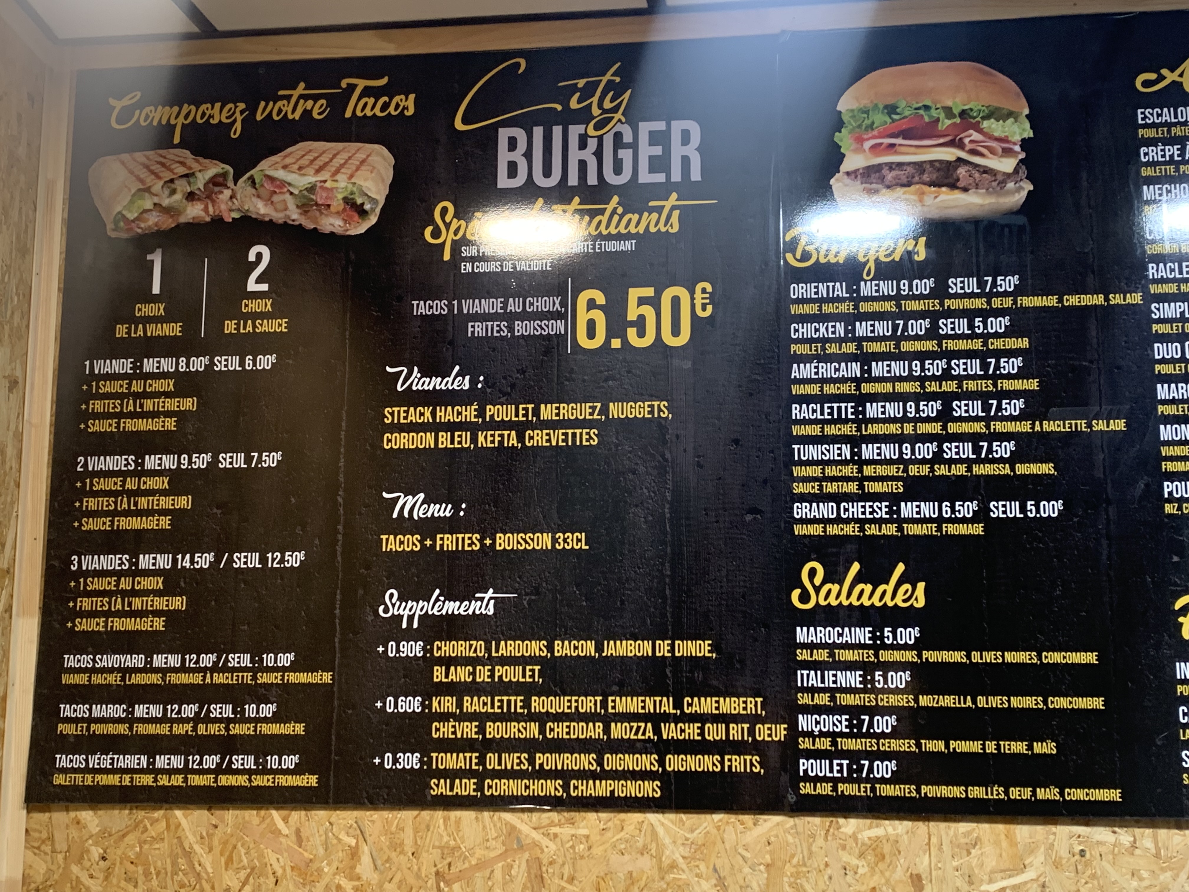 Allez chez City Burger le ventre vide pour encaisser leurs tacos, ils sont bons et bien garnis, le menu étudiant est très bien pour un super tarif.
