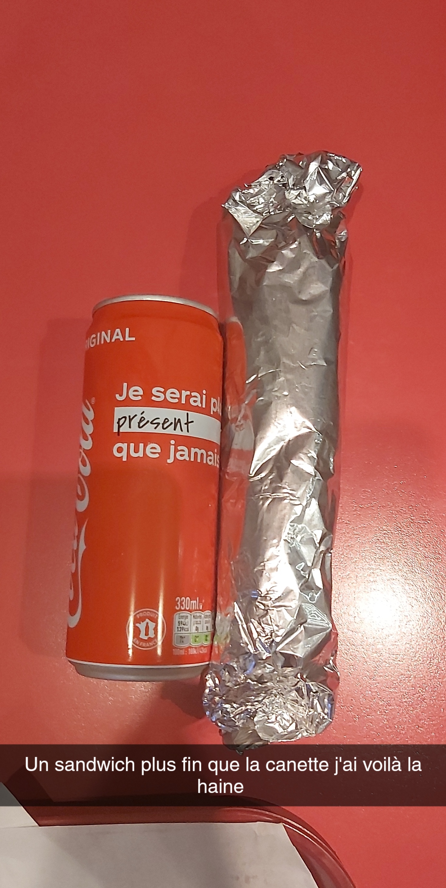 Bonsoir l'équipe CITY FOOD, Dans un premier temps je veut vous faire part de mon mécontentement extrême suite à votre manière de travailler pleins de poils sur les bras à un moment l'hygiène passe aussi par la peau. Dans un 2e temps je veut vous faire part de mon mécontentement extrême suite à la taille de vos sandwich qui sont juste RIDICULE. Oui oui, ridicule. Je respect le fait qu'il y ai de la main d'œuvre mais la elle est à chxer (pour rester polis), et en plus de ça comme vous pouvez le voir sur la photo vos sandwich sont plus fin que la canette de soda déjà affiné elle aussi. Dans un 3e temps, vous allez recevoir une lettre qui vous fera comprendre que KPO on le prend au sérieux surtout quand ça parle de viande. Bonne fin de continuation