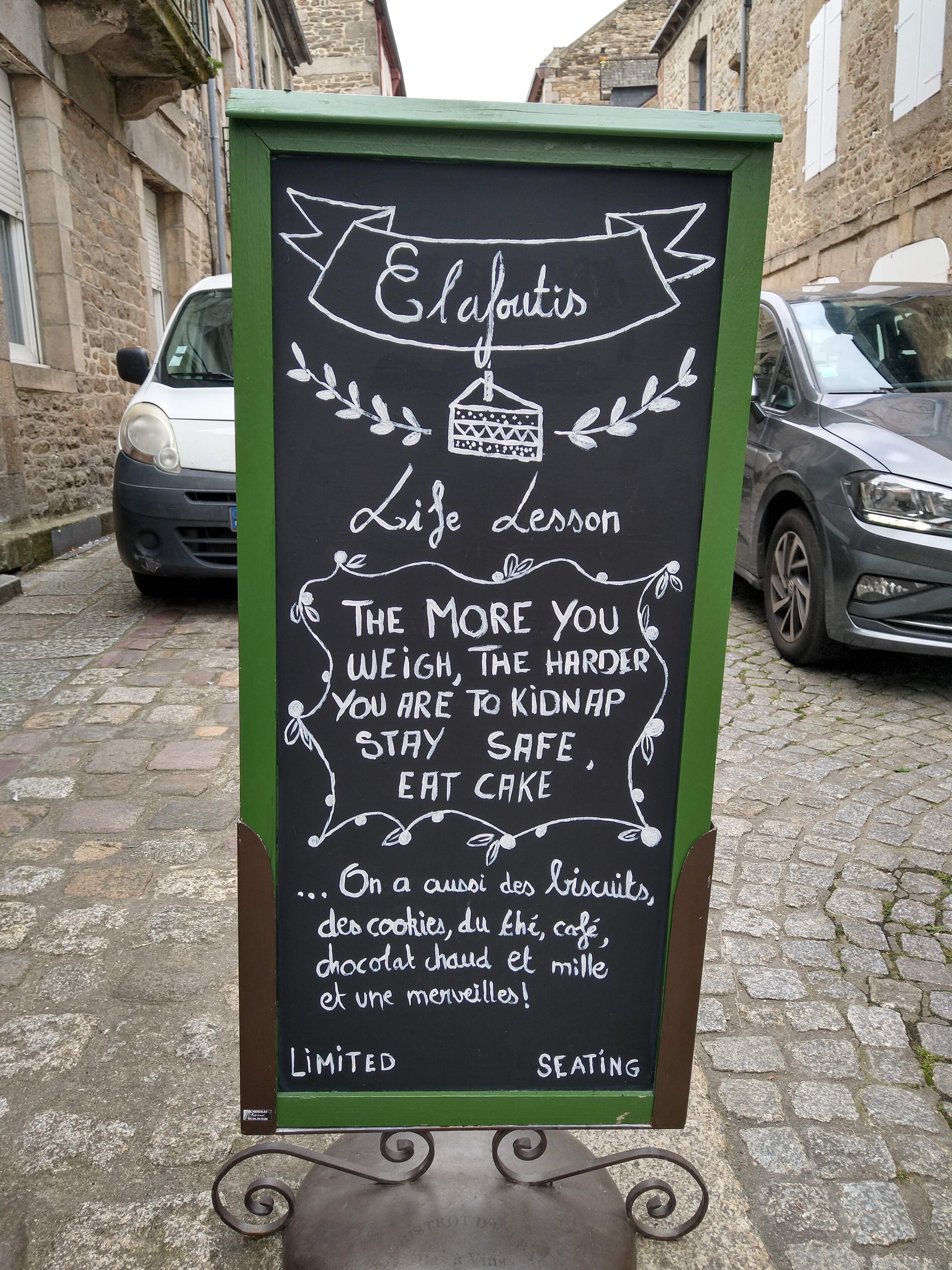 De passage à Dinan, j’ai déjeuné chez Clafoutis. Potage, tarte et far breton étaient exquis mais surtout frais – impeccable sur ce point. Délicieux café à piston (il est rare d’être servi comme ça : quel bonheur pour finir le repas). Doux moment et restaurant idéalement situé dans une rue loin de l’agitation touristique. Joli décoration.