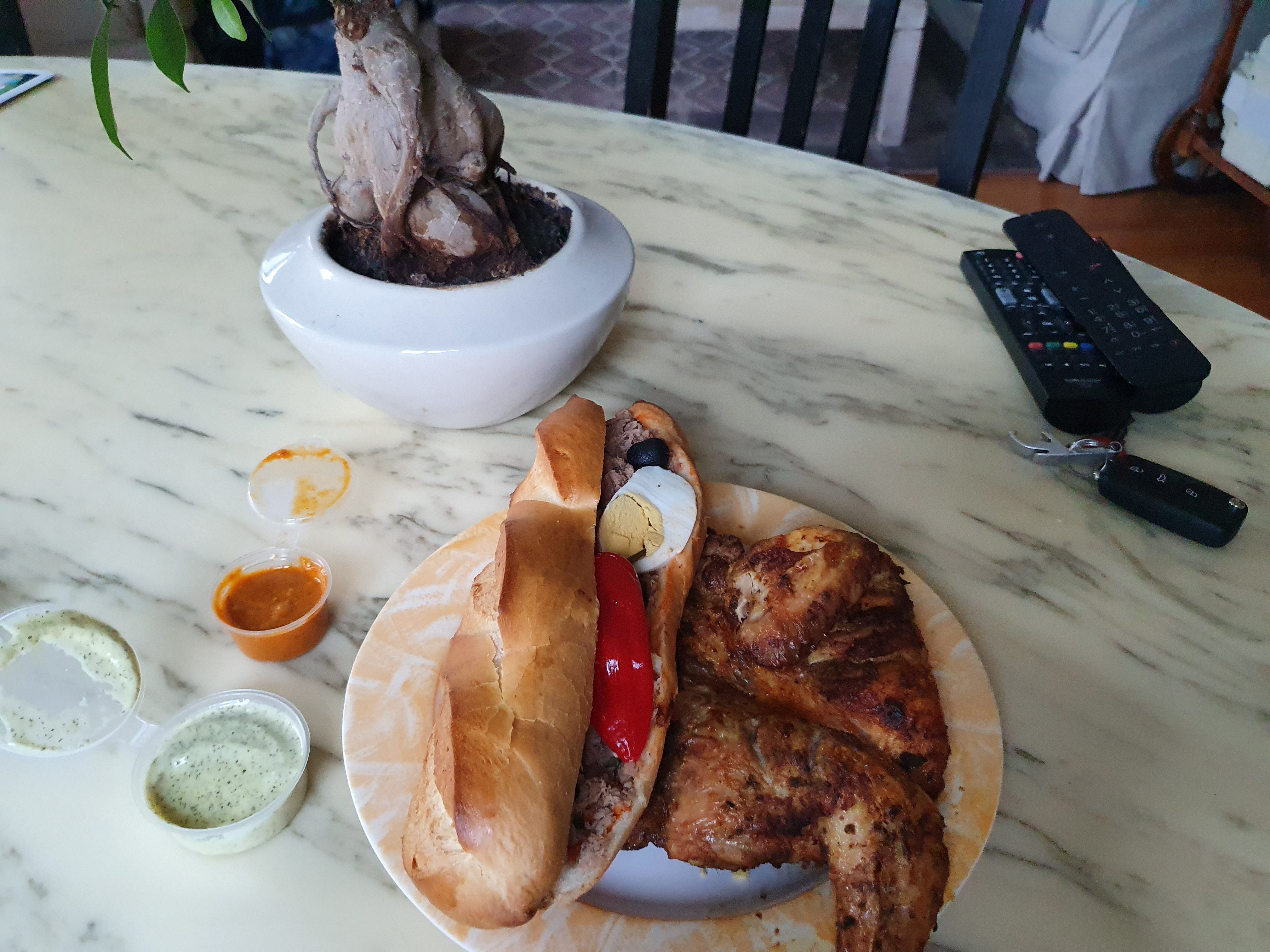 En livraison(matériel, tiens, poulet braisé).Plats généreux, trop bon , excellent. Cuisson parfaite du poulet .merci. je recommande