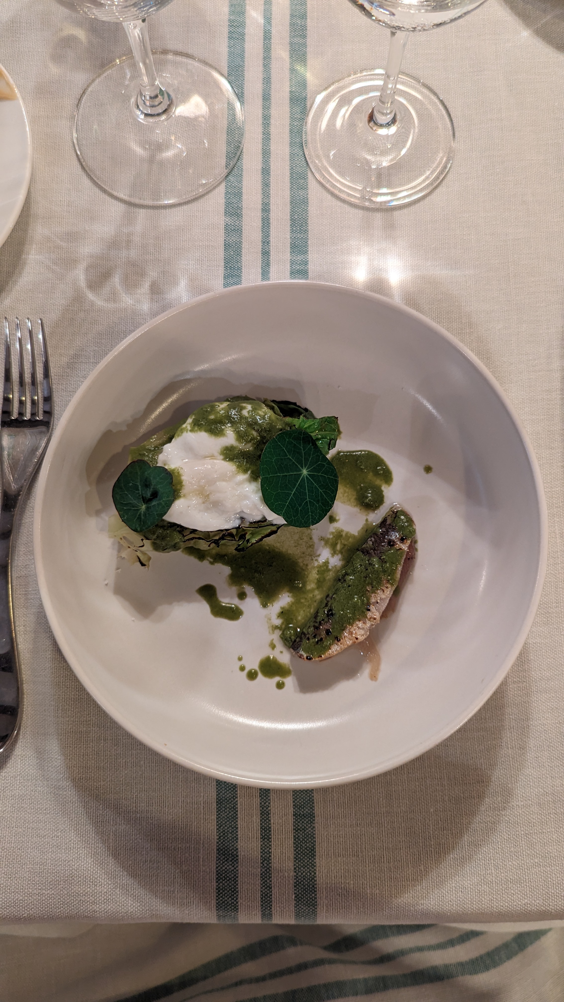 La cuisine est certes de qualité, ainsi que la playlist, mais beaucoup d'inconvénients minorent mon appréciation : a) Menu unique le midi. Mieux vaut s'informer avant de venir, surtout si vous avez des restrictions alimentaires : c'est viande ou poisson, pas le choix... Ça ne facilite pas les accords mets - vins. A noter d'ailleurs qu'ils sont assez chers, même pour les breuvages locaux... b) Il faut compter 2 heures pour un déjeuner, alors que seulement 15 clients sont présents. Prévoyez des sujets de conversation avec votre convive ! c) L'entrée et le poisson étaient servis dans des bols. C'est un concept... d) Le café est extrêmement amer. A tenter en soirée, car les propositions culinaires semblent plus diversifiées et l'artisan culinaire est quand même doué...