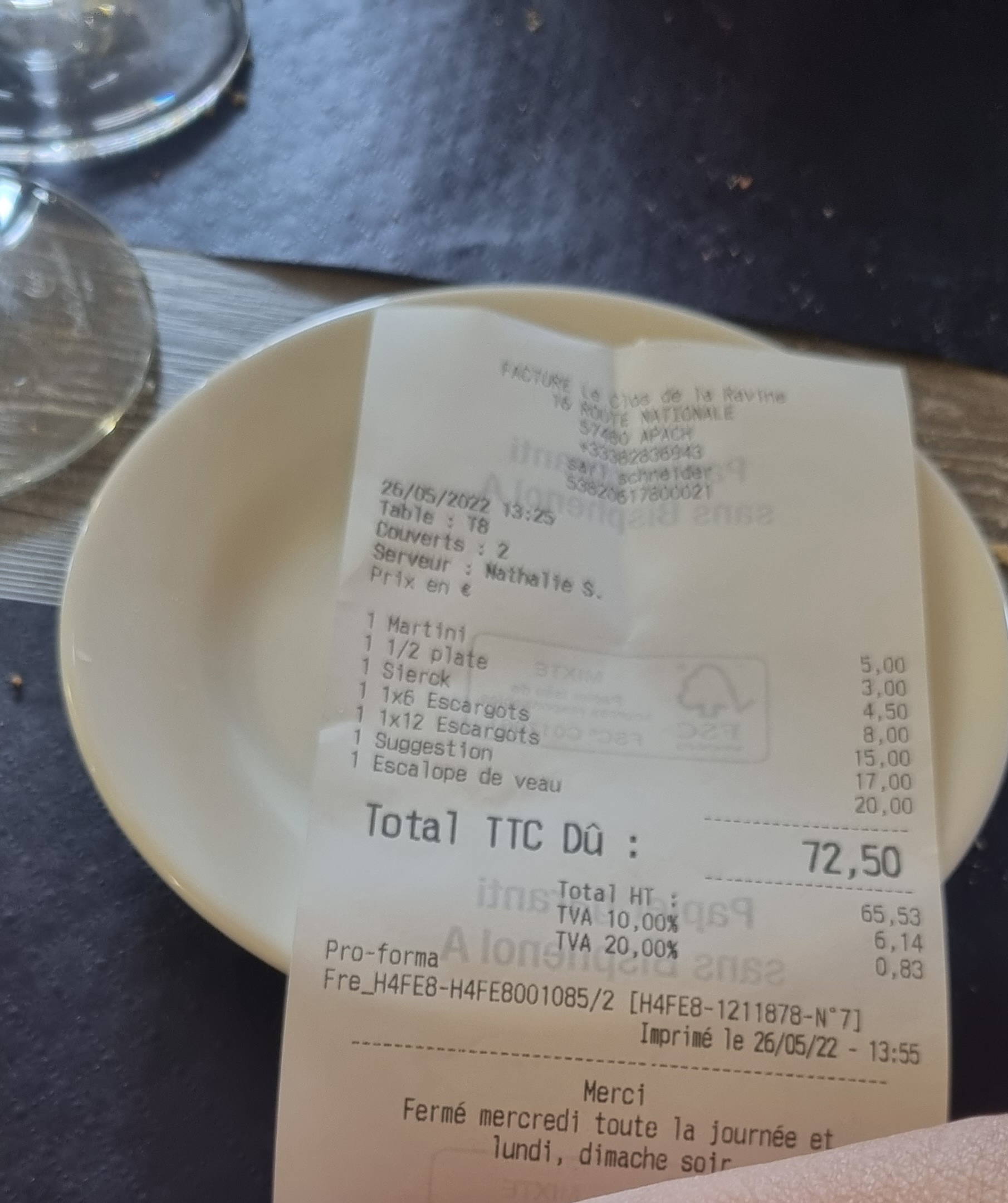 Très bonne cuisine ! Des plats traditionnels avec souvent une touche personnelle, très bien cuisinés C'est très bon On est loin du chi-chi prétentieux de certains gastro, et c'est tant mieux Au clos de la Ravine, le principal, c'est le plat pas la présentation fumeuse : bravo ! Cependant, de gros efforts sont à faire sur la carte des vins svp La carte des vins est peu étoffée, et les choix ne sont pas judicieux. J'aimerais trouver d'autres vins de la Moselle française, de la région, par exemple. Ce qui est proposé du domaine de Contz n'est pas le meilleur choix. Dans l'ensemble l'offre des vin blancs est pauvre (dommage la carte s'y prette aisément). Service agréable, un peu long certes, mais tout à fait correct. Prix en rapport avec la qualité de la cuisine. Au final c'est meilleur, donc moins cher que d'autres établissements aux alentours (à Sierck les bains, par exemple ...).