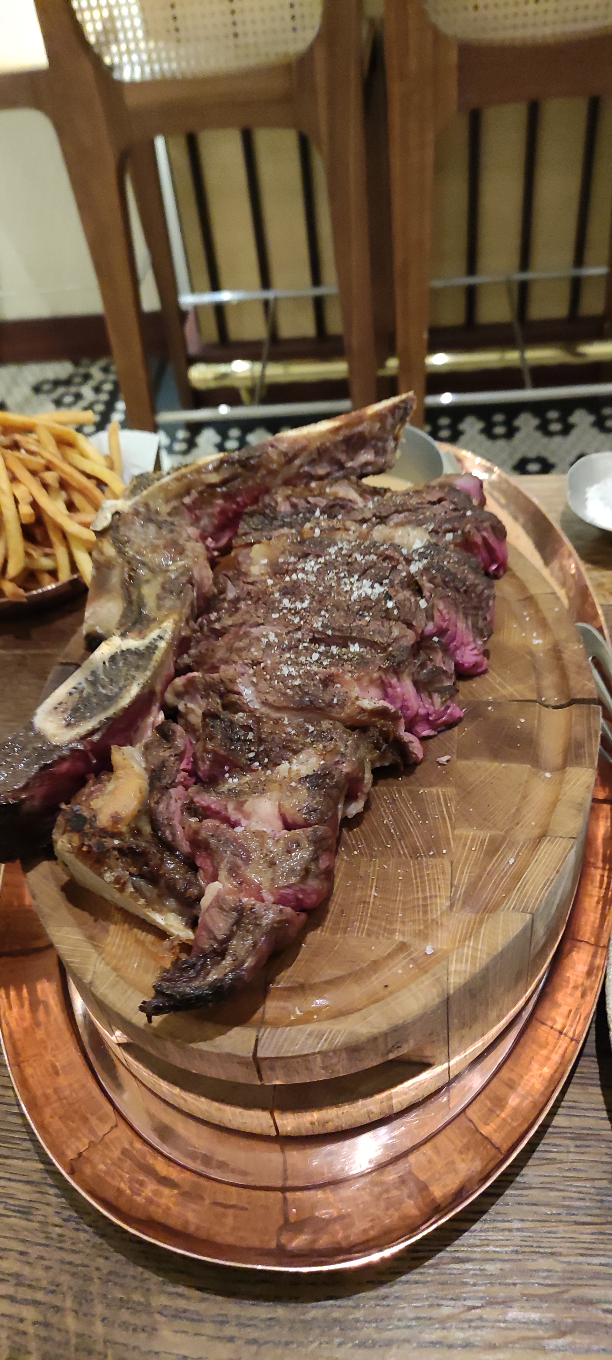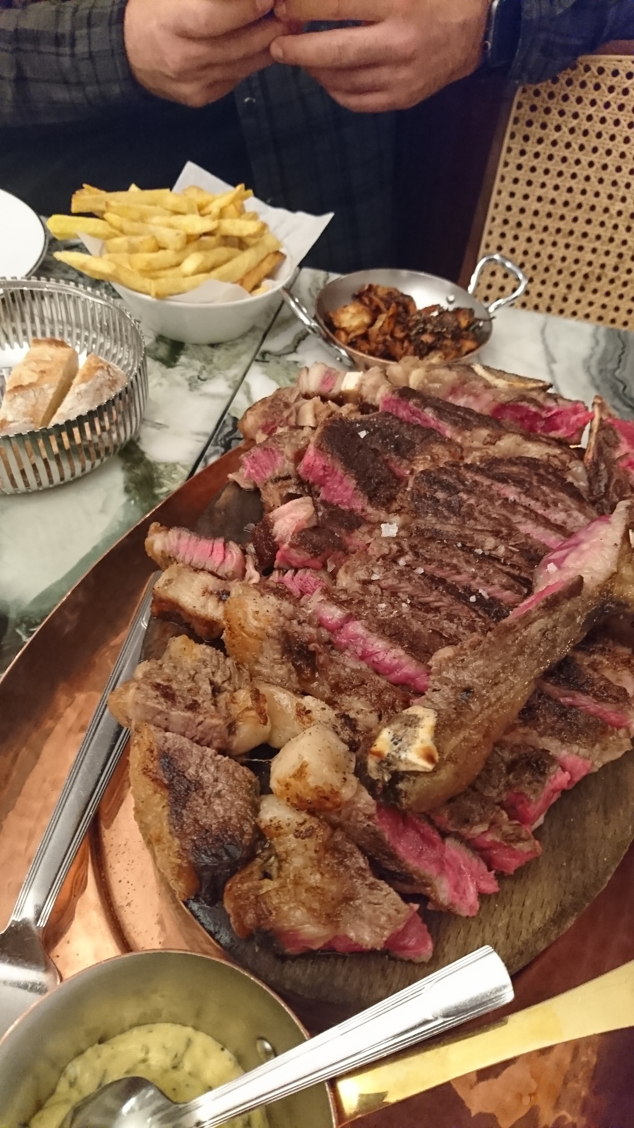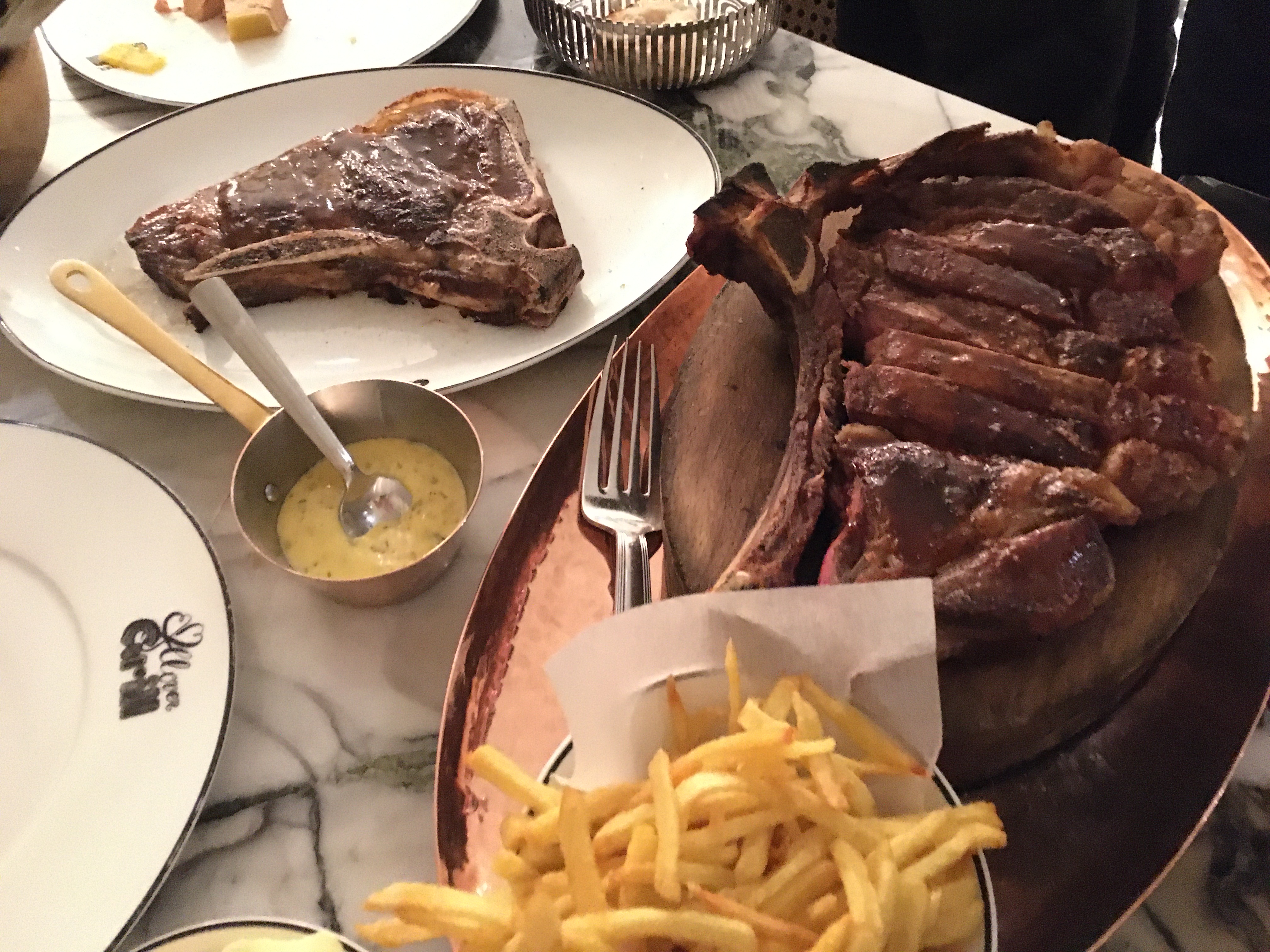 Nous avons commandé 2 côtes de bœuf (Simmental et Creekstone), la cuisson saignante était respectée et la viande était bonne mais pas exceptionnelle au vu du prix… nous avons reçu les 2 côtes en même temps et on nous a conseillé de commencer par la Creekstone, malheureusement le temps qu’on finisse la première, la 2ème avait refroidi. Les accompagnements auraient pu être plus généreux (2 petits bols de frites et 2 assiettes contenant 2 cuillerées de purée). Idem pour les sauces qui auraient pu être plus généreuses. Le service n’était pas à la hauteur, il y a eu beaucoup d’attente (entre le moment où nous sommes entrés dans l’établissement et l’installation, le moment où nous avons reçu la carte et les explications et la commande) et nous avons du demander la carte des vins car nous ne l’avions pas reçue avec la carte des plats. Cependant, le serveur que nous avons eu nous a bien conseillé en vins. Nous avons pris des churros à la sauce chocolat en dessert, une assiette aurait été appréciée pour éviter que le chocolat fondu ne goutte partout sur la table. Au vu du prix un 3ème beignet aurait été apprécié. C’était bon mais encore une fois rien d’exceptionnel qui justifie les tarifs.