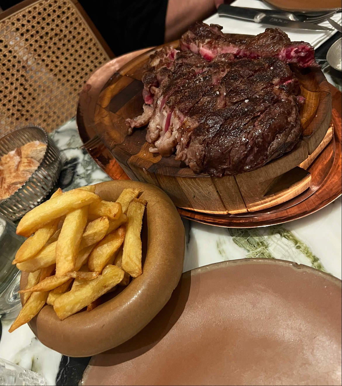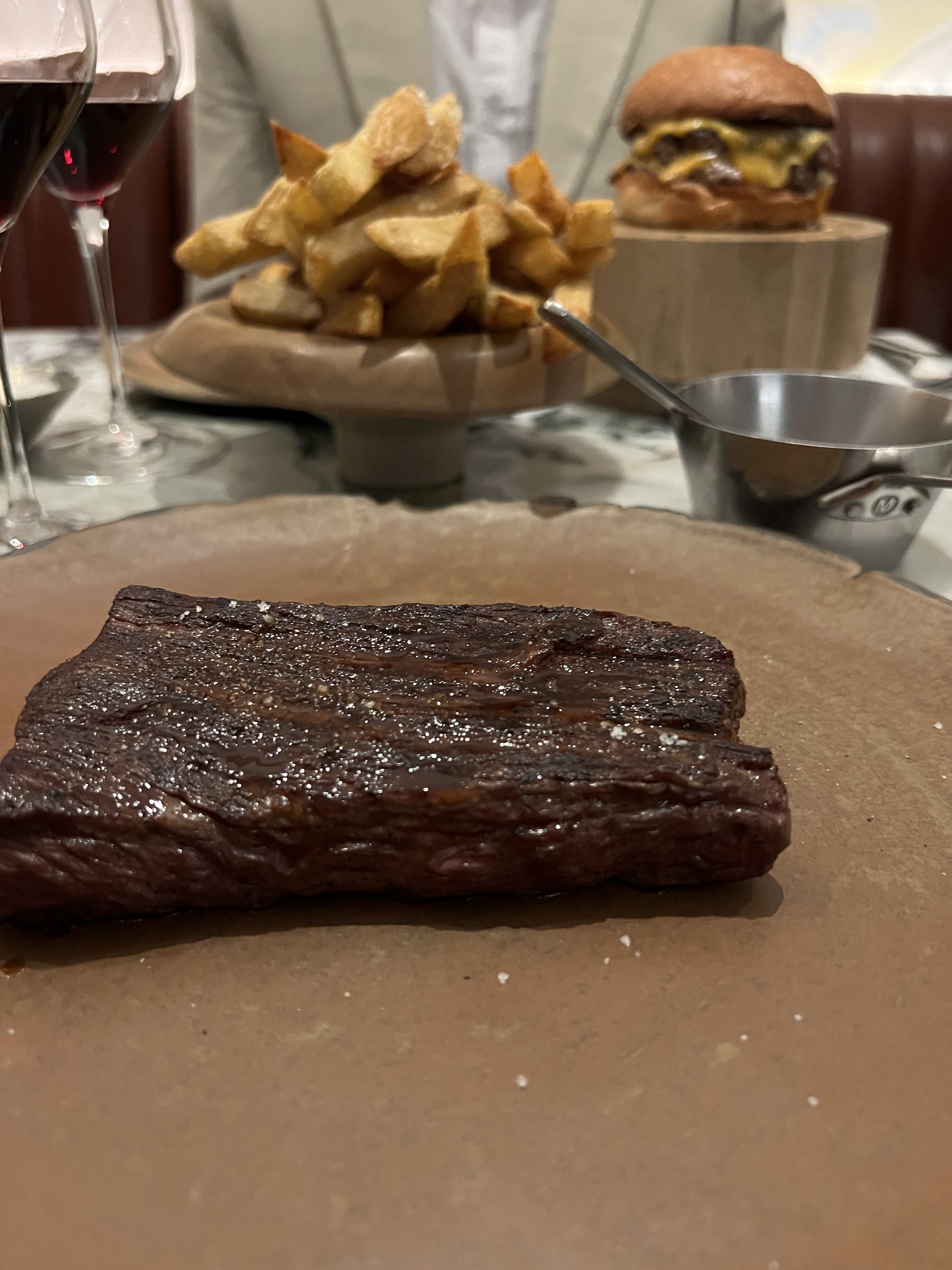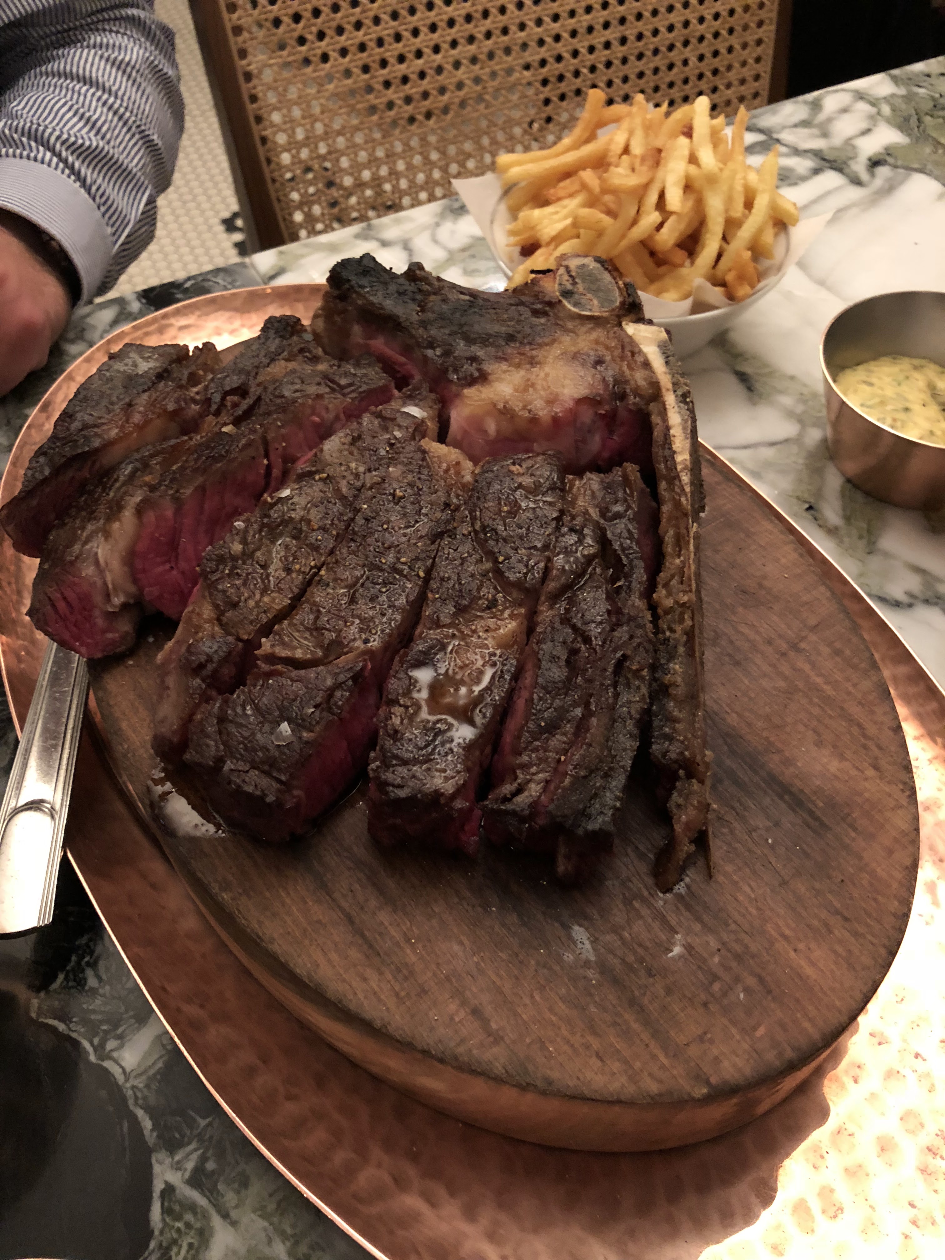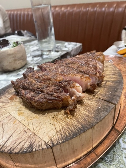 Nous avons commandé 2 côtes de bœuf (Simmental et Creekstone), la cuisson saignante était respectée et la viande était bonne mais pas exceptionnelle au vu du prix… nous avons reçu les 2 côtes en même temps et on nous a conseillé de commencer par la Creekstone, malheureusement le temps qu’on finisse la première, la 2ème avait refroidi. Les accompagnements auraient pu être plus généreux (2 petits bols de frites et 2 assiettes contenant 2 cuillerées de purée). Idem pour les sauces qui auraient pu être plus généreuses. Le service n’était pas à la hauteur, il y a eu beaucoup d’attente (entre le moment où nous sommes entrés dans l’établissement et l’installation, le moment où nous avons reçu la carte et les explications et la commande) et nous avons du demander la carte des vins car nous ne l’avions pas reçue avec la carte des plats. Cependant, le serveur que nous avons eu nous a bien conseillé en vins. Nous avons pris des churros à la sauce chocolat en dessert, une assiette aurait été appréciée pour éviter que le chocolat fondu ne goutte partout sur la table. Au vu du prix un 3ème beignet aurait été apprécié. C’était bon mais encore une fois rien d’exceptionnel qui justifie les tarifs.