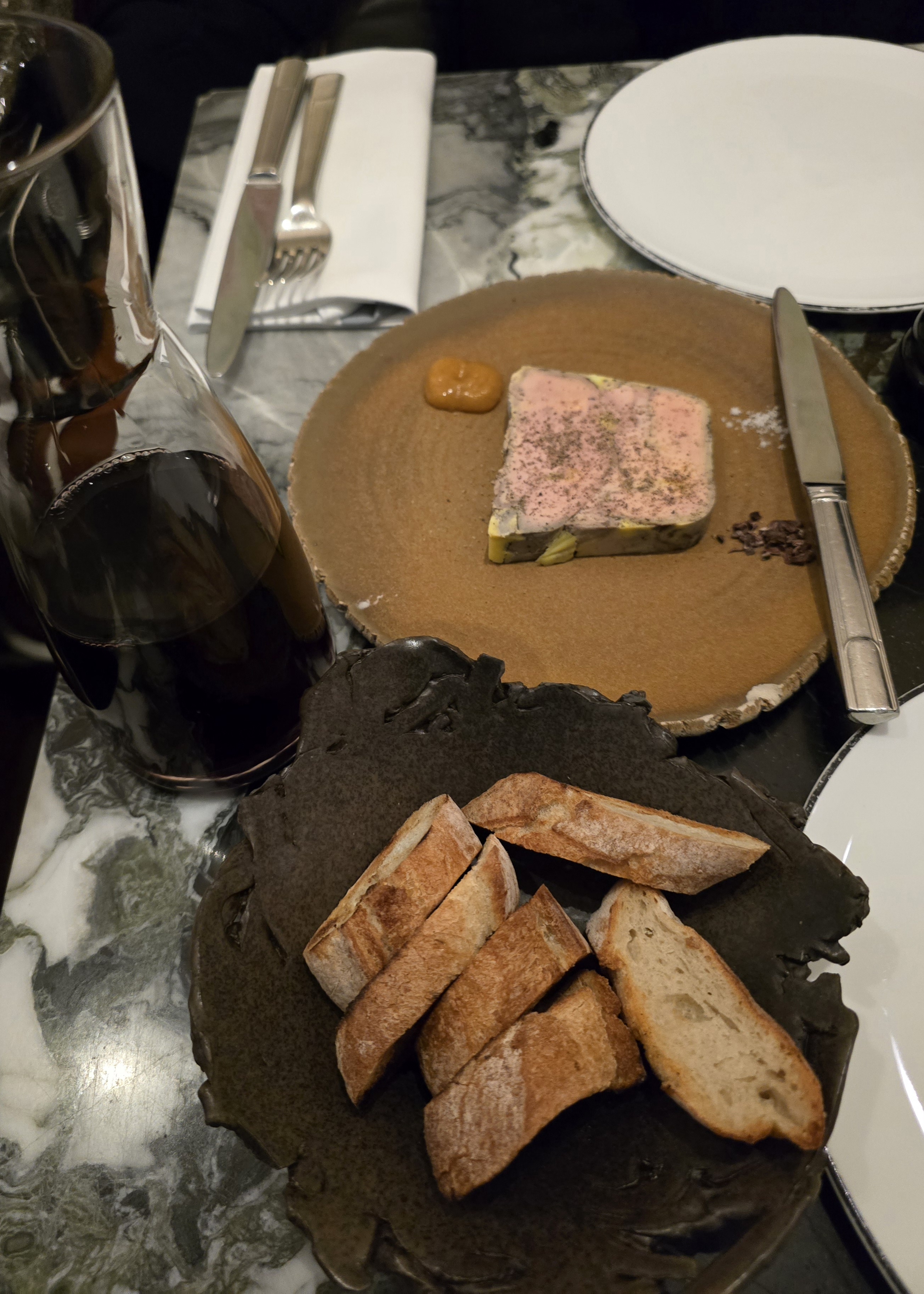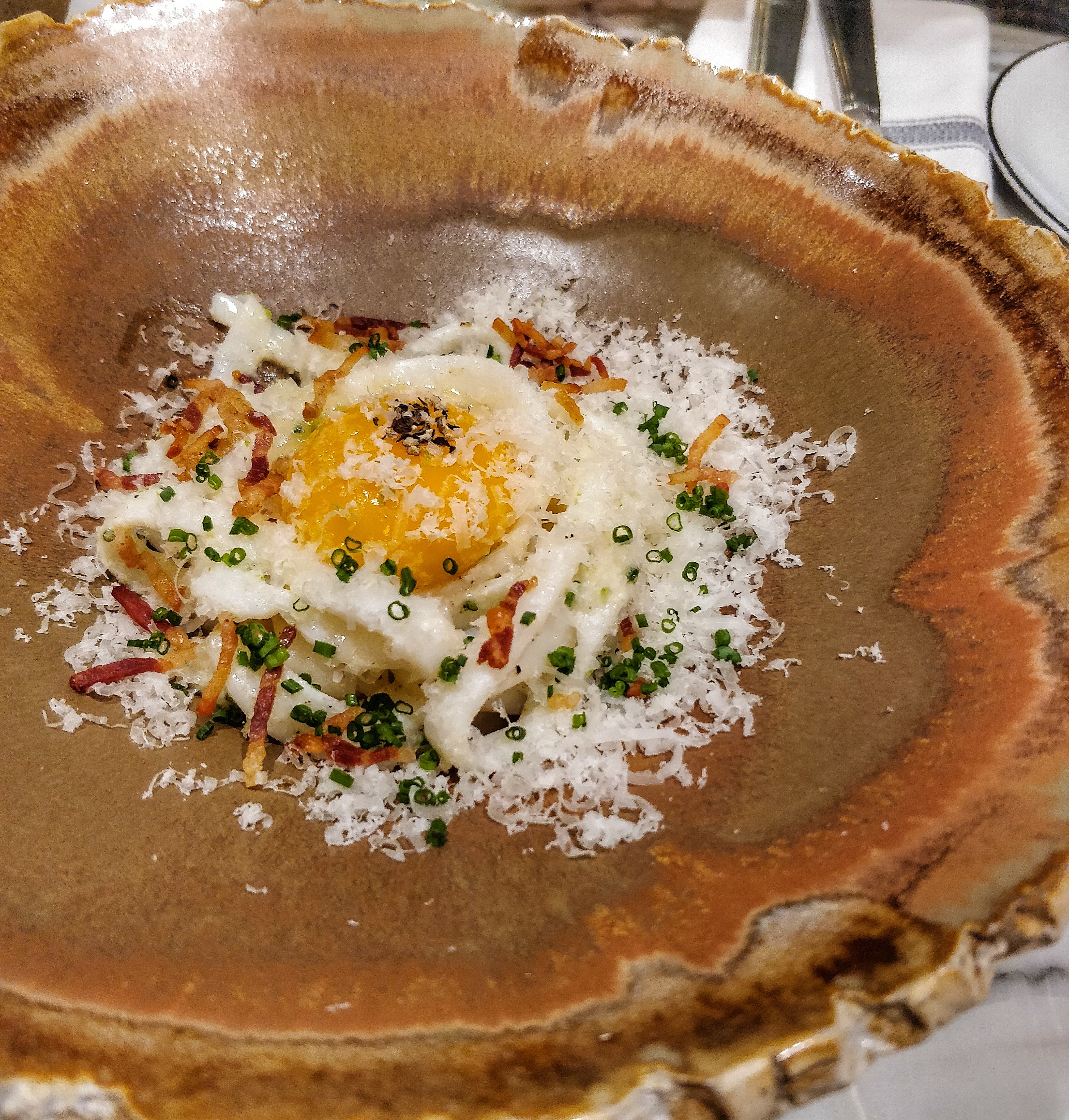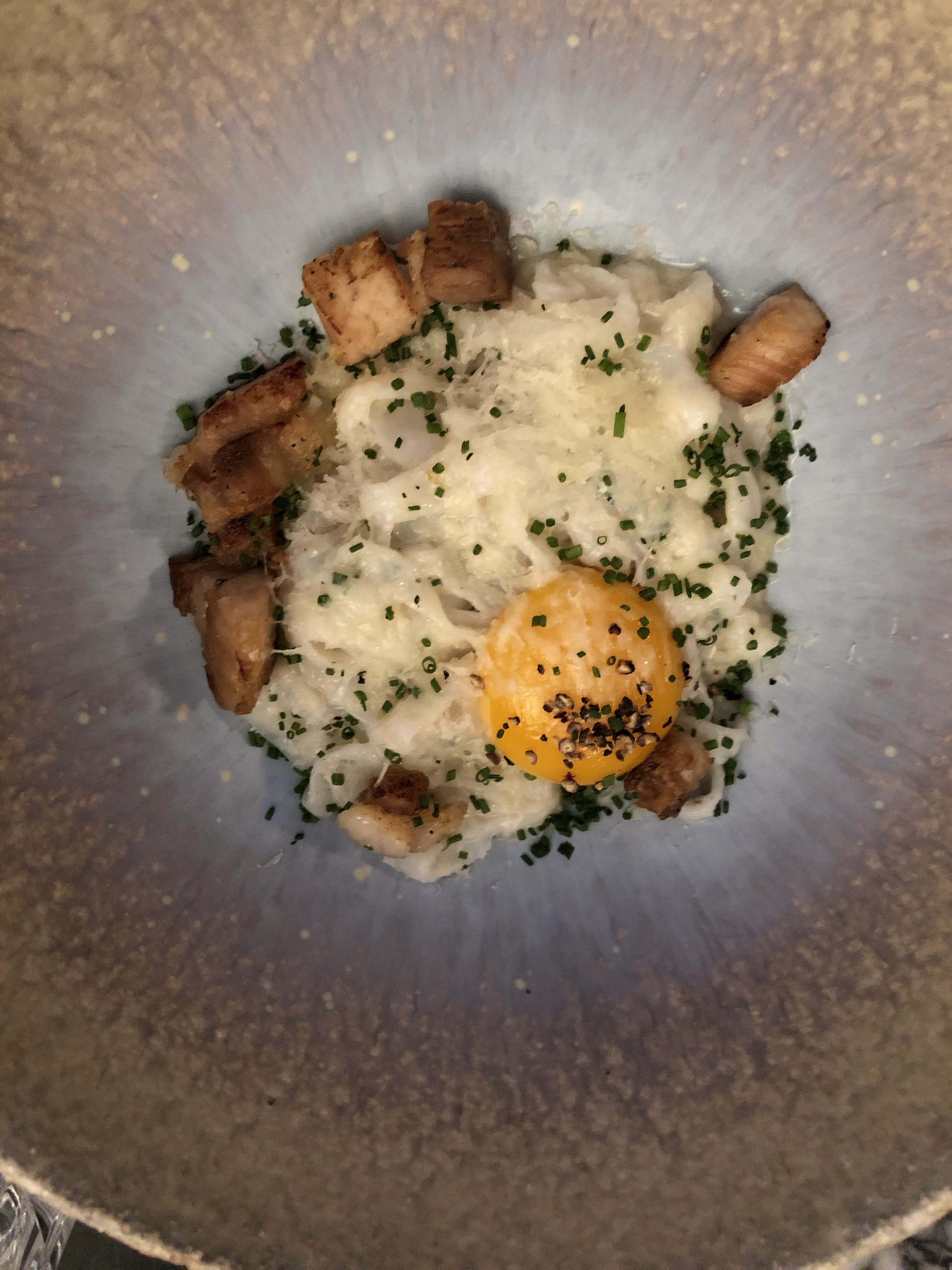 La Carbonara est la meilleure chose que nous ayons eue, absolument délicieuse. J'y retournerais juste pour ça. Tout le reste que nous avions ne valait pas son prix. Le service était peu attentionné, ce à quoi je ne m'attendais pas d'un restaurant qui semble se positionner comme étant haut de gamme. Nous sommes allés à Lesserre la veille et le contraste dans le service était saisissant. Outre la carbonara, les accompagnements et les sauces étaient corrects, corrects mais encore une fois chers. Nous avons eu la coupe de steak forêt noire pour 2 personnes, et c'était le pire steak que j'ai mangé depuis des lustres, dur, trop de tendon et difficile à mâcher. Lorsque vous payez au gramme, je m'attendrais à un excellent steak, nous avons mangé peut-être la moitié du poids total. Notre vin était trop froid et on nous a également dit qu'il serait bien meilleur à l'ouverture, puis on ne nous a pas proposé de carafe alors qu'une autre table l'a fait ? Cela n'avait pas beaucoup de sens. C’est une expérience qui me conviendrait à 100 $ le repas, et non à 500 $. Je ne recommanderais pas ce restaurant à part revenir pour la carbonara, qui est en fait très unique et délicieuse.