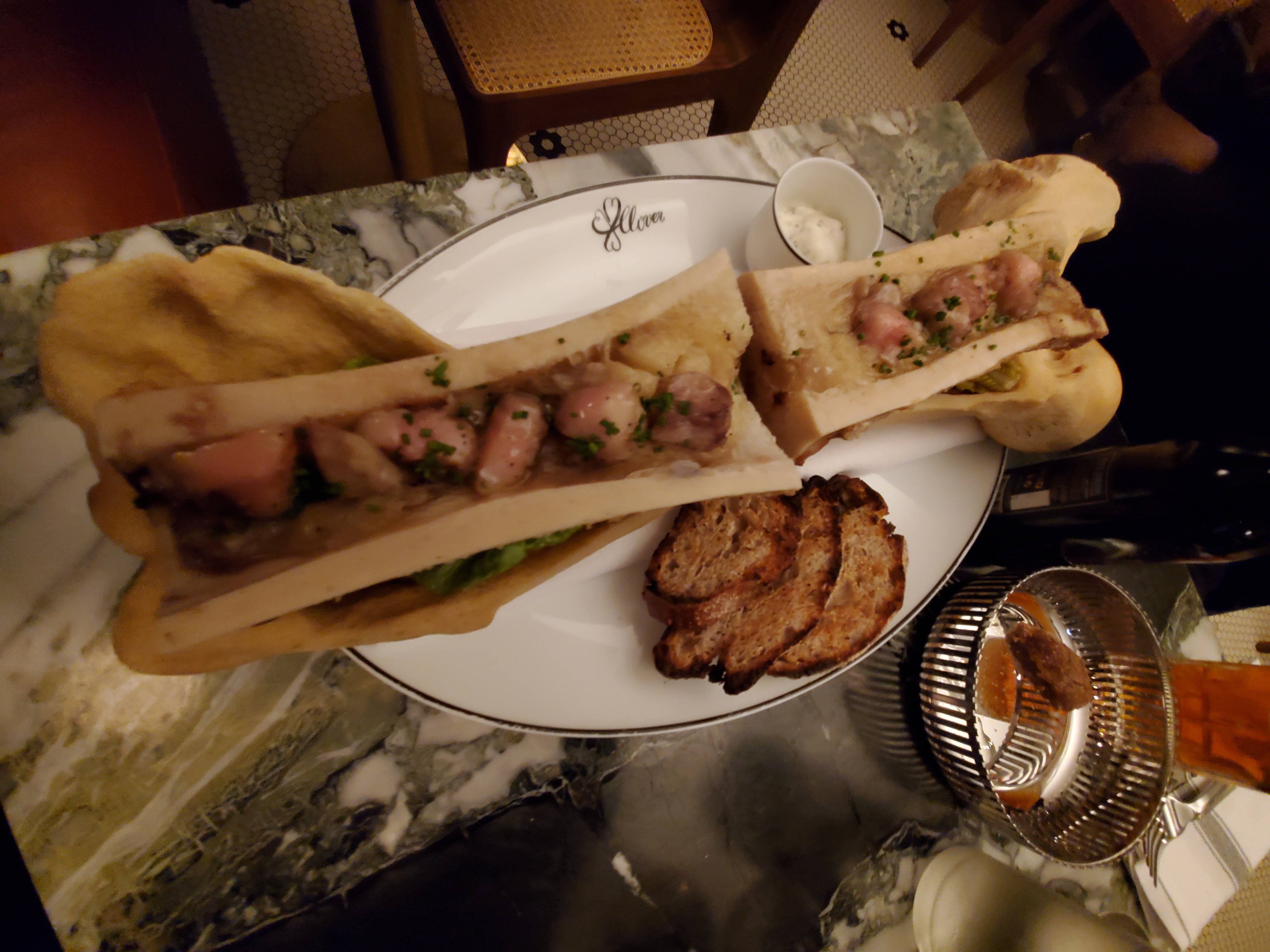 Non pas que je commande beaucoup de Chateaubriand (je reçois habituellement des filets de bouillon) mais celui-ci était absolument divin. C'était 450 g pour deux personnes et j'ai dû commander un hamburger après car j'avais encore faim mais j'ai généralement un gros appétit pour les dîners de steak. Dans l'ensemble, c'était un excellent restaurant. Ils nous ont demandé de prendre des desserts au bar car ils avaient une urgence et avaient besoin de la table et nous ont offert un digestif en compensation du fait que je leur ai fait en faire deux au lieu d'un (j'en ai d'abord demandé 3 par personne pour une demi-blague). Ils ont d'abord mis le deuxième digestif sur l'addition mais je les ai convaincus de le supprimer.