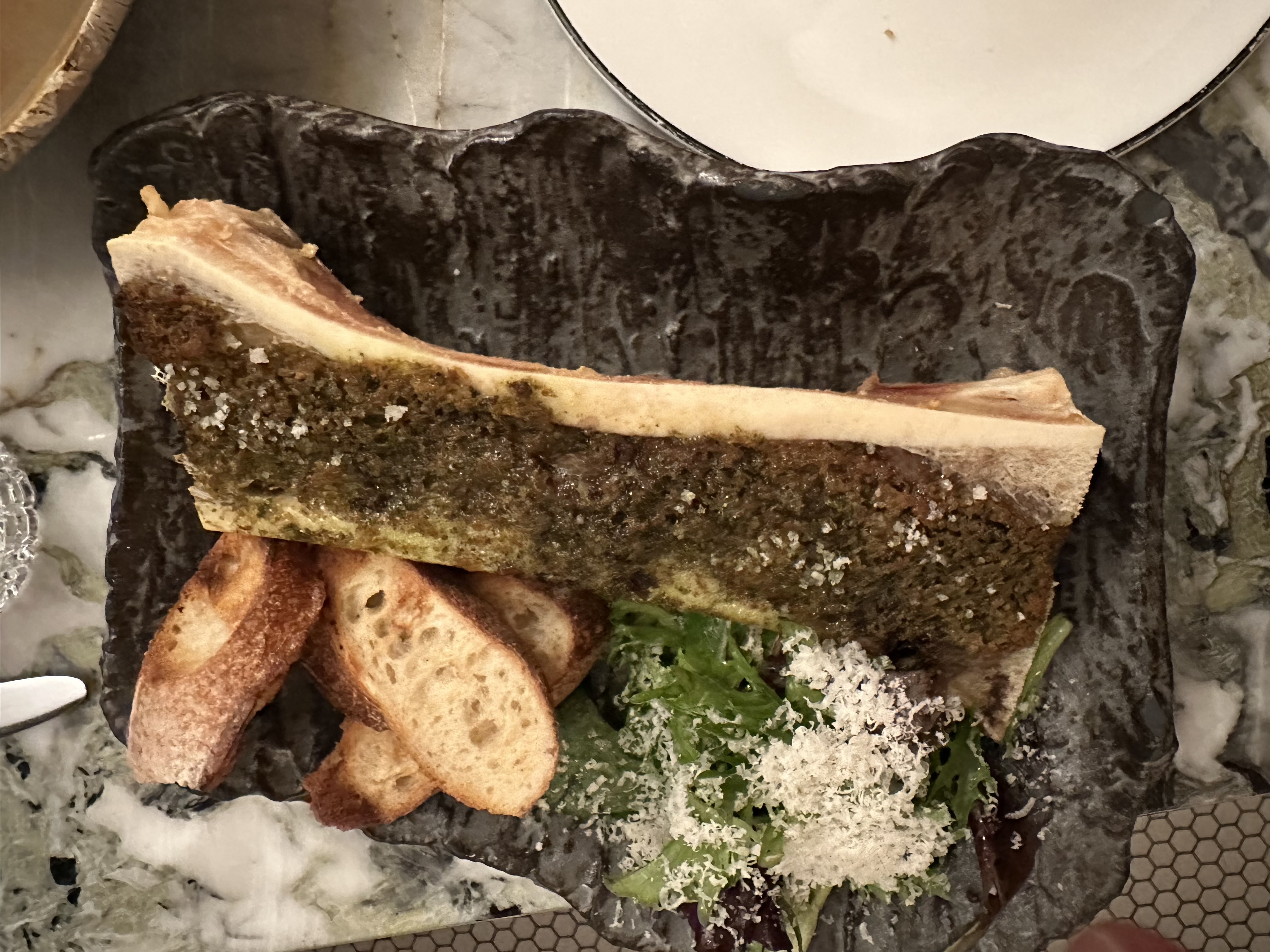 Jean-François Piège... A touristes. Nous sommes allés dans ce restaurant pour les 40 ans de ma femme. Nous avons compris en arrivant que c'était une arnaque. L'accueil d'abord, la salle est bruyante comme une brasserie au coup de feu. Nous avons demandé à changer de place et nous sommes retrouvés dans un endroit où l'ont s'entendait parler mais à 50cm de nos voisins... Les entrées étaient à peine correctes, un poireau braisé, un peu brûlé, des croûtons de pain qui accompagnent un os à moelle brûlés également (cf photo). La viande était bonne mais à ce prix... La tarification est incompréhensible avec un prix aux 100 grammes. La côte de bœuf de tout juste 900 grammes (dont pas mal de gras) a été facturée 171€. Sur le vin, des coefficients justes délirants sont appliqués. L'eau plate est également facturée. Bref, si vous êtes touristes et avez n peu de moyen, allez y pour le prestige si vous êtes des locaux, il y a des tonnes d'adresses meilleures et moins chères. Aucun intérêt.
