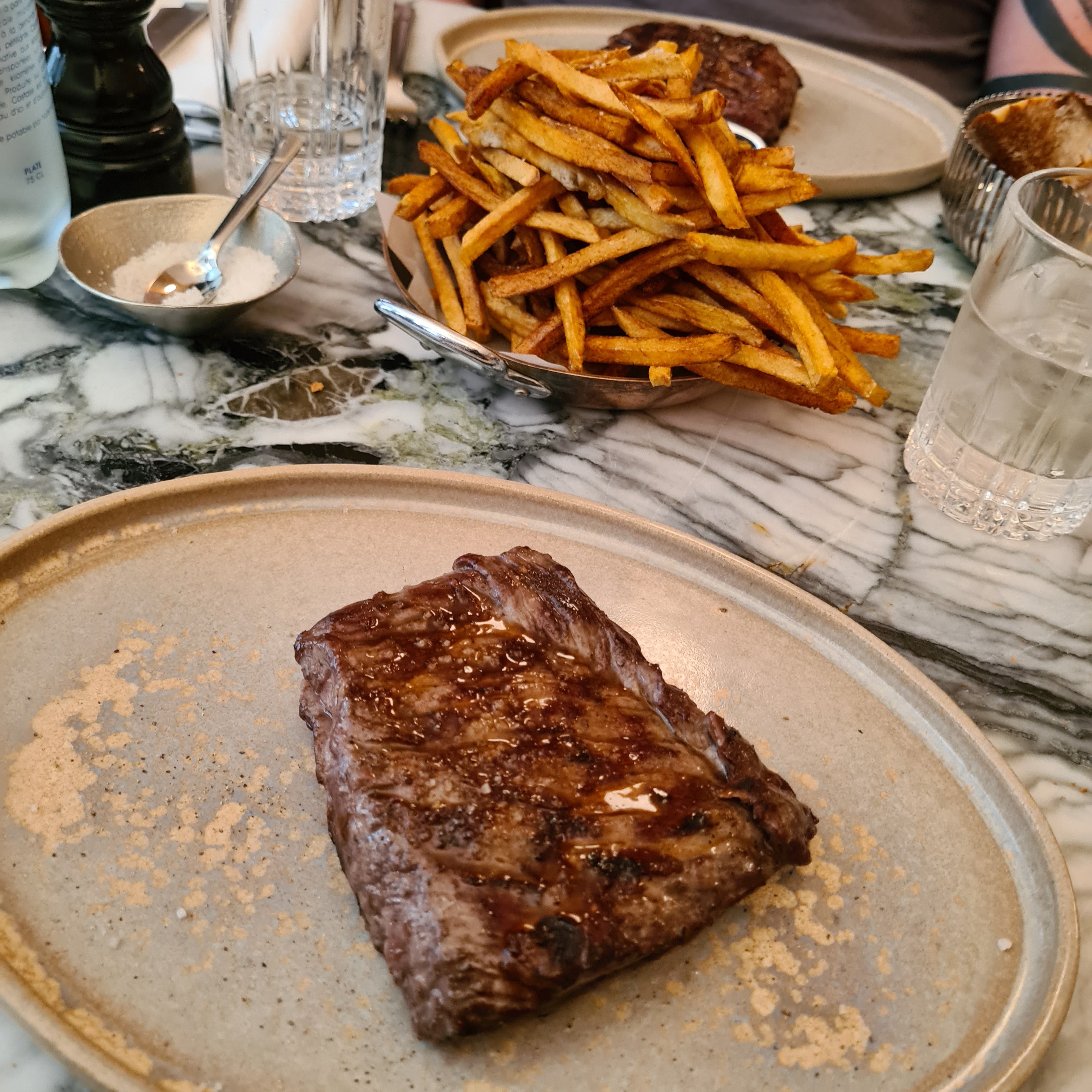 Tout d'abord, le menu est uniquement en français, ce qui est un peu gênant car compliqué et très bruyant. Oui, nous sommes en France, mais partout ailleurs, nous avions des sous-titres anglais. Nous avons eu du mal à entendre notre serveur. Le steak était excellent, mais plutôt petit pour le prix. Les couteaux à steak étaient probablement les pires que j'ai jamais utilisés. Ils étaient incroyablement ennuyeux. Je m'attends à un couteau bien aiguisé dans un steak house haut de gamme. Les frites étaient les meilleures que j'ai jamais mangées. Le service n'était pas génial. Notre serveur a prêté beaucoup plus d'attention à la table à côté de nous. Ils dépensaient plus. Il ne nous a pas vérifié une seule fois. Encore une fois, j'attends plus d'un restaurant haut de gamme. Je le recommanderais certainement et j'espère que votre service est meilleur que le nôtre. Astuce, le restaurant se trouve dans une petite rue. Nous avons eu du mal à le trouver avec Google Maps.
