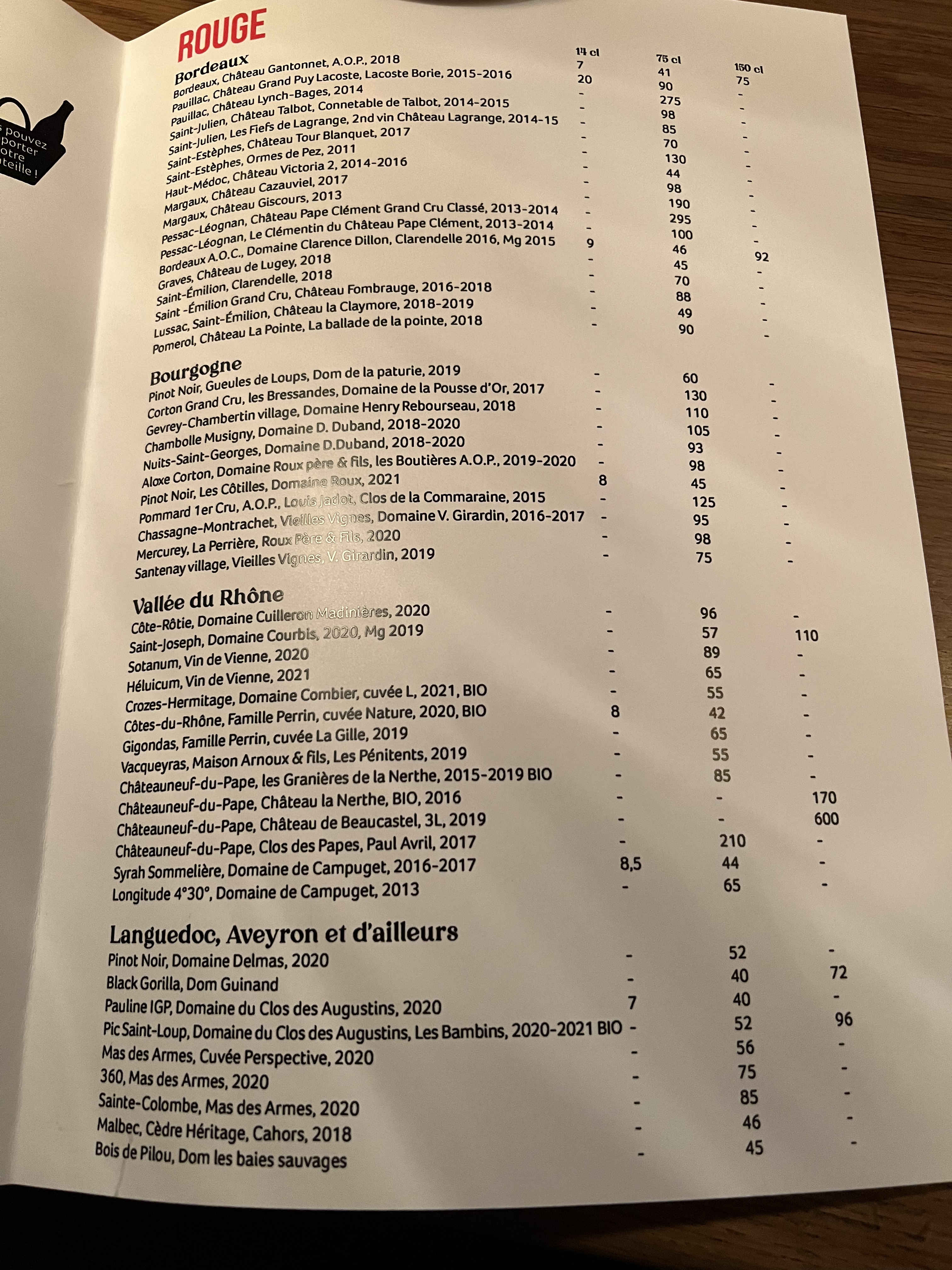 Nous sommes venus ici en grand groupe de 10 personnes le 19/12/23. Nous n'avions pas de réservation, mais lorsque nous sommes arrivés, le restaurant avait encore assez de place pour nous et nous étions accueillants. Le service était globalement excellent, même si le restaurant était occupé et la serveuse a fait preuve de beaucoup de patience pour expliquer le menu et les vins à notre grand groupe. L'ambiance était géniale, chaleureuse et confortable. La nourriture était presque parfaite. Il y avait quelques plats végétariens, dont des entrées et des plats principaux. Les entrées étaient toutes excellentes. La plupart étaient satisfaits de leurs plats principaux, mais certains estimaient que le steak n'était pas assez assaisonné, que certaines préférences en matière de cuisson du steak n'étaient pas tout à fait correctes et je sais que nous étions un grand groupe, mais certains plats n'étaient pas assez chauds, ce qui était une déception pour le prix. Le vin était délicieux et notre serveuse nous a donné de bonnes recommandations, même si nous avons commandé deux fois des bouteilles différentes et qu'elles étaient toutes deux épuisées, nous avons donc dû nous contenter de notre troisième choix. Dans l’ensemble, c’est une expérience formidable avec quelques commentaires que, espérons-le, le restaurant pourra prendre en compte.