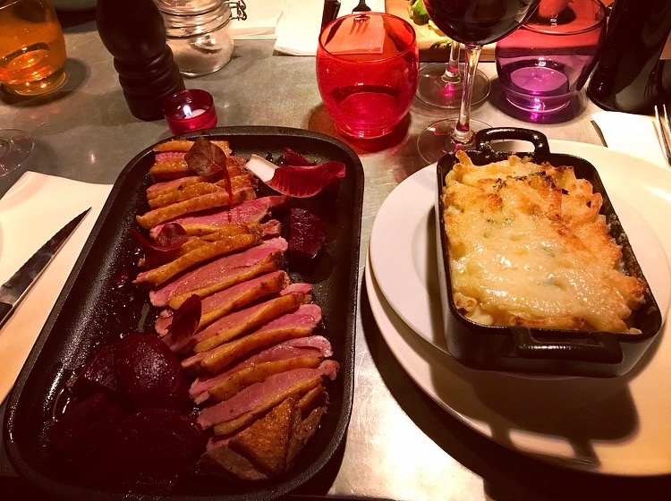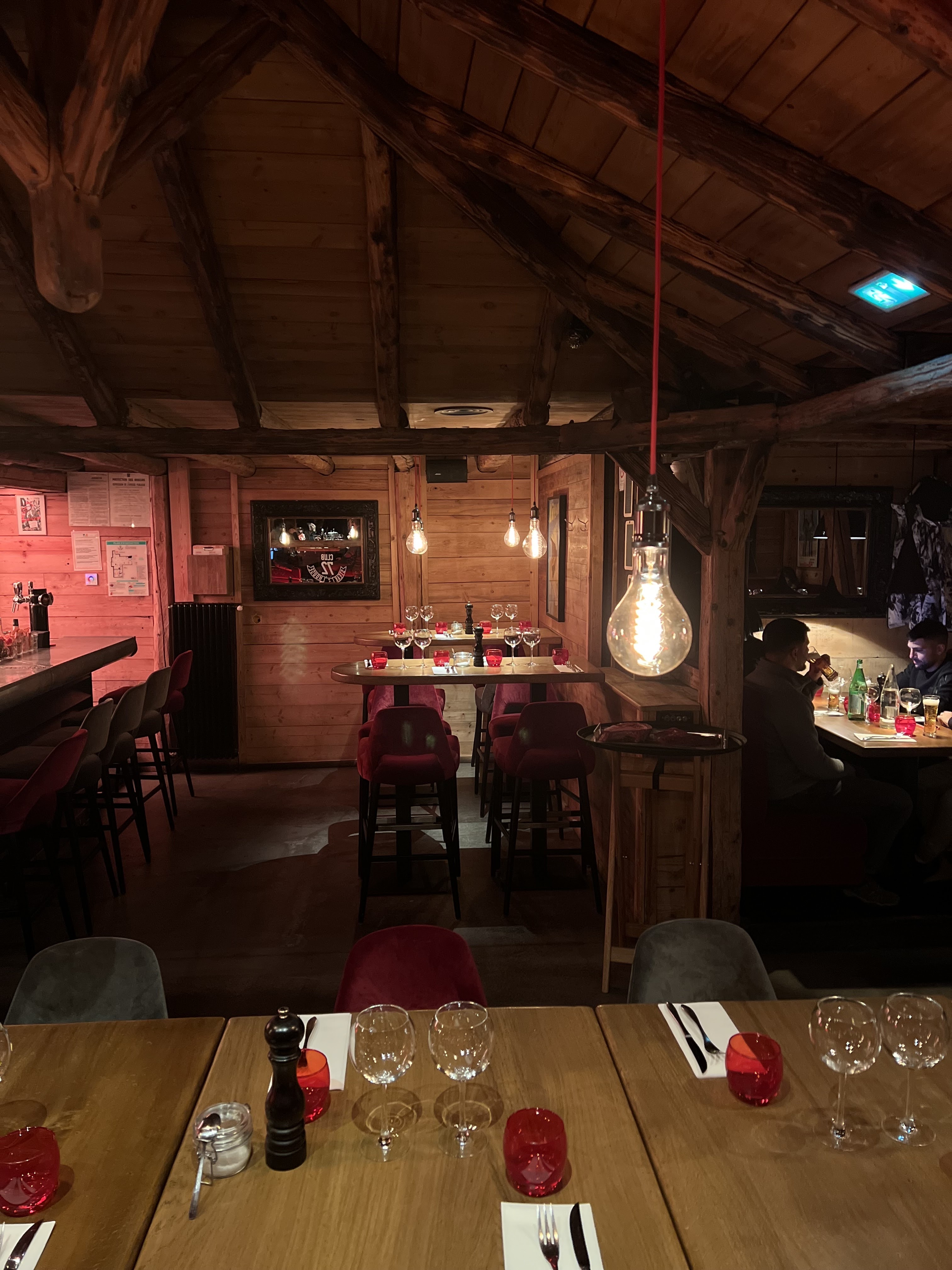 Façade rouge, intérieur cosy et intimiste, serveur discret et mignon aucun accent décelé jeune mais mature pour son âge , viande présentée cru mais cuite dans l’assiette, musique décalée. Il y fait chaud. Bretelle en dresscode. Le patron offre des tournées quand il est là. Urinoir pratique et en inox, les coktails. Noix d entrecote angus en premier choix, gratin de pattes au fromage, celui ci etant du beaufort Tapas comme a l’accoutumée ne pas prévoir 2 assiettes . Resto d’altitude mais pas d’attrape. Ni rat crevé ni brasserie bon moment XoXo