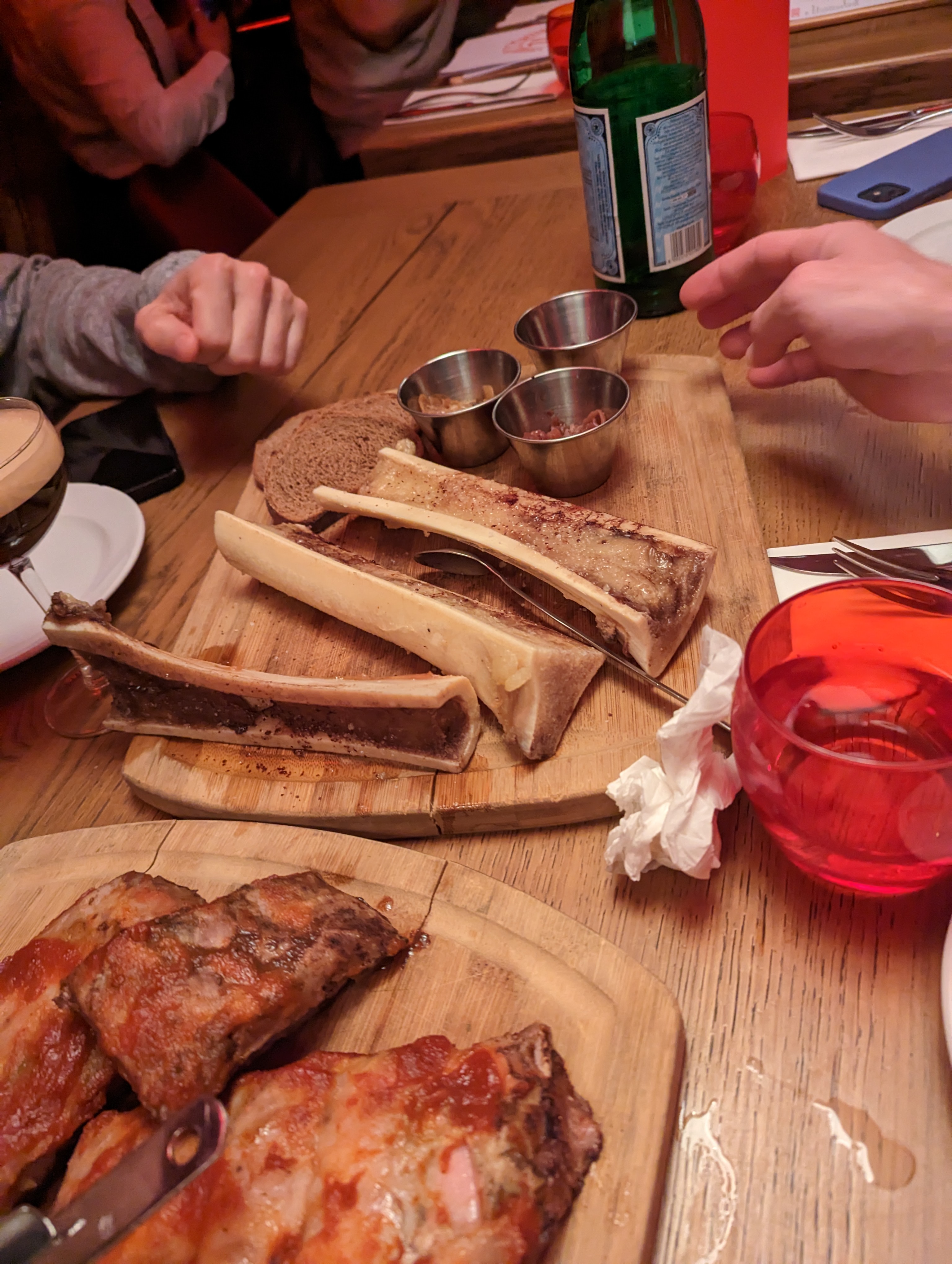 La serveuse est venue chercher nos assiettes avant de terminer notre dîner. L'entrecôte était composée de 1/3 de matière grasse. Côtes levées où 1/3 d'une côte normale pour le prix de 2 côtes. Si vous voulez de la mauvaise nourriture à un prix excessif, faites une réservation et peut-être arriverez-vous avant que les tables réservées en double ne soient prises. Les personnes à la porte qui avaient une preuve de réservation ont été rejetées. Le serveur a compris que ma nourriture manquait après que toutes les autres personnes aient eu leur nourriture 5 minutes plus tôt. Un conseil : n'y allez que si vous voulez payer trop cher pour une nourriture insipide. La photo représente les 3 morceaux de côtes que nous avons reçus.