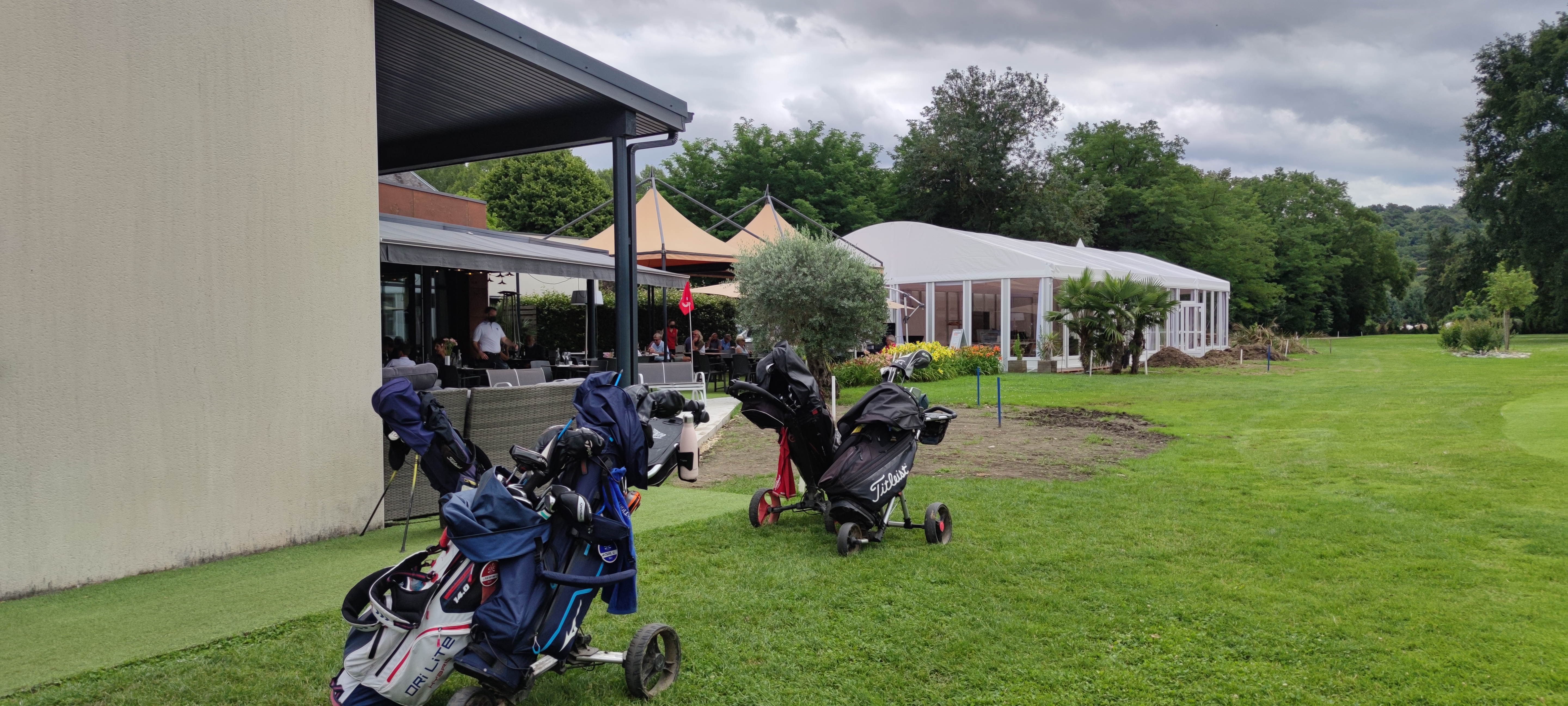 Terrasse cosy et club-house. Service excellent. Juste à côté du trou 18.
