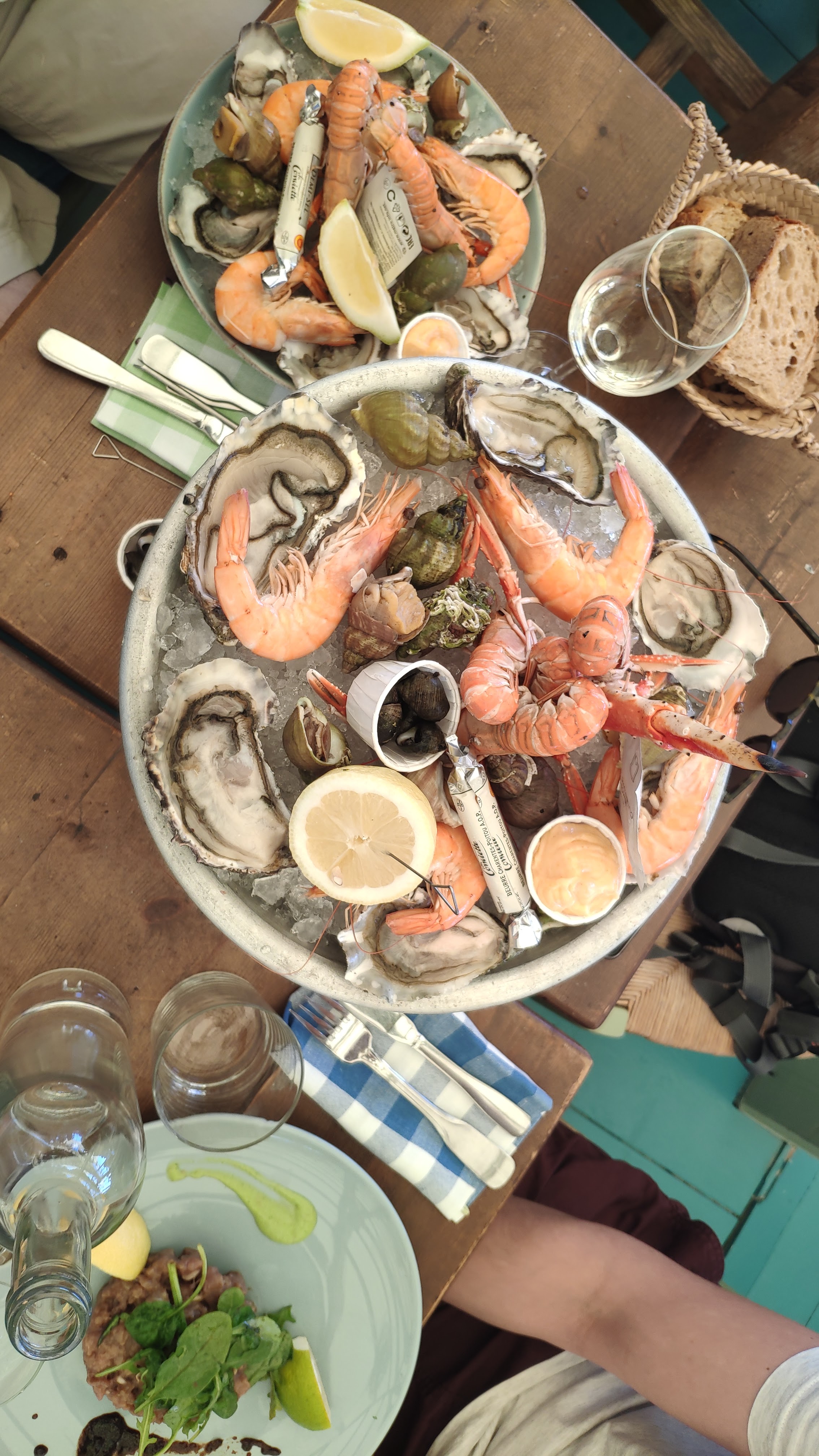 Nous avions choisi le plateau de fruits de mer numéro 3 et c’était un vrai régal! Tout était bien frais et savoureux. Par peur de manquer un peu de quantité pour 2 nous avions également pris la planche de charcuterie où le pâté au piment d’espelette et le jambon blanc étaient délicieux!