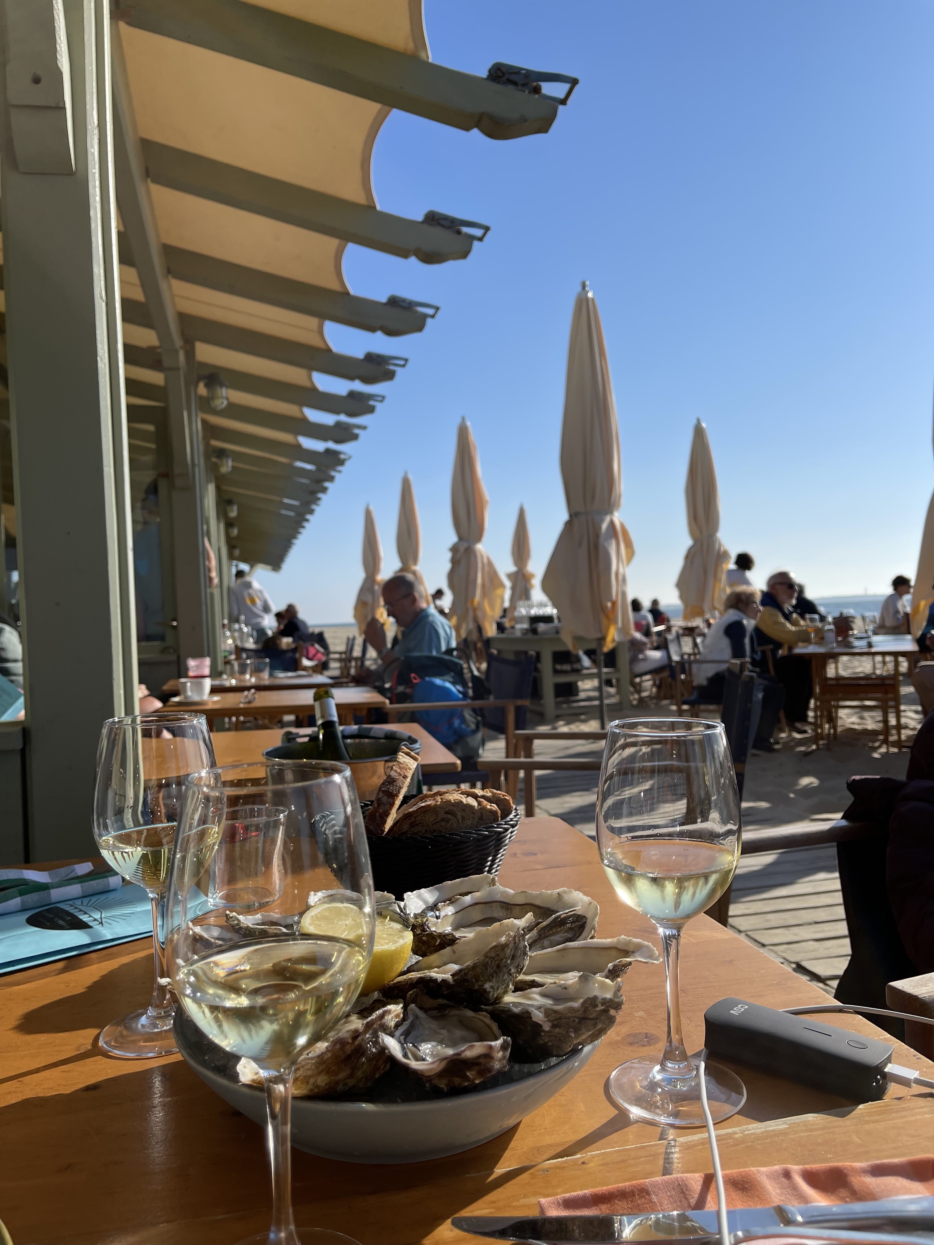 Tellement agréable de finir la journée face au coucher de soleil avec qqs huîtres et un verre de vin les pieds dans le sable...