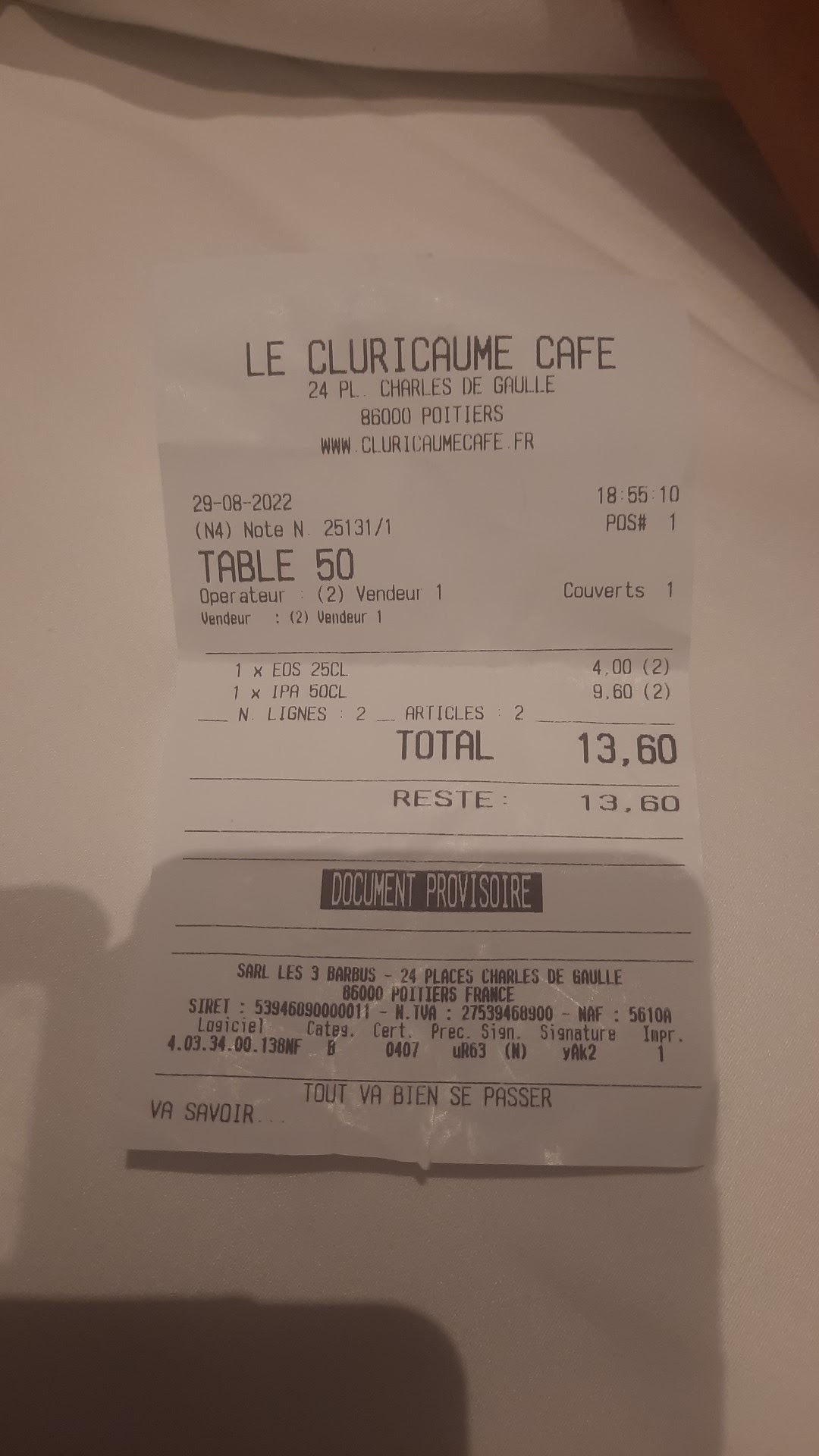 La bière la plus chère que nous ayons eue dans toute la France. Mon mari a commandé une bière Ipa de 50 cl et quand la facture est arrivée, elle coûtait 9,60 €, ce qui semblait un prix exagéré car l'endroit était simple et fréquenté par les étudiants, même dans les lieux touristiques, une bière n'est pas aussi chère.