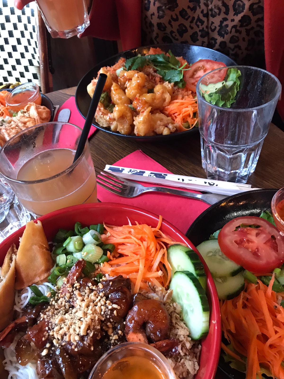 Restaurant testé par hasard. Je n'ai pas été déçue. J'ai pris un loc lac au bœuf. L'assiette était assez pleine. Il y avait pas mal de morceaux de bœufs qui étaient très bon. Les gyozas frits sont très bons. Les raviolis fris aux crevettes aussi. Les plats sont biens présentés et les assiettes bien garnies. Mes amis ont pris des bons bo bun. Pourtant de gros mangeurs ils ont eu du mal à terminer. Malheureusement le seul accompagnement disponible est le riz à la tomate qui est bon. C'EST dommage de ne pas proposer du riz blanc basique. J'ai pris une virgin Pina colada et j'ai été très déçue par contre. Il y a un bon rapport qualité prix. J'en ai eu pour une vingtaine d'euros avec entrée+plat+ boisson. Et je n'avais plus faim. La serveuse est très sympathique. Je conseille cette adresse. C'EST un lieu agréable après avoir été au grand Rex qui n'est pas trop loin ou un Escape game à Happy hour qui est à côté aussi.