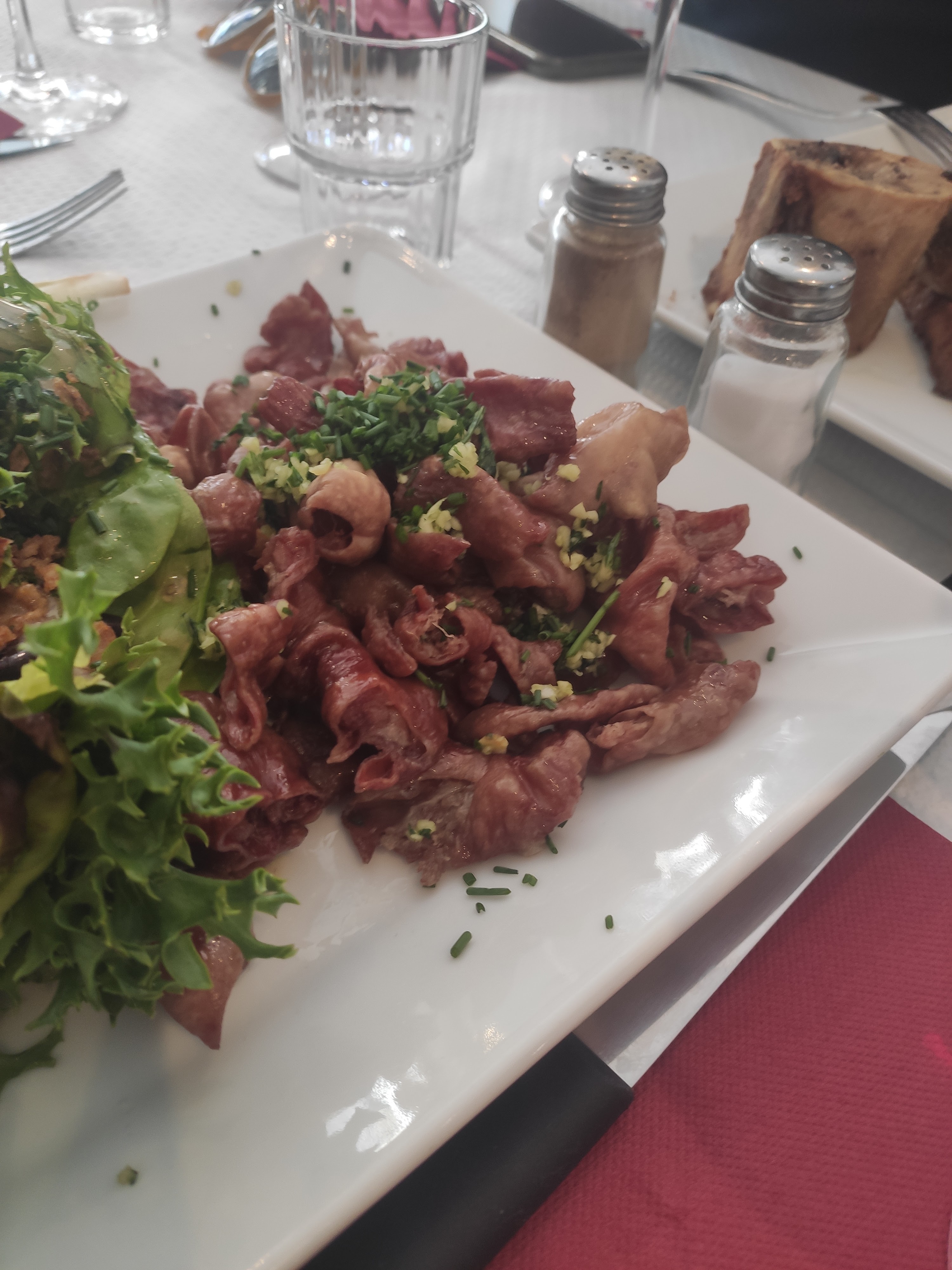 Il y a beaucoup de choix en plats de viande et en vin. Le staff est très sympathique. Les quantités sont importantes donc venez en ayant faim. Niveau intérieur il s'agit d'un ancien abattoir c'est très sympathique également. Le service prends un peu de temps et les toilettes sont un peu à l'ancienne et niveau séchage des mains il n'y a qu'une seule petite serviette ce qui n'est pas une optimisation niveau hygiène. J'y retournerai avec beaucoup de plaisir avec du gel hydro alcoolique.