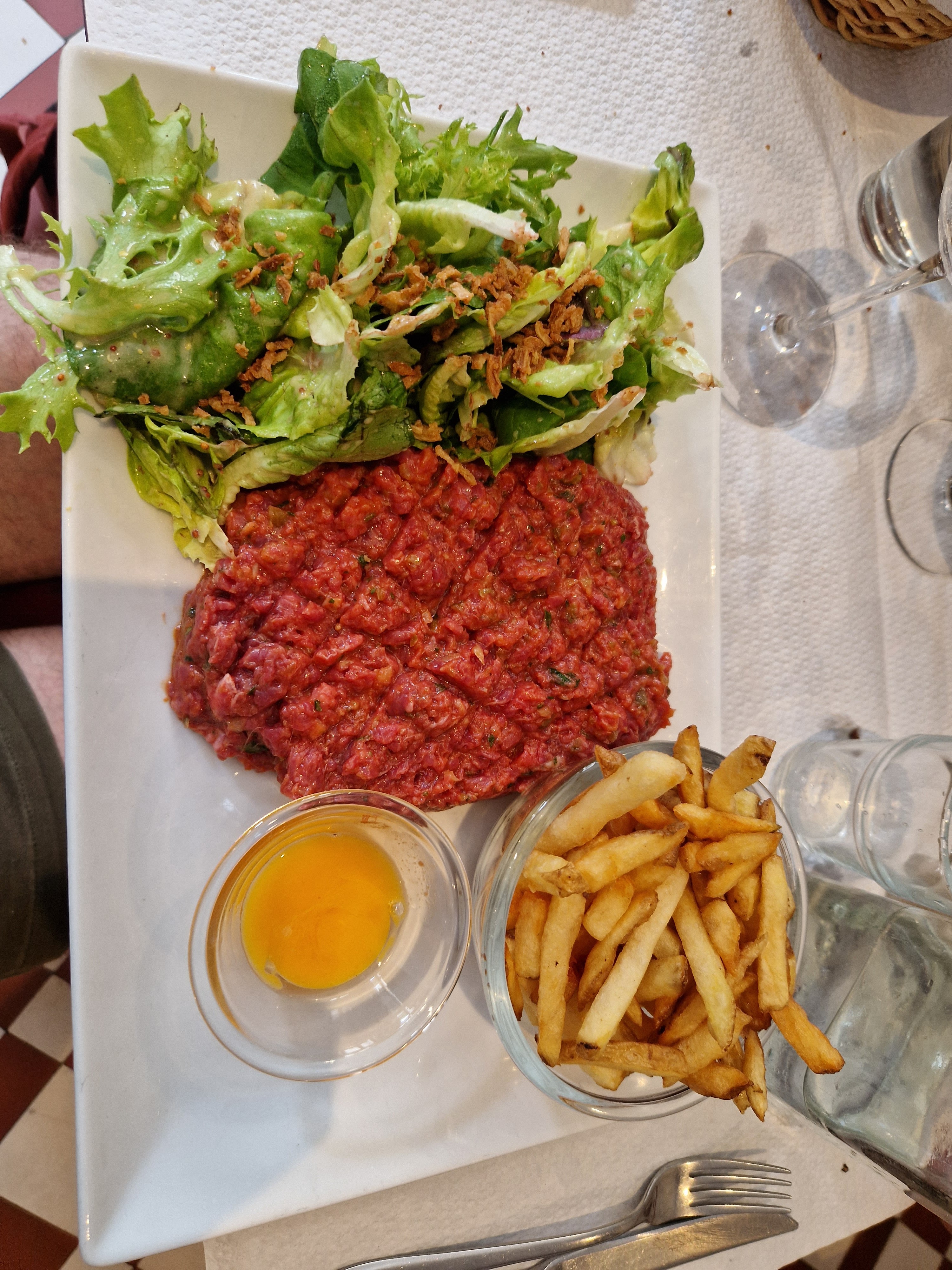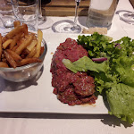 Un peu cher. Magret bien cuit, sans fantaisie mais cuisson respectée. Tartare de boeuf, visiblement pas au couteau. J'espère que vous aimez câpres et cornichons. Beaucoup trop assaisonné. Peut-être au goût du chef et de certains mais pas au mien. Serveur certes tout seul et sûrement dans le jus , mais relativement désagréable. Peut-être que la carte franc-parler et bonne franquette devrait trouver elle-même ses limites. De plus l'impression d'importuner le personnel, même lorsque l'on paye, car le restaurant est exigu ne donne pas spécialement l'envie de revenir. Bilan une trentaine d'euros en comptant un plat moyen mais mais copieux et un vin rouge fort agréable.