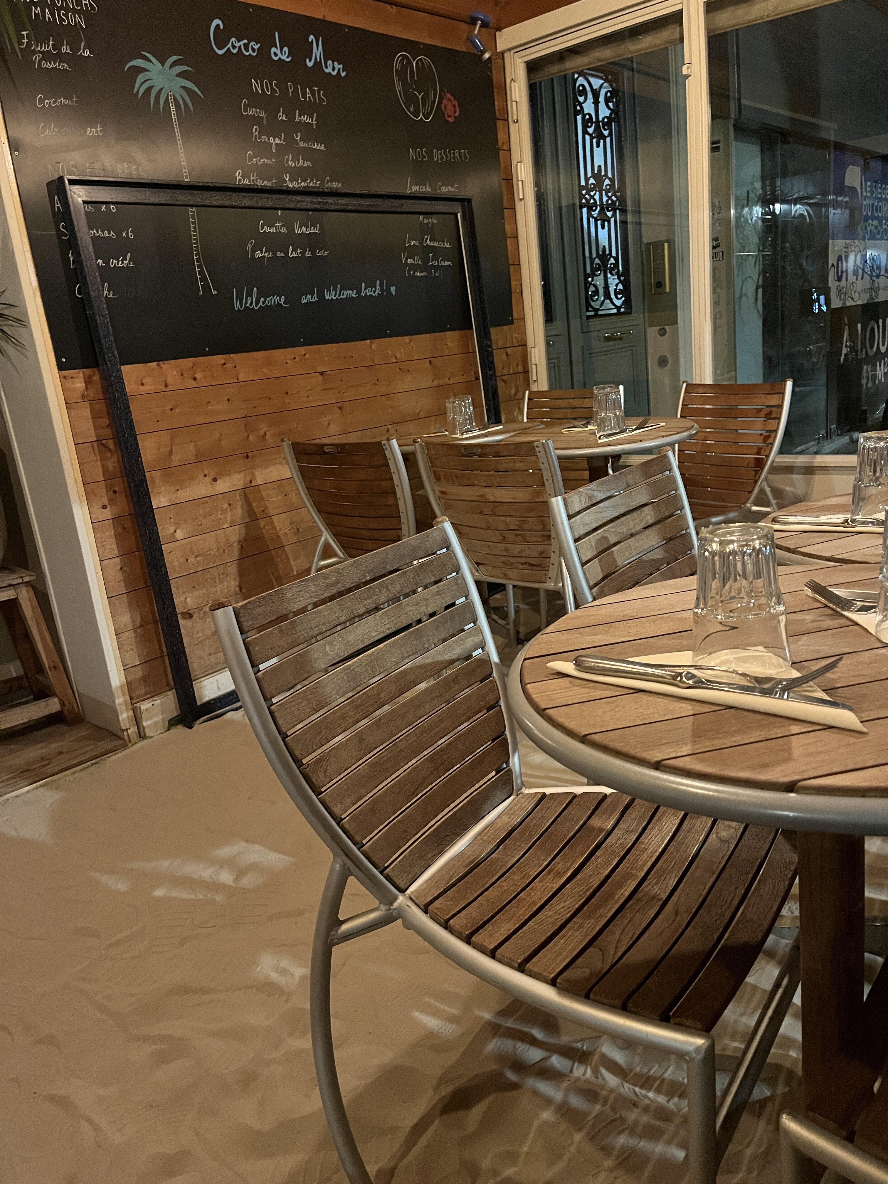 La déco exotique et les pieds dans le sable contribuent à créer un environnement tropical même dans le chaos urbain de Paris. Avec un peu de musique, l'effet aurait été encore plus agréablement désorientant. Côté nourriture, la carte est limitée mais très soignée, peut-être un peu chère (entrées 9 €, plats 15-20 €, desserts 9 €). Le boudin noir - à la consistance crémeuse et au goût pas trop piquant - est bon mais pas incontournable. La saucisse rougail - riz avec morceaux de saucisses et légumes - est copieuse et savoureuse, mais j'aurais osé avec une sauce pour lier les ingrédients. L'octopus - riz au poulpe et lait de coco - était riche et équilibré, mais la véritable star du repas était le dessert. Le lovecake à la glace coco est un véritable nuage en bouche, où toutes les saveurs - l'acidité des biscuits trempés dans un sirop de fruit, la douceur du caramel, la richesse de la crème de coco - se mélangent parfaitement. Globalement, je recommanderais ce restaurant aux amateurs de cuisine internationale et à ceux qui souhaitent voyager avec leurs papilles.