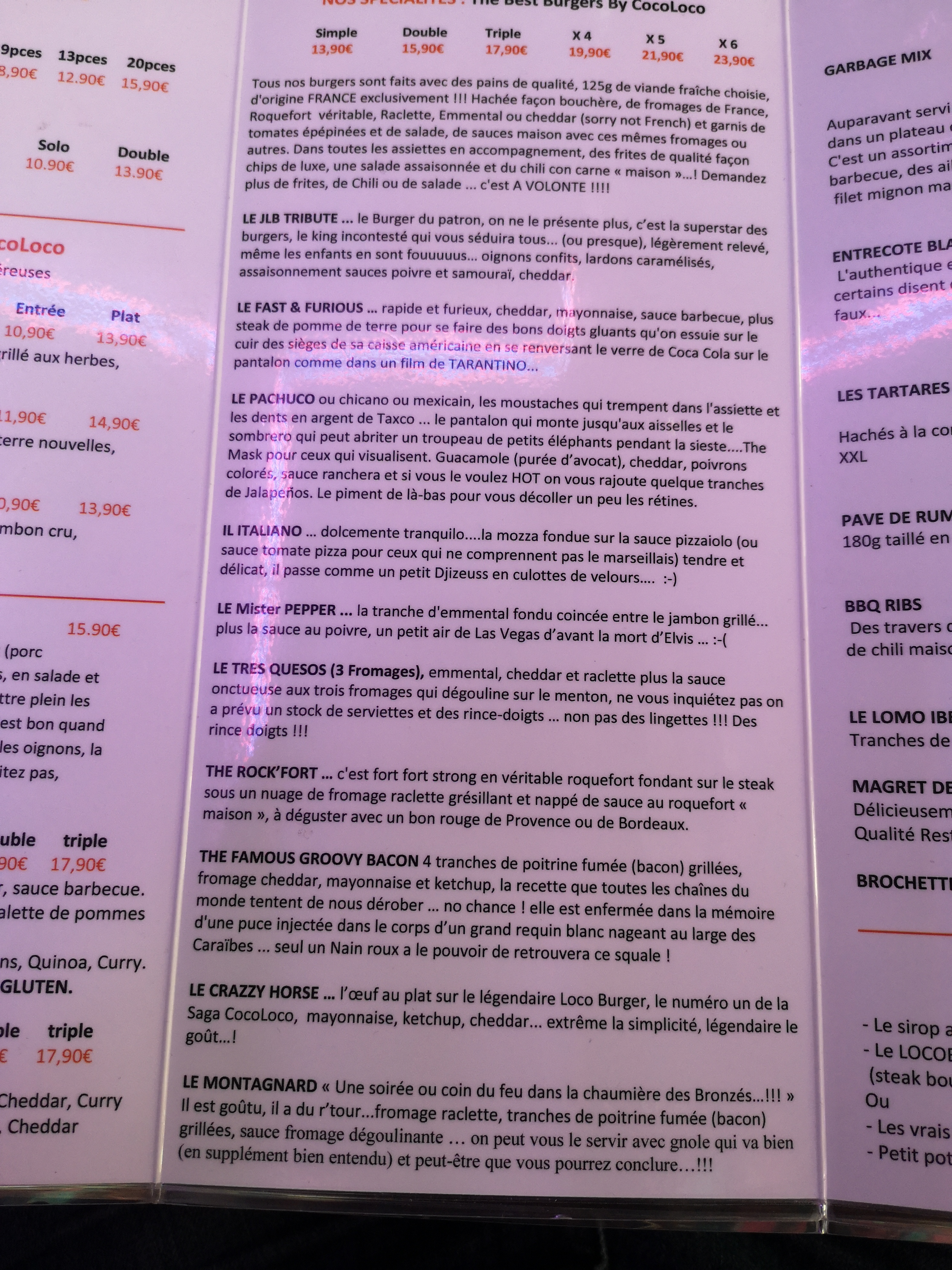 J’ai adoré, malgré le menu difficile à lire et bourré de blagues douteuses, la cuisine est exceptionnelle pour qui aime les bons gros burgers !