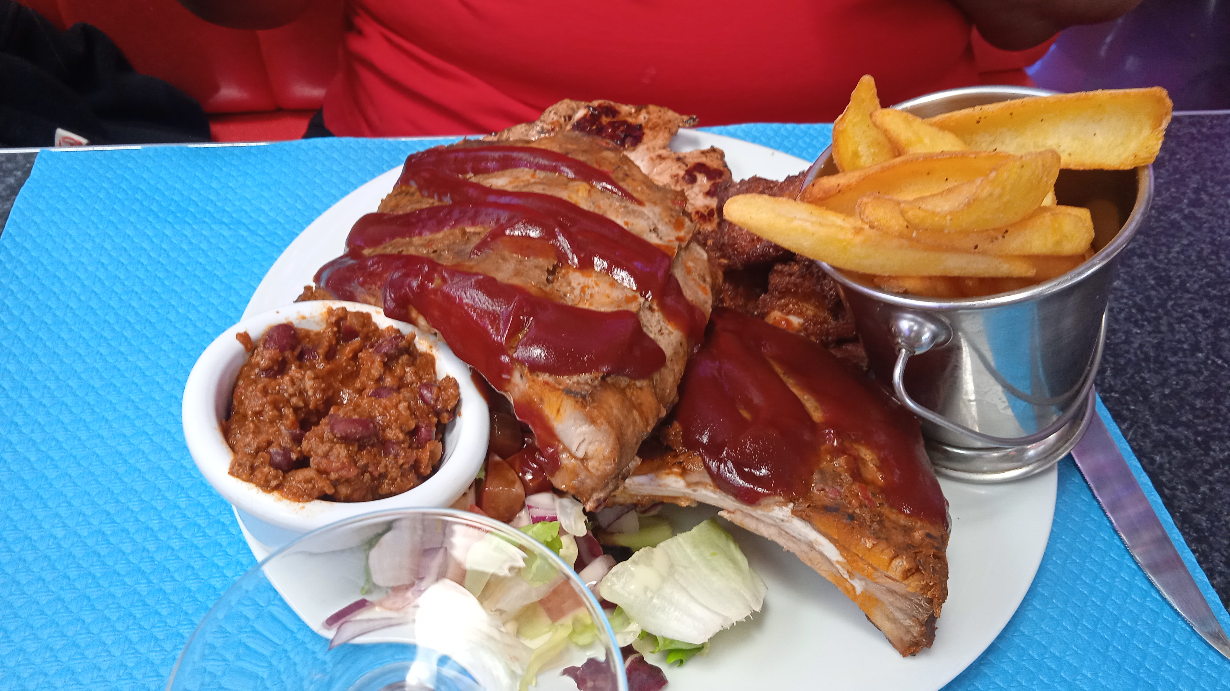 Le service était excellent combiné avec une ambiance/décoration de style américain. Je m'attendais à une ambiance plus rock'n'roll mais nos oreilles ont été apaisées par une musique d'ascenseur douce et jazz. L'assiette de côtes était correcte et copieuse mais pas extraordinaire. Je regrette de ne pas avoir commandé de hamburger car les assiettes de mes voisins semblaient plus attrayantes que les miennes. De plus, le chili était délicieux mais il était servi froid. On m'a également informé que parfois, le vendredi, il y avait de la musique live. Apprécier
