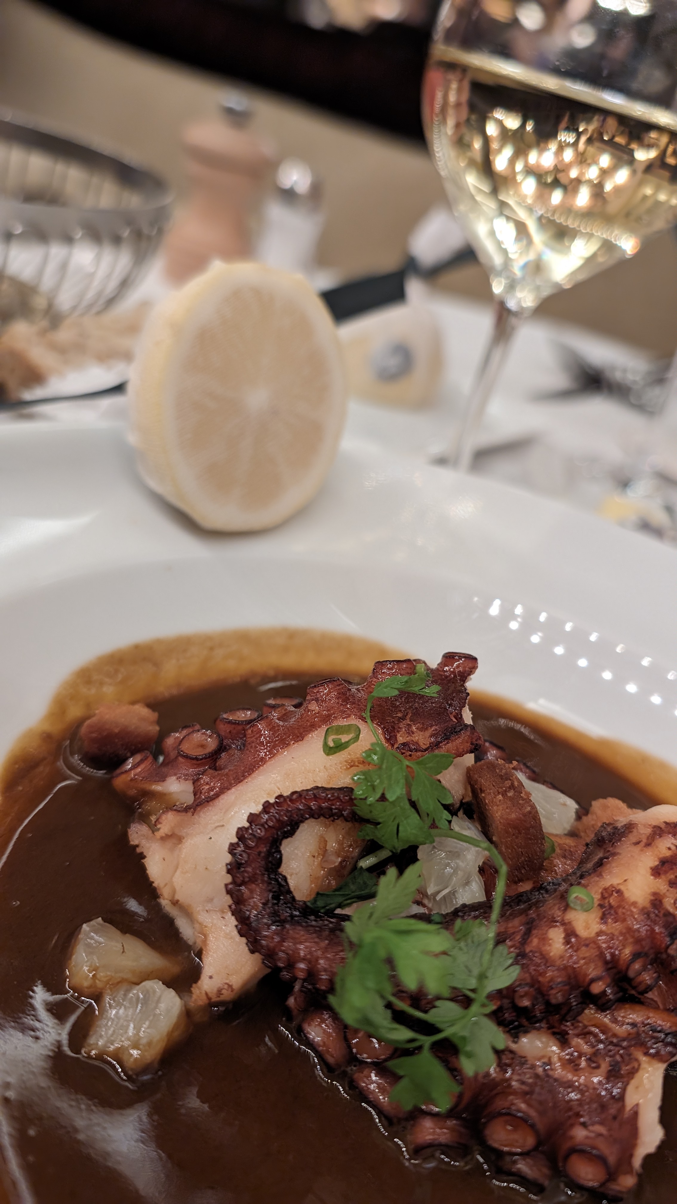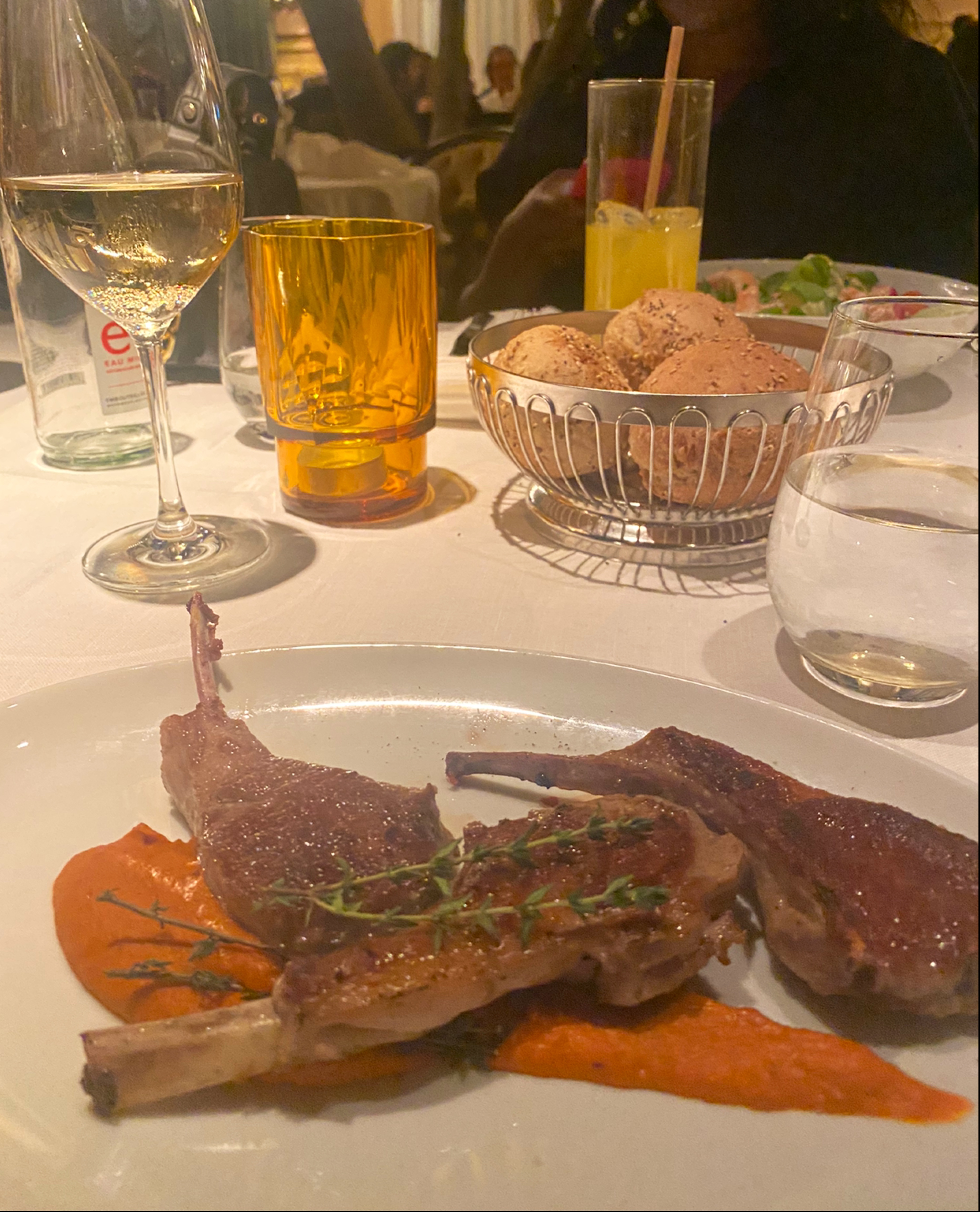 3eme repas, 1ere fois le soir. À chaque fois nous nous sommes régalés, les plats sont délicieux, subtils, raffinés. Bravo, les entrées comme les plats sont vraiment à la hauteur d’un gastro. Les cocktails sont coûteux certes, mais vraiment très subtils et innovants, créatifs. L’ambiance est parfaite, comme la déco, le soir il y a même un ou une chanteuse… c’est vraiment le resto idéal. La note bien sûr, va avec tout cela, mais franchement c’est mérité, le service est comme le reste, largement au niveau. Un seul point à améliorer : les prix de la carte des vins… c’est vraiment excessif…
