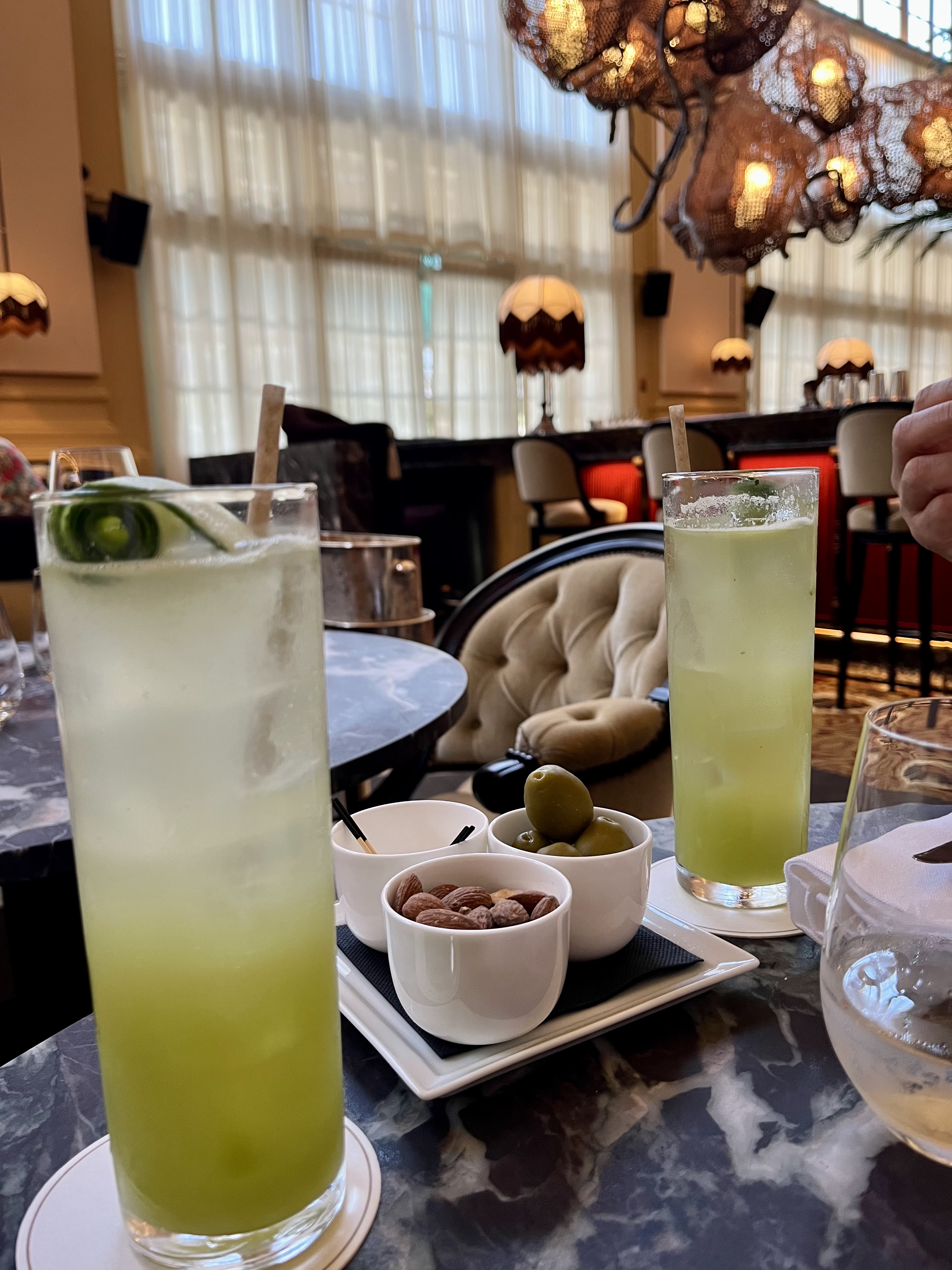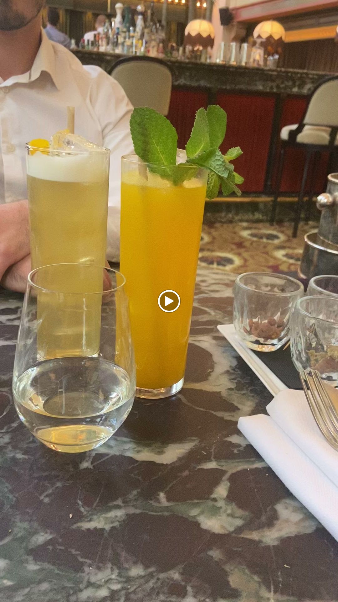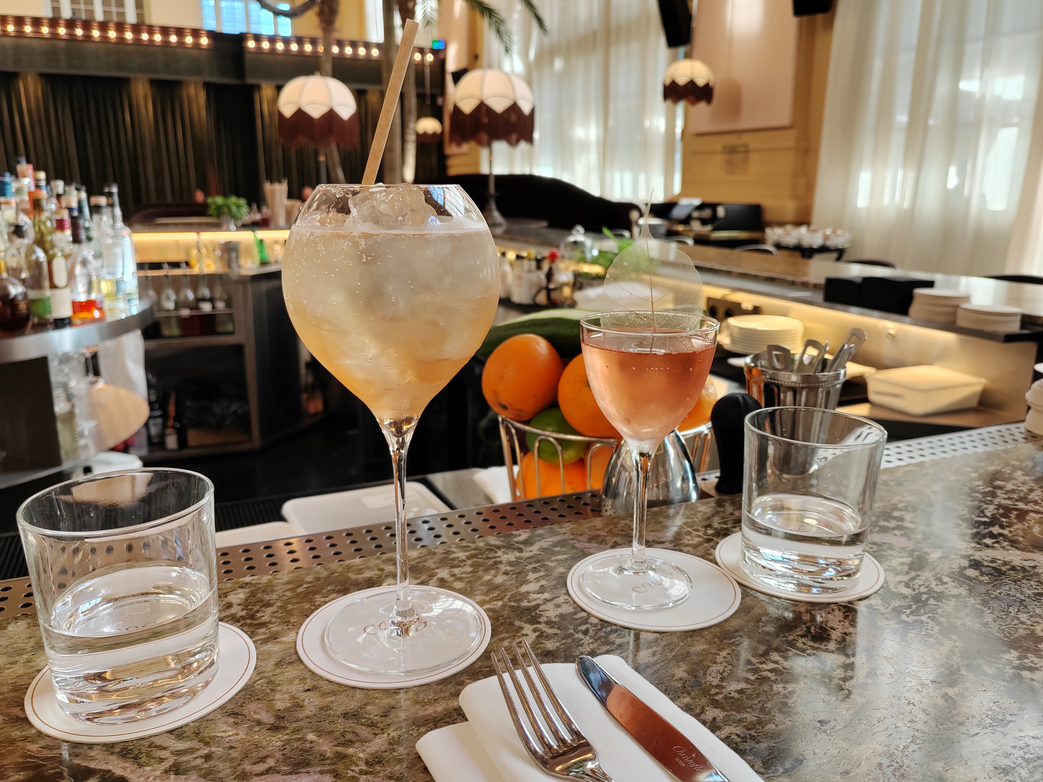 Points positifs : Le cadre est vraiment super sympa, chic et naturelle, mi année 20 mi moderne. L'assise est confortable et les tables joliment dressées. Le personnel est très professionnel et agréable. Le repas était parfait, starter excellent et copieux, entrée bien travaillée, plat simple mais extrêmement bien cuisiné, vraiment très très bon. Une chanteuse était présente avec des musiques de tout âge, très sympa. Points négatifs : L'eau, je suis désolé mais je n'arrive pas à voir la valeur ajoutée d'un tel établissement sur de l'Evian 33 cl à 6 € proposé de manière plutôt agressive. A peine arrivé c'est la première question que l'on nous pose. Les cocktails étaient plutôt bien travaillés mais 16 € pour du 8 cl, la marge semble beaucoup trop élevée. Le café à 5 €, pareil, aucune valeur ajoutée de l'établissement donc aucune raison de payer ce prix. >Conclusion : Je recommande quand même vivement mais vous invite à demander une carafe d'eau et à ne pas prendre de café.