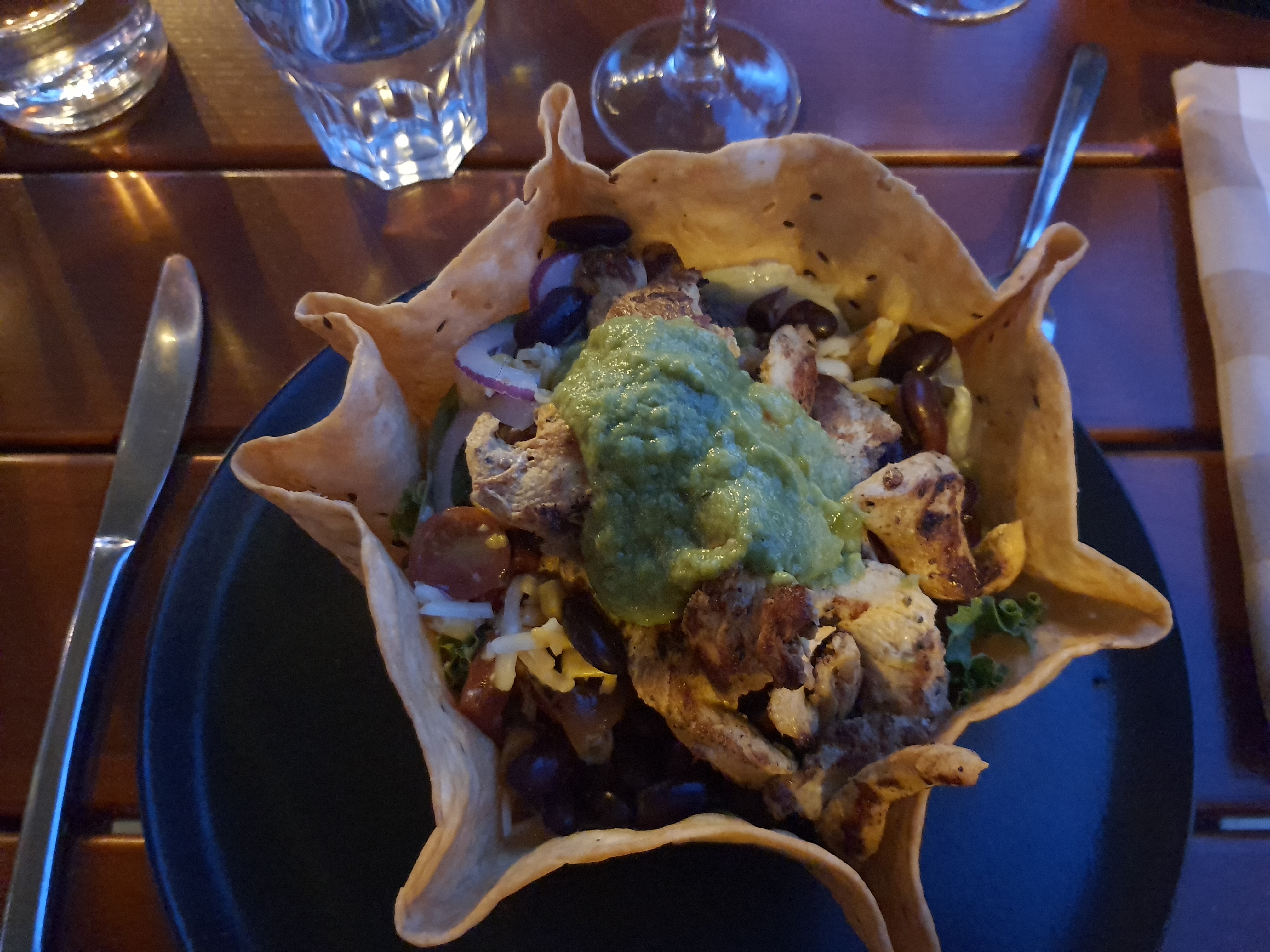 Concernant mon plat, mes fajitas étaient fades et ma glace grise avec un goût assez spécial pour un sundae... comme 3 autres de mes amis Je suis venue avec 4 amis et mon copain a pris un burritos mix bœuf poulet... la première partie du burritos était passable... malheureusement arrivé à la partie poulet... SURPRISE du poulet cru! Littéralement cru... Nous n'avons pas pris de photo car notre premier reflex a été de renvoyer le plat. La réaction n'a pas été à la hauteur de la faute et avons eu le dessert offert à 6€50 pour un plat à 24€... mais la n'est pas le problème, mon copain n'a pas été malade puisqu'il n'a pas mangé de poulet mais qui sait ce qui aurait pu se passer si ça avait été le cas... Nous n'y retournerons pas.