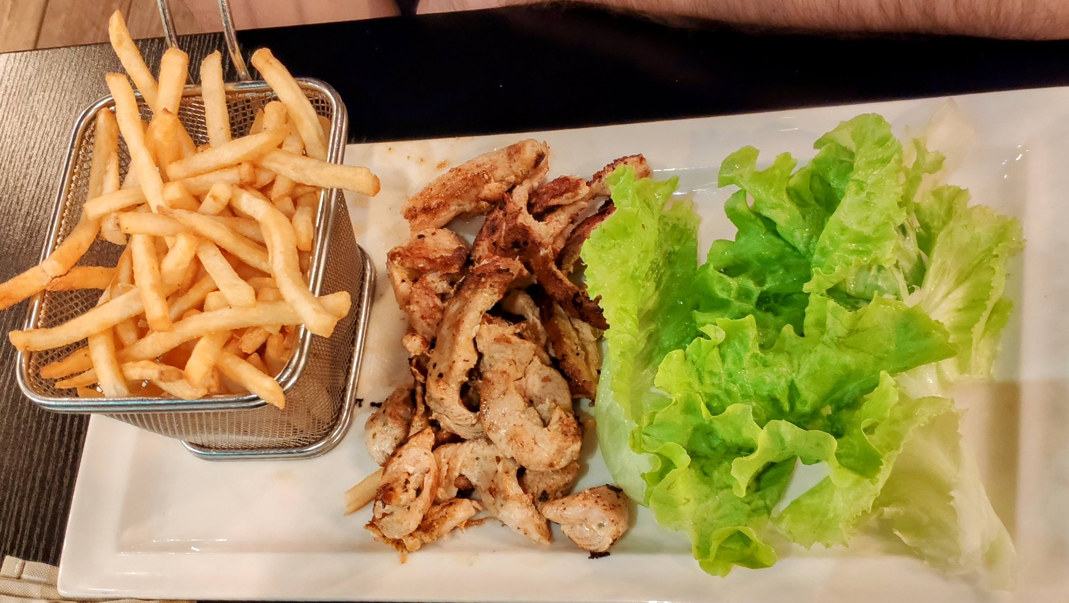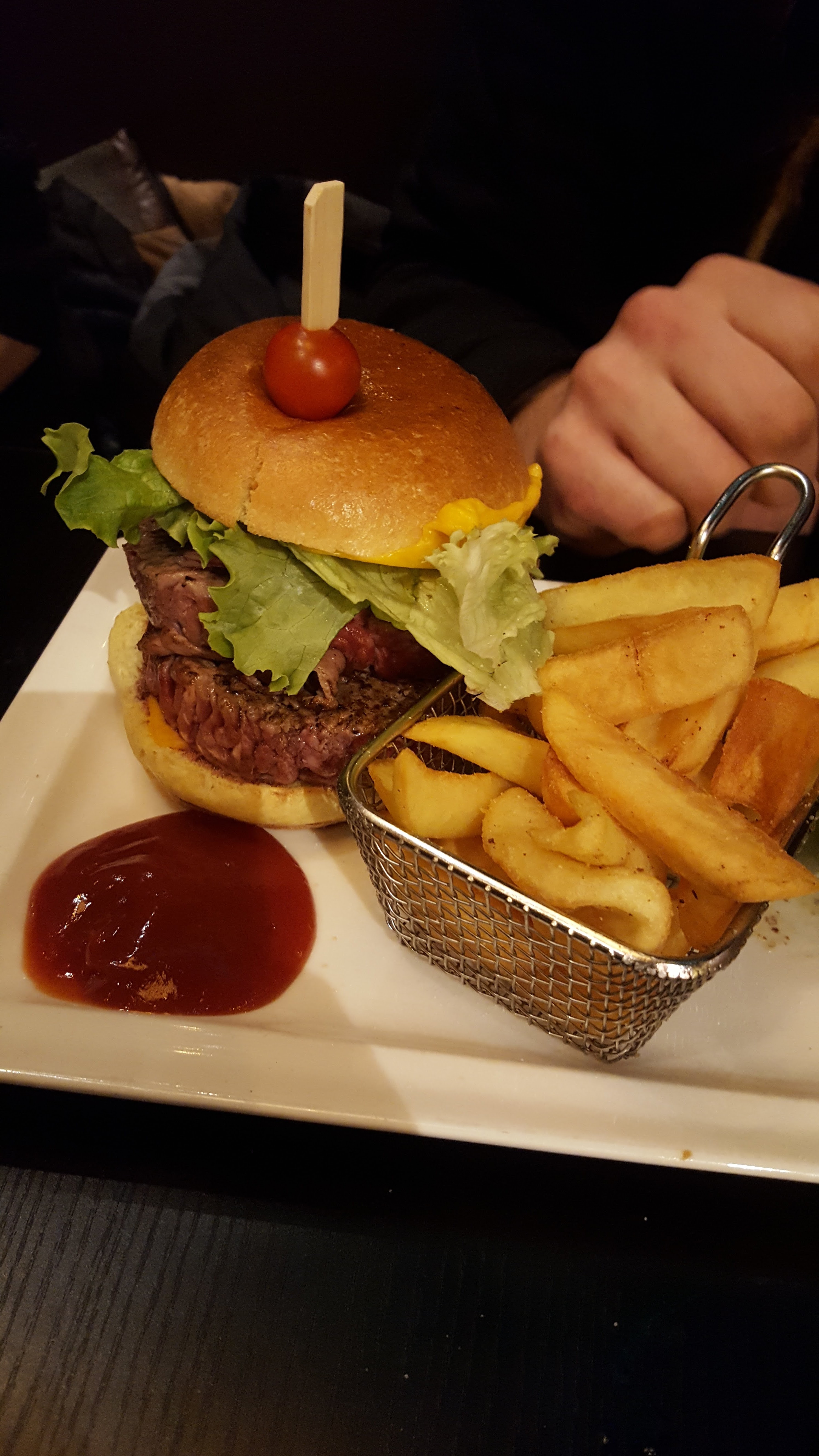 Jolie restaurant , un peu compliqué pour se laver les mains , obligé d attendre pour avoir accès qu' à une petite vasque , pour un grand restaurant. Serviettes tissus, salade impossible à mélanger dans l assiette bol . J ai demandé du pain on m'a apporté un petit pain pour deux. Le dessert bien présenté, les frites, les meilleurs que j ai mangé ces derniers temps , malgré une bonne portion, j en aurais bien repris. Merci.