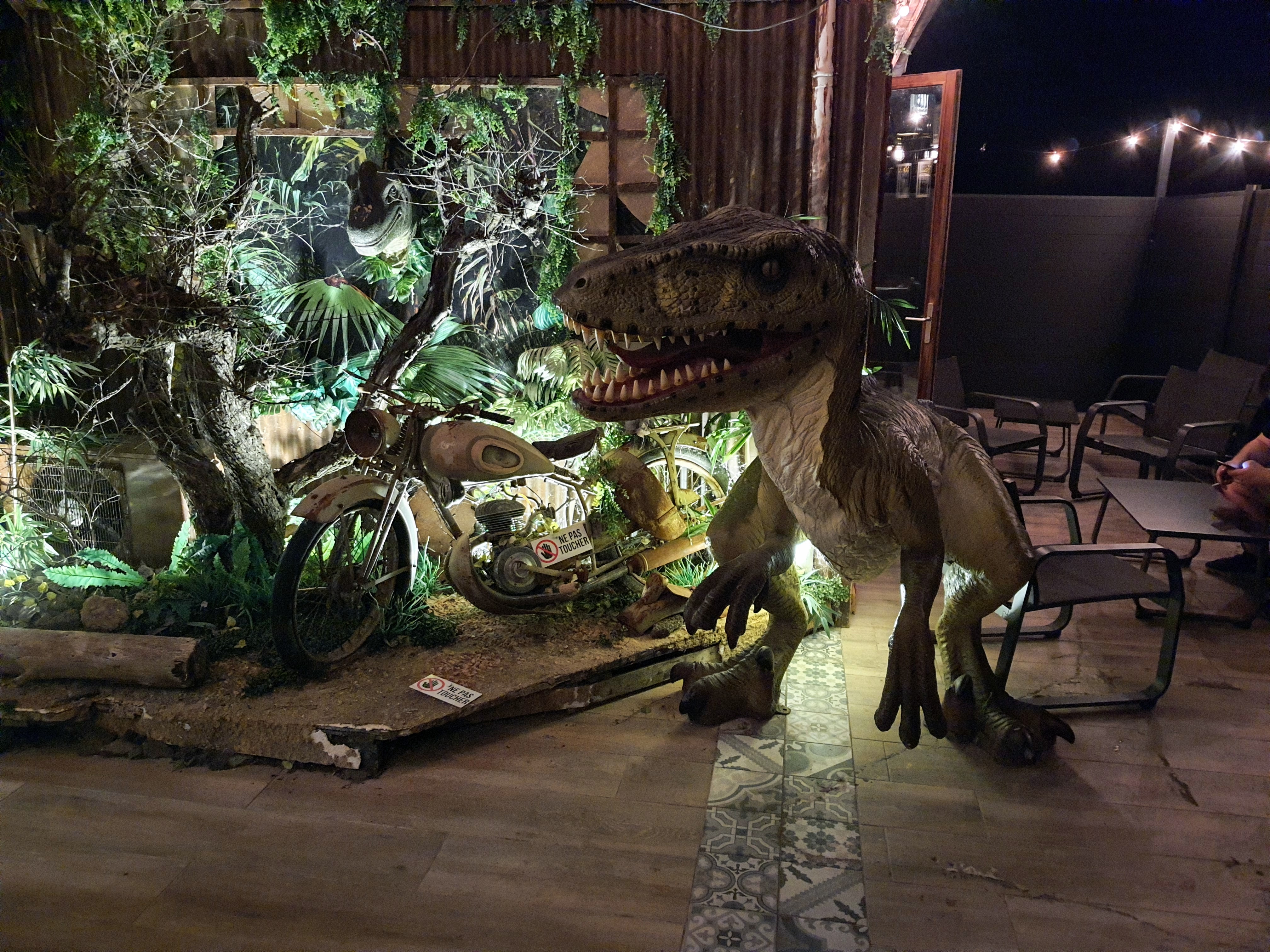 Et si on allait se plonger dans l'Amérique que l'on voit dans les séries et films ? Voilà l'envie qui nous a poussé à aller visiter le Coco's Dinner car on était passé devant il y a quelques semaines et le lieu nous a intrigués. Réservation facile par téléphone, une place en terrasse nous attend, on se dit qu'on va passer une bonne soirée. Le lieu, on s'y croirait presque. La déco extérieure et intérieure est vraiment sympa. Peut être que la statue du velociraptor est de trop mais elle reste amusante. Rien à dire sur le service et le serveur du soir. Sourire et prévenance sont au rendez-vous. La carte est fournie et le choix est difficile. Jusqu'à ce qu'on demande si le pain est fait maison pour les burgers et là...c'est le drame 😱 Le serveur ne nous cache pas que tout vient d'un grossiste comme Métro. Rien n'est fait sur place, rien n'est frais... Que faire ? On part sur un tartare et des fajitas. J'ai été surpris par la quantité copieuse de viande proposée inversement proportionnelle à la taille minuscule des galettes. Le tartare était sans goût mais néanmoins bien présenté, les frites chaudes et en grandes quantités mais vraiment pas exceptionnelles. Quant au dessert, en photo, une tarte Pécan Pie dans laquelle on ne sentait que l'alcool et dont la taille est aussi inversement proportionnelle au prix proposé (7€50) Bref, on est venu, le cadre était sympa, le service aussi mais nous n'y reviendrons pas car la cuisine proposée n'était pas ce que nous attendions pour un tel lieu et le prix payé.