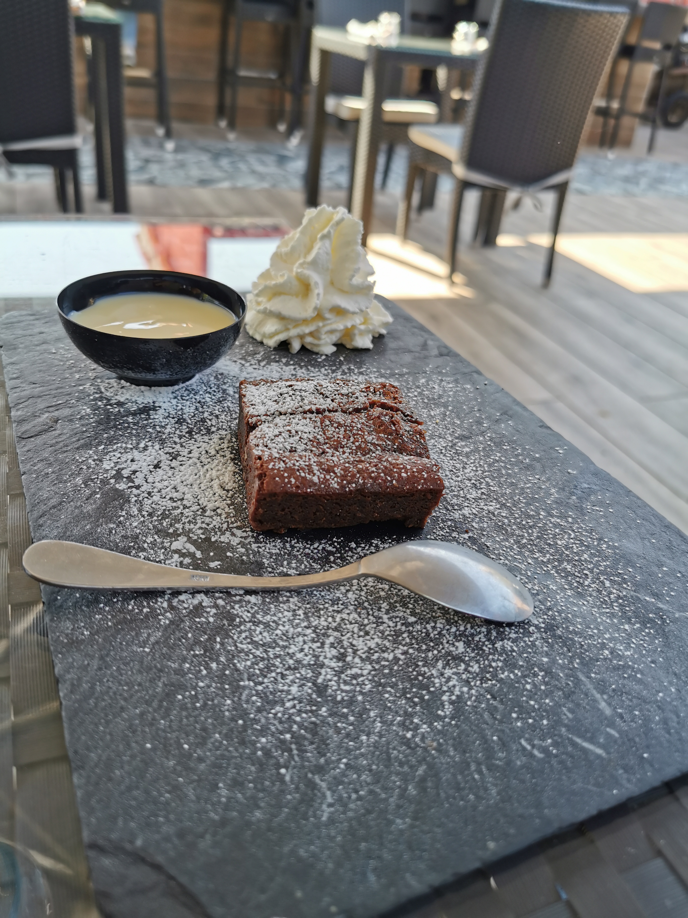 Environ 1h pour être servi ( burger avec de la salade et des frites ) l'attente se fait légèrement moin pénible une fois que l'on goûte à la qualité du burger.. je décide de commander une gaufre ( je prend sois de commander la gauffre au milieu de mon plat chaud pour ne pas trop attendre ) il arrivera quand même 20 minute plus tard... vous me direz ces le temps pour préparer une bonne gauffre au nutella... oui .. peu etre quand bien même faudrait elle qu'elle sois préparer à la commande.... elle était a peine réchauffé... et la plus grande surprise le Nutella était servi... dans des dosettes en plastique de 15 grammes.. merci d'avoir pensé à ne pas trop me donner kilo ... mais à 4,50€ la gauffre je m'attendais un minimum à ce que ces 30 grammes sois servie dans une petit coupelle en verre ... sans parler des deux cafés gourmands servies à mes amis qui ne se ressemblais pas ( il y avait d'ailleurs 5 assortiment avec le café sur l'assiette préparer proprement et 4 sur l'assiette préparer dans ce qui me semble être une seconde cuisine au vue de la préparation...) l'un avec une assiettes en craies noire très bien présenté, quand à mon ami il était servi dans une assiettes basique, le macaron n'étant pas poser sur le coter de l'assiette mais manquant de place à été poser ... dans la crème Chantilly... cettait un soir de rassemblement automobile vos tables était pleine cettait cool ... mais si votre plonge n'es pas capable de gérer les couverts correctement il faudrait voir à baisser le nombre d'entre au table... ou d'embaucher une personne supplémentaire. . ( a moin que vos équipement pour faire la vaisselle sois en panne alors la je vous présente mes excuses)... bref un restaurant dans un cadre vraiment très beau, une déco tres agréable, terrasse ou chacuns y a sont espace... mais SVP le coup de la gauffre a 4,50€ pour être servie dans des dosettes en plastique ( sans cuillère très pratique pour étaler le nutella ) se serait bien de voir pour un autre système... je reviendrait... ce restaurant a quand même un très beau potentiel !
