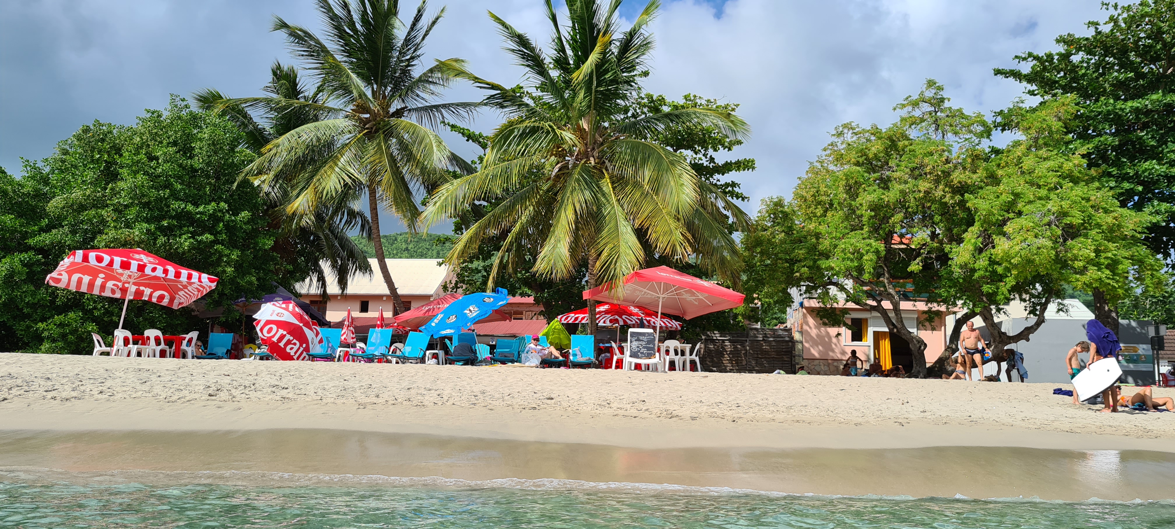 Plats locaux avec les pieds dans le sable sur la plage d'Ance d'Arlet. Prix raisonnable et bon service.