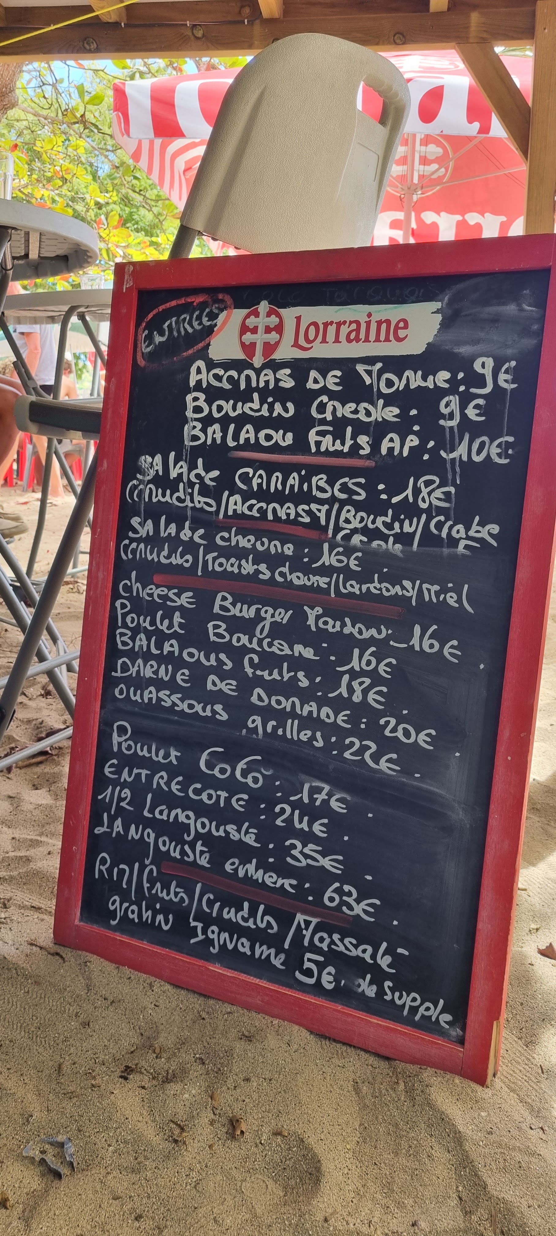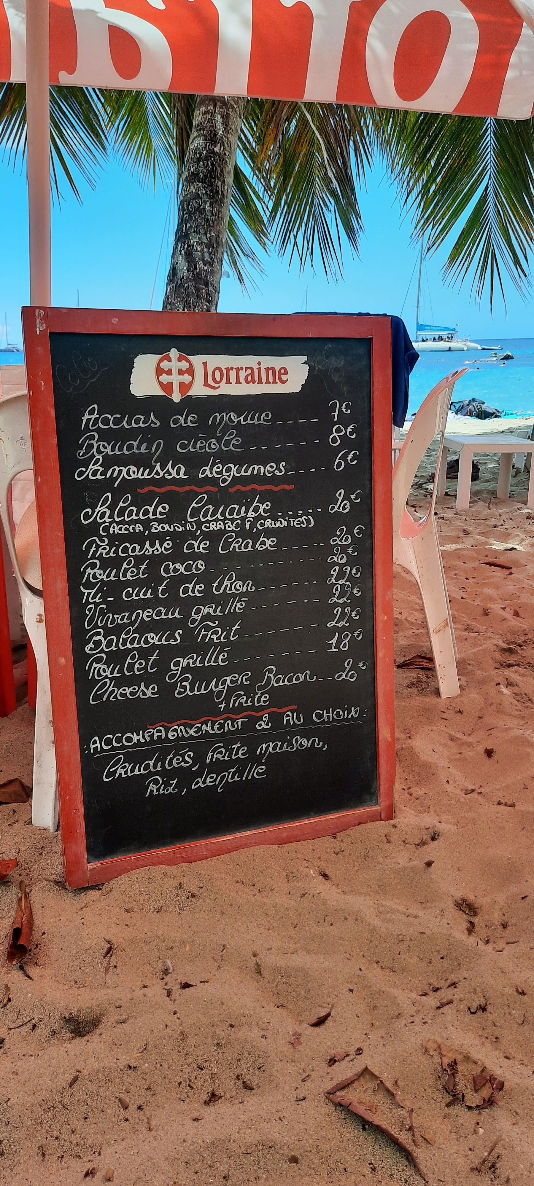 Les pieds dans le sable littéralement. Repas très bon prix raisonnables. Pour ma part j'ai pris salade caraïbes. Si vous voulez passer une journée les pieds dans l'eau avec resto à proximité allez y !!