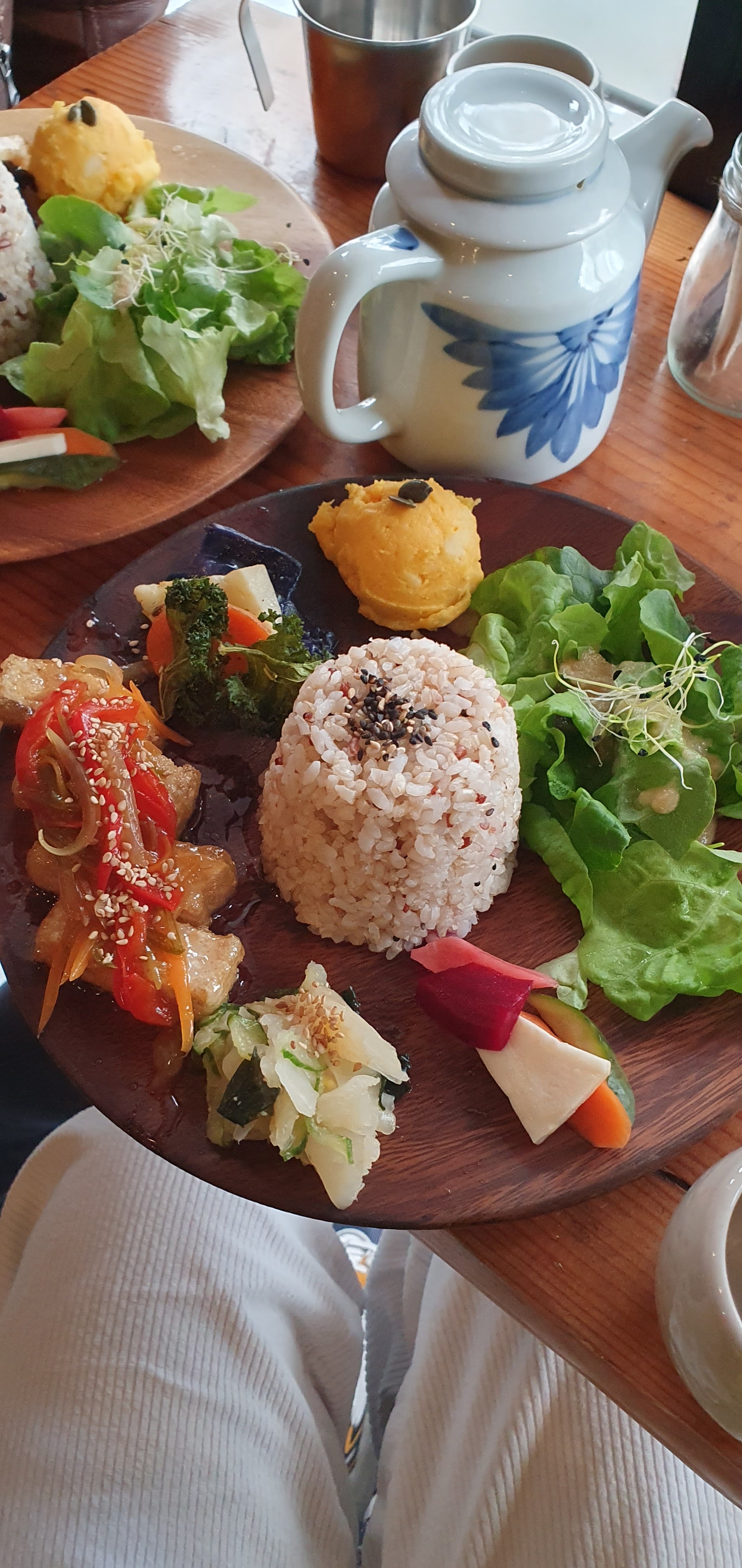 Super bon et très accueillant. Dans une petite rue calme. Vraiment super super bon. Avec la possibilité de manger végétalien, de choisir son type de riz, du thé, des jus, tout ça avec le sourire. Bref je reviendrai. (sur la photo deux plats à emporter, délicieux). (Je crois qu'elles proposent aussi des exercices de Yoga le samedi matin avant de prendre un bon déjeuné)