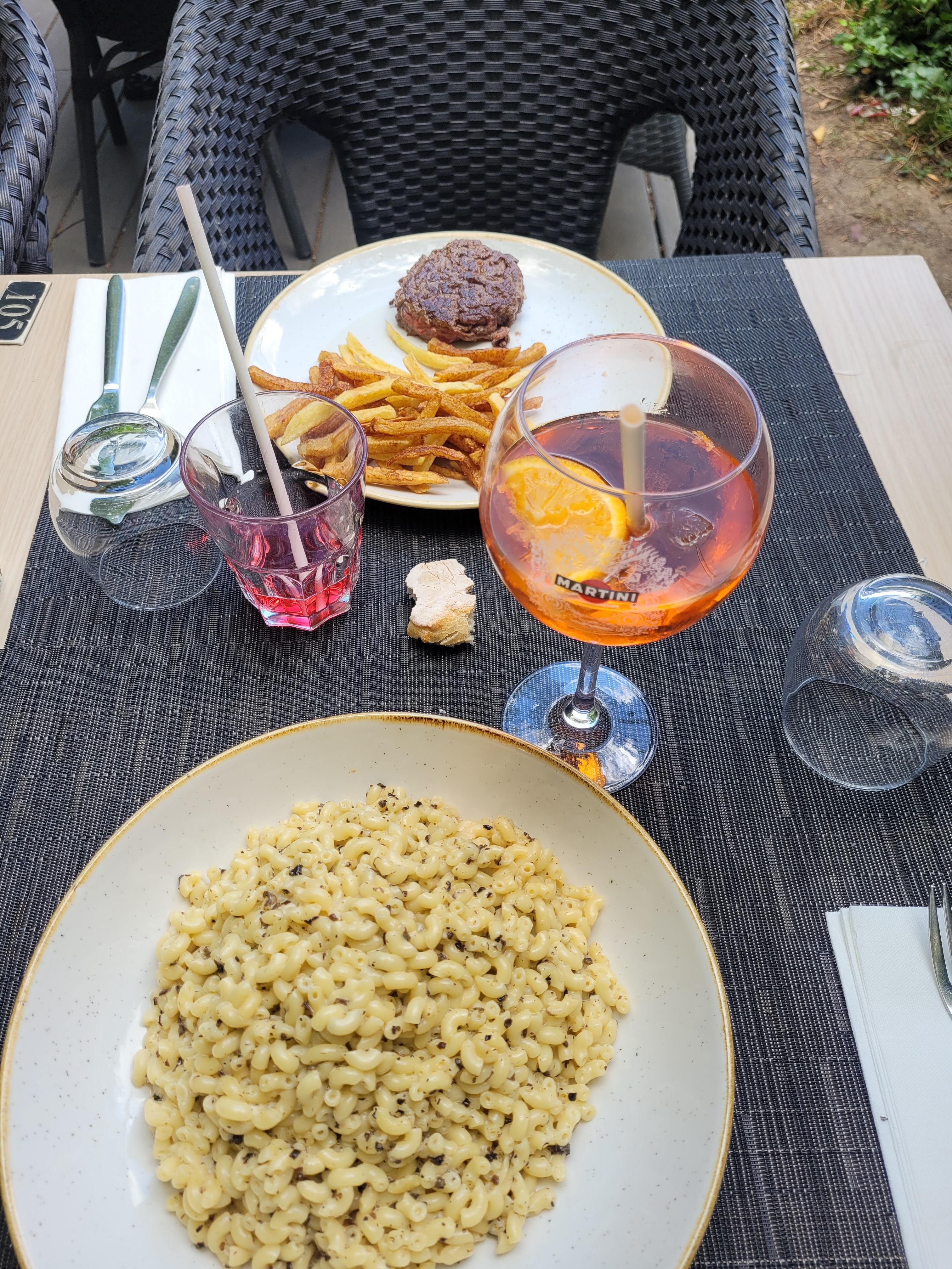 Repas en famille. Table extérieure à l'ombre des mûriers très agréable. Frites fraîches et profiteroles délicieuses. Personnel très sympathique.