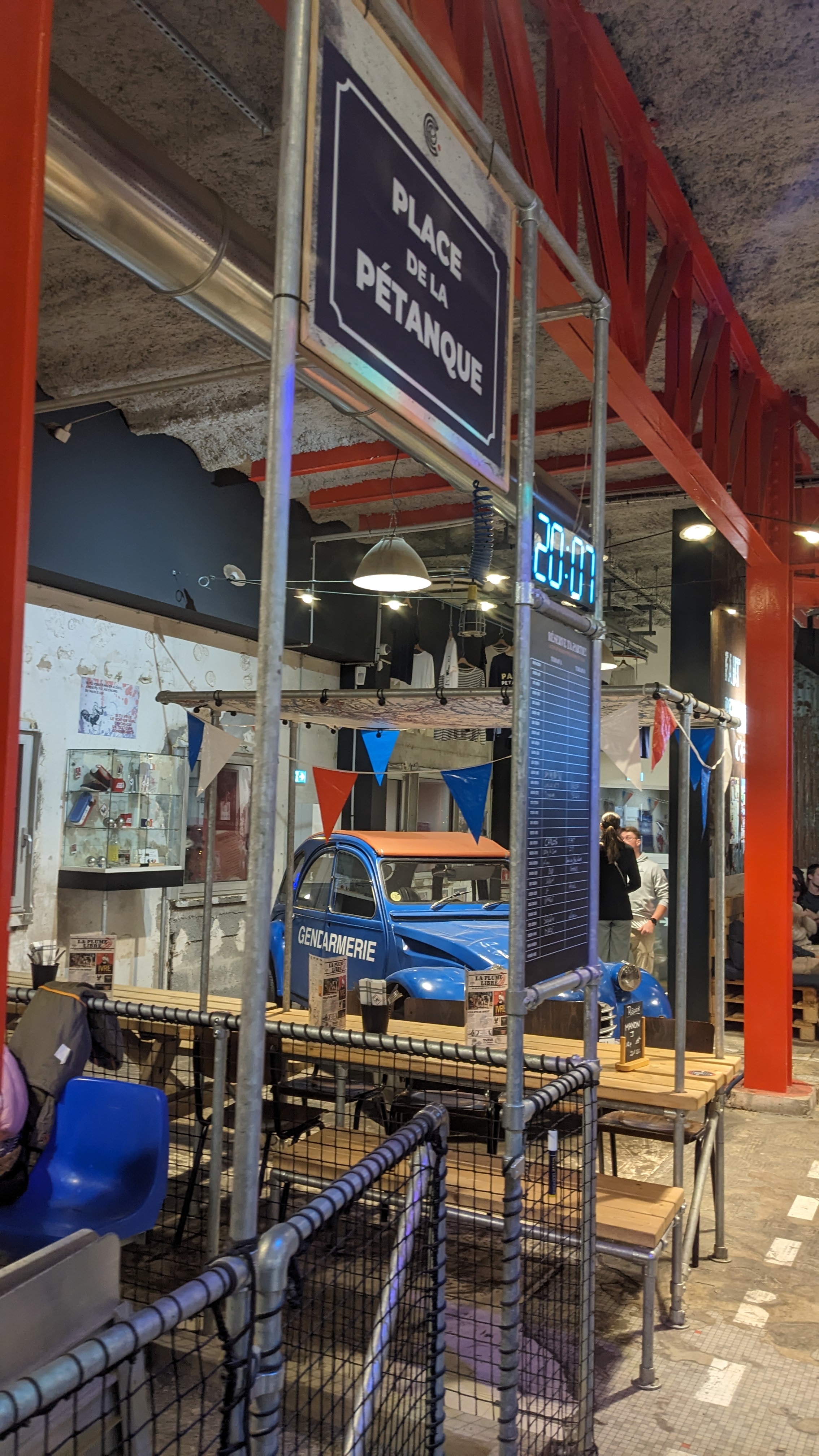 C'est un endroit original d'inspiration du film Le gendarme de St tropez avec ses deux terrains de pétanque , ses véhicules vintages et sa déco néo industrielle flashie. Ceci dit vu l'architecture et la hauteur de plafond c'est extrêmement bruyant. La cuisine de type brasserie est honnête seul bémol deux bières pression présentes sur la carte non disponibles. Le service quand à lui est jeune, souriant, efficace. Bref c'est un endroit sympathique pour venir en groupe, pour un dîner romantique un peu moins ...