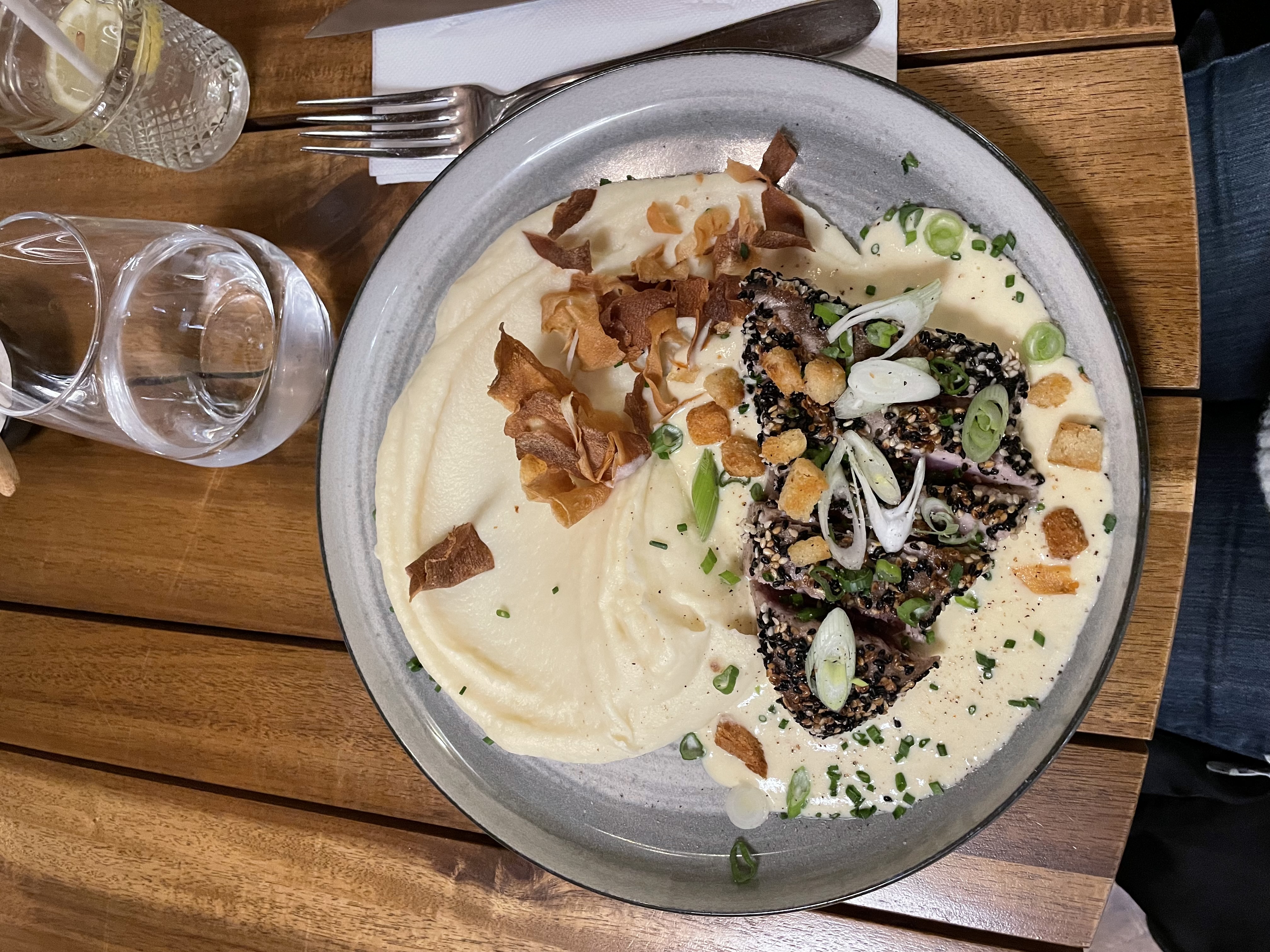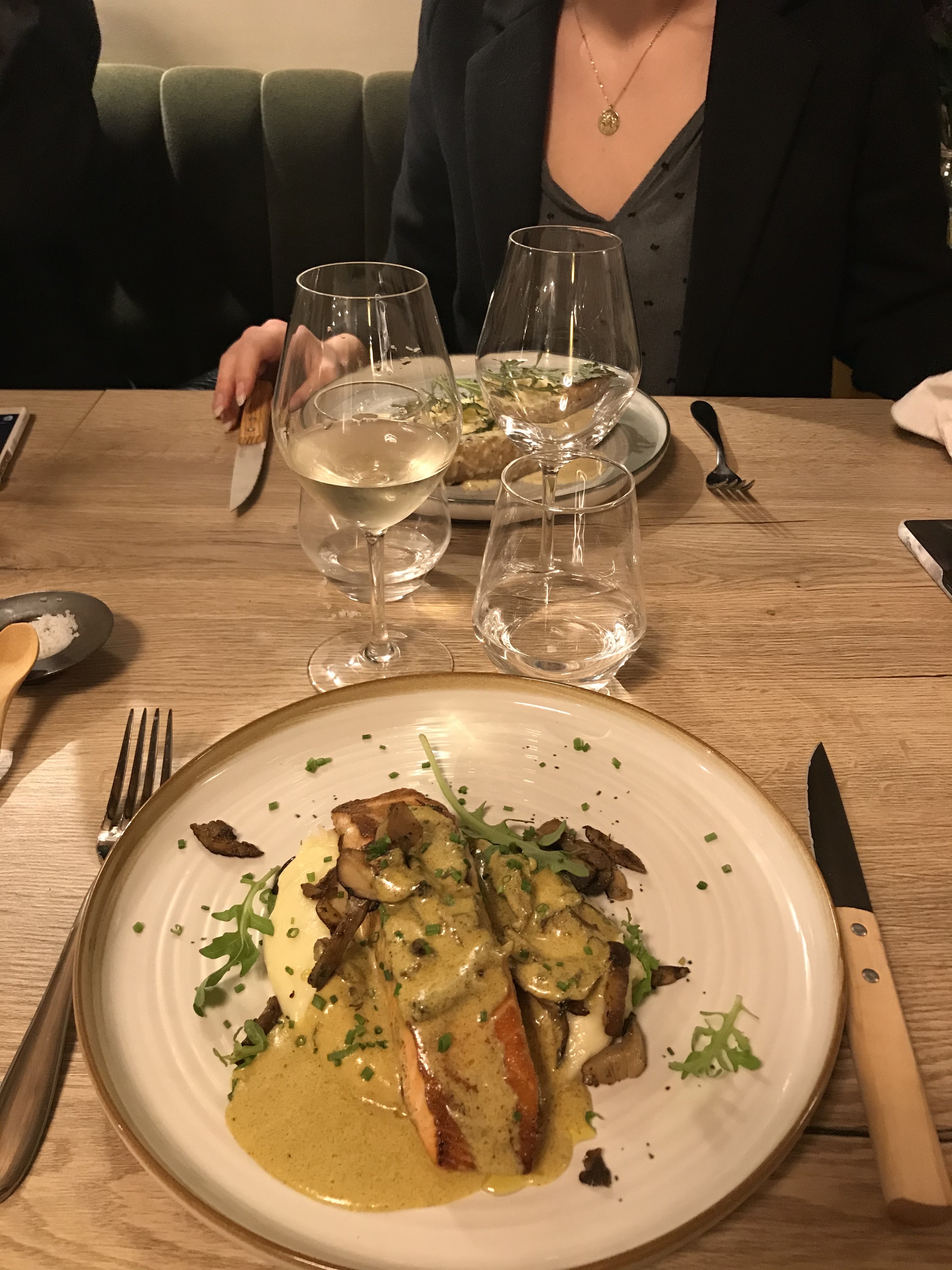 Je me suis régalée : saumon avec sa sauce au curry et sa purée de patate douce et le profiterolle un délice ! Personnel sympathique et belle déco 👍