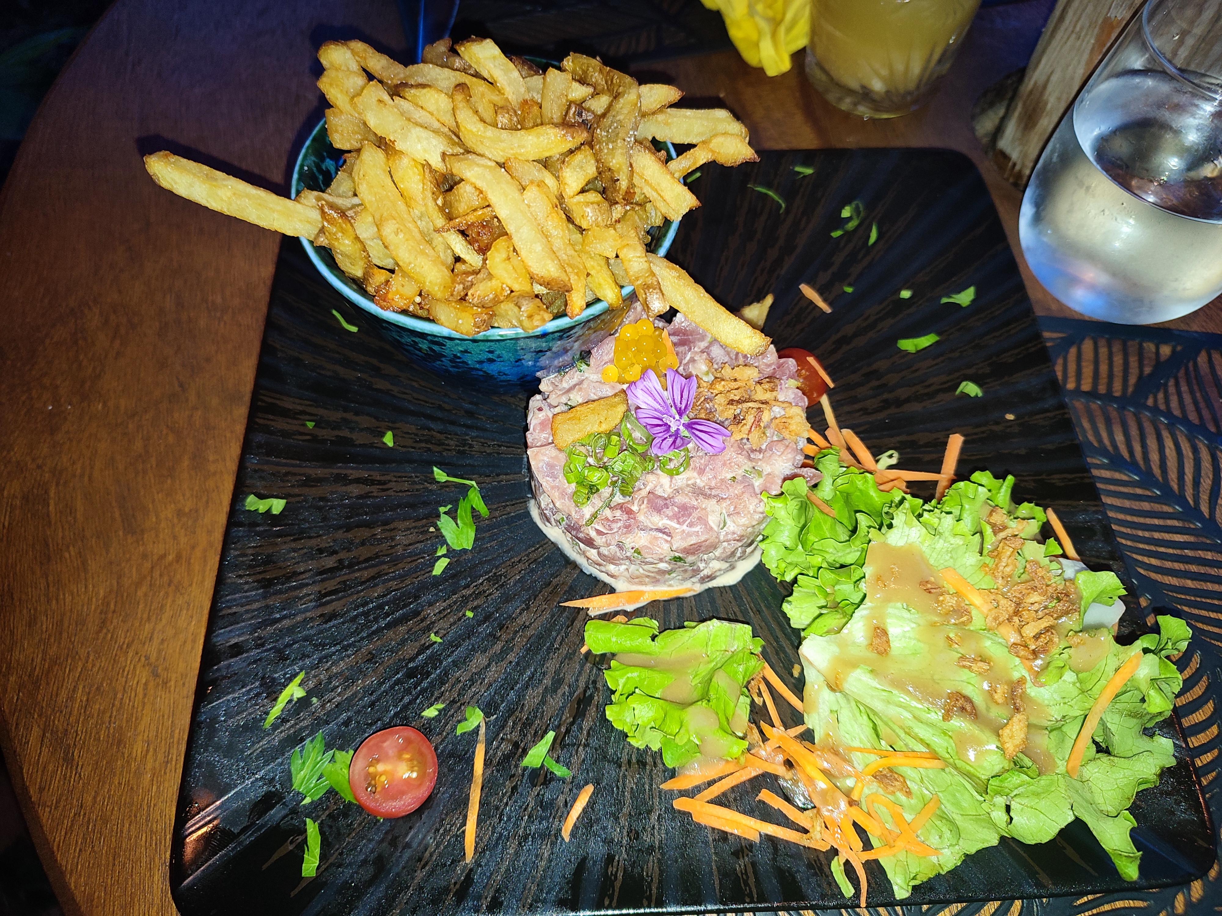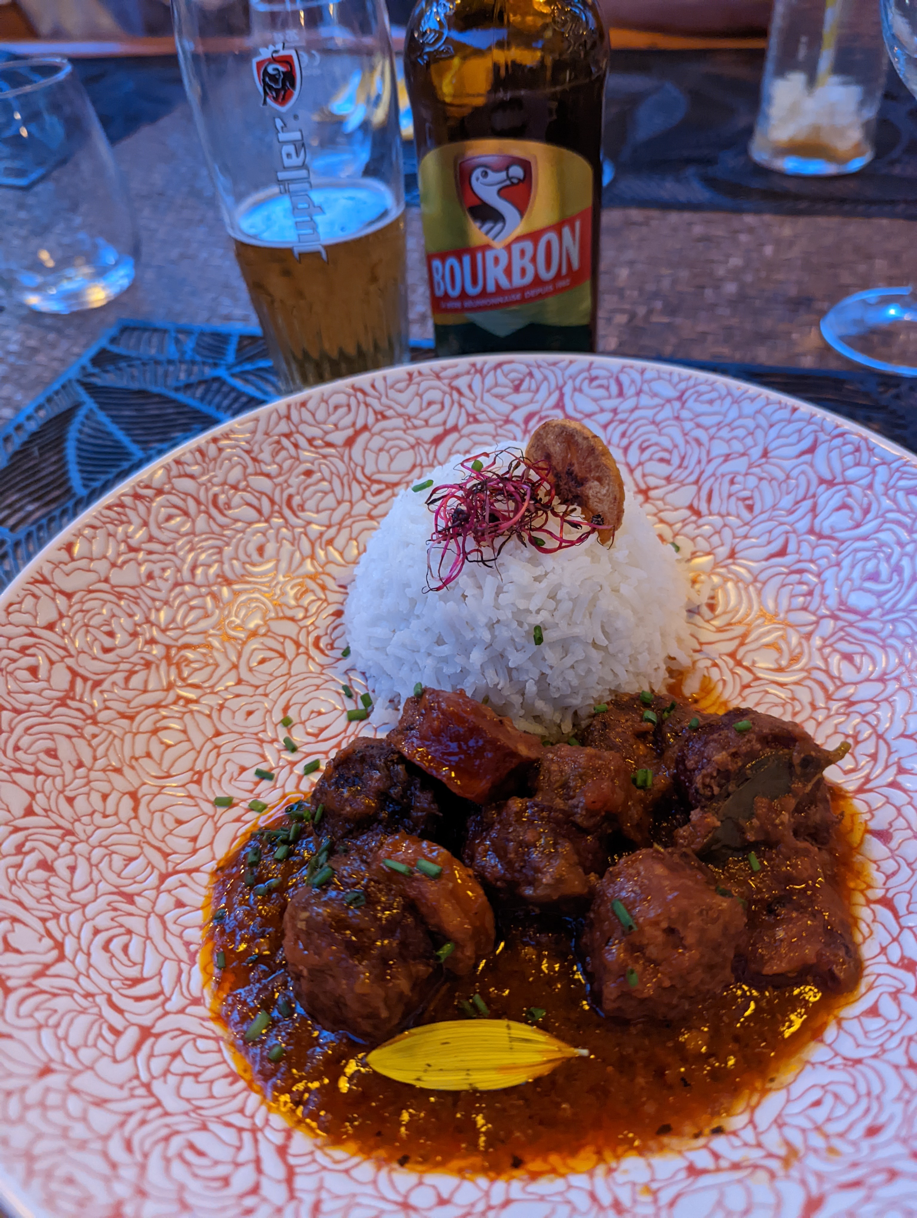 Je dirais que la seule note positive a été le décor Plats très chers au vue de la qualitée La personne a l accueil pourrait être plus agréable envers sa clientèle, en effet quand on nous demande comment notre repas c est passé on lui a répondu que certain plats été sec mais apparemment nous n avons pas le droit de dire ce qu on pense ! Pas d eau ni de pain servi à table Et je me prend une réflexion pour avoir commandé des frites avec mon plats car on ne fait pas sa a la réunion !! Il est clair que au vue de l accueil du tarif et de la qualité des plats nous ne reviendrons pas