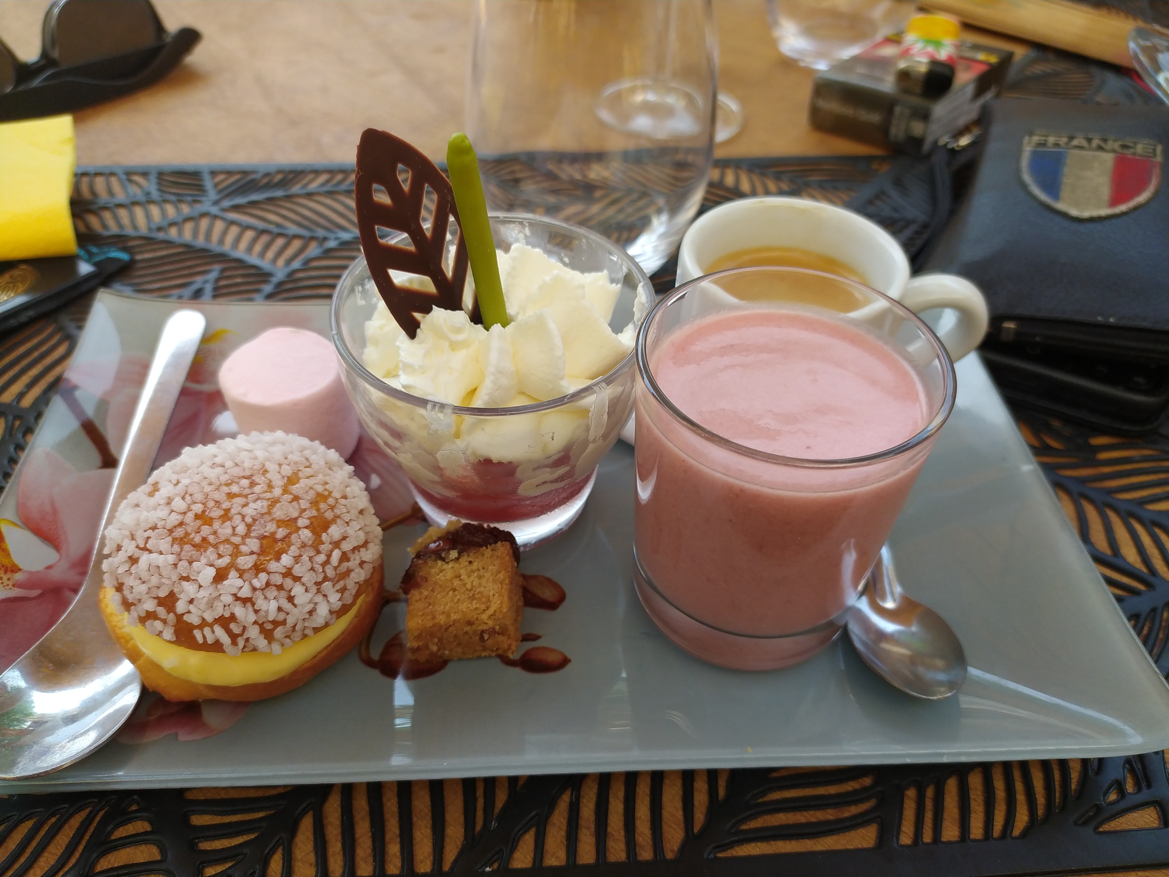 Repas horrible du début à la fin ! Pour commencer lors de la réservation par téléphone nous avions prévenu qu’il y avait une allergie mortelle à l’arachide, on nous a dit de prévenir à l’arrivée ce qu’on a fait et on nous a répondu qu’il fallait le dire au téléphone….. Je n’ai pu mangé que quelques verrines, des œufs brouillés immangeables et le dessert (pas de plat car cacahuètes dedans) sans le moindre geste de la part de l’établissement. Passons au repas : Table en plein soleil, après avoir demandé de changer on nous déplace sur des banquettes sales avec des tas de feuilles dessus sans prendre la peine de passer un coup, les œufs brouillés étaient immangeables tellement ils étaient salés sans compter la musique à fond on se serait crus en boîte de nuit, obligés de crier pour s’entendre. On a été obligés de demander à 2 serveurs 3 fois de nous amener les desserts tellement le service était lent et pour couronner le tout une intoxication alimentaire, ce qui est sûr c’est qu’on ne se rendra plus dans ce « restaurant »