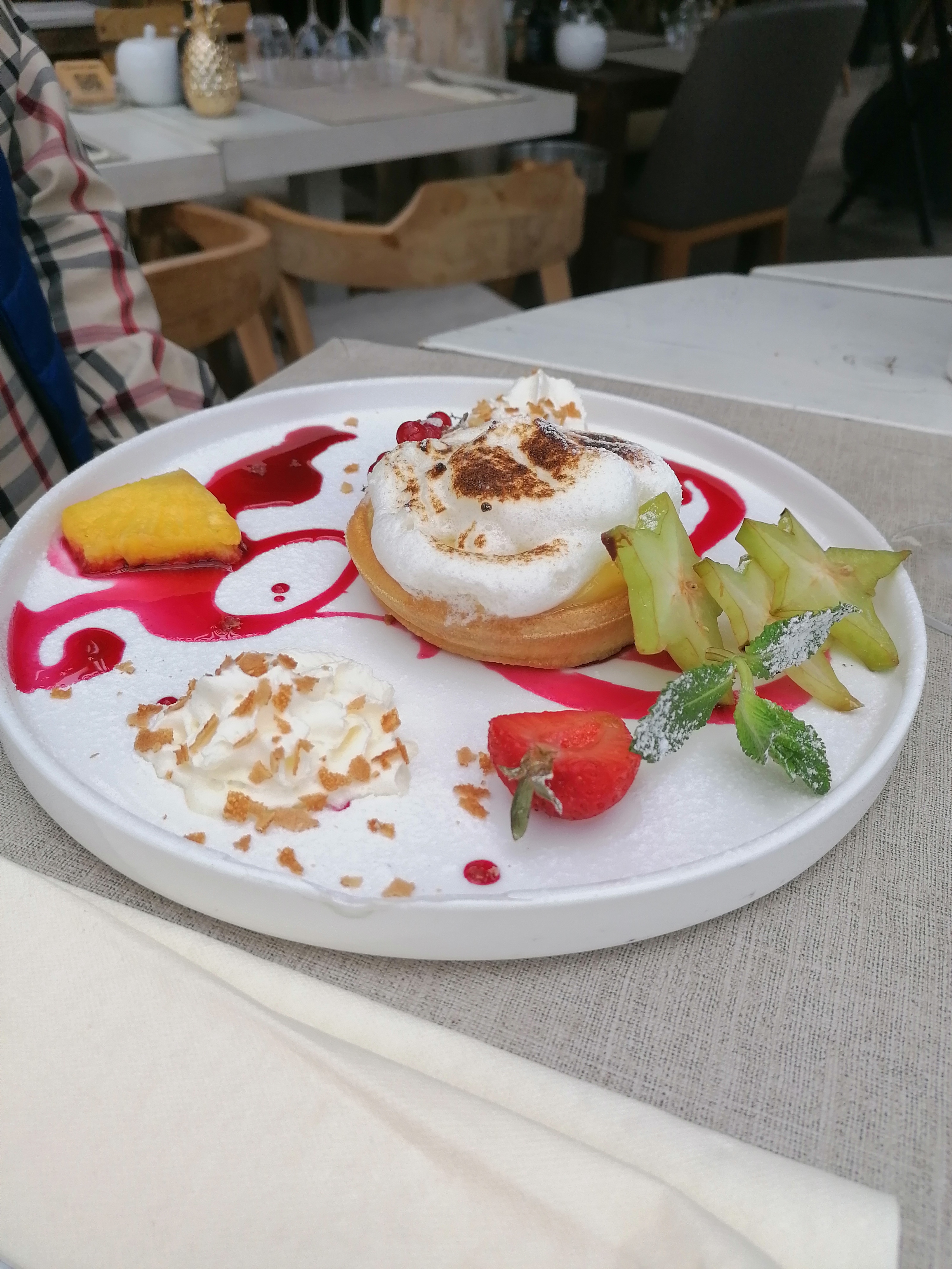 Tout était délicieux, très bien présenté et servi avec le sourire ! Le tout avec la vue sur la mer dans la terrasse couverte.