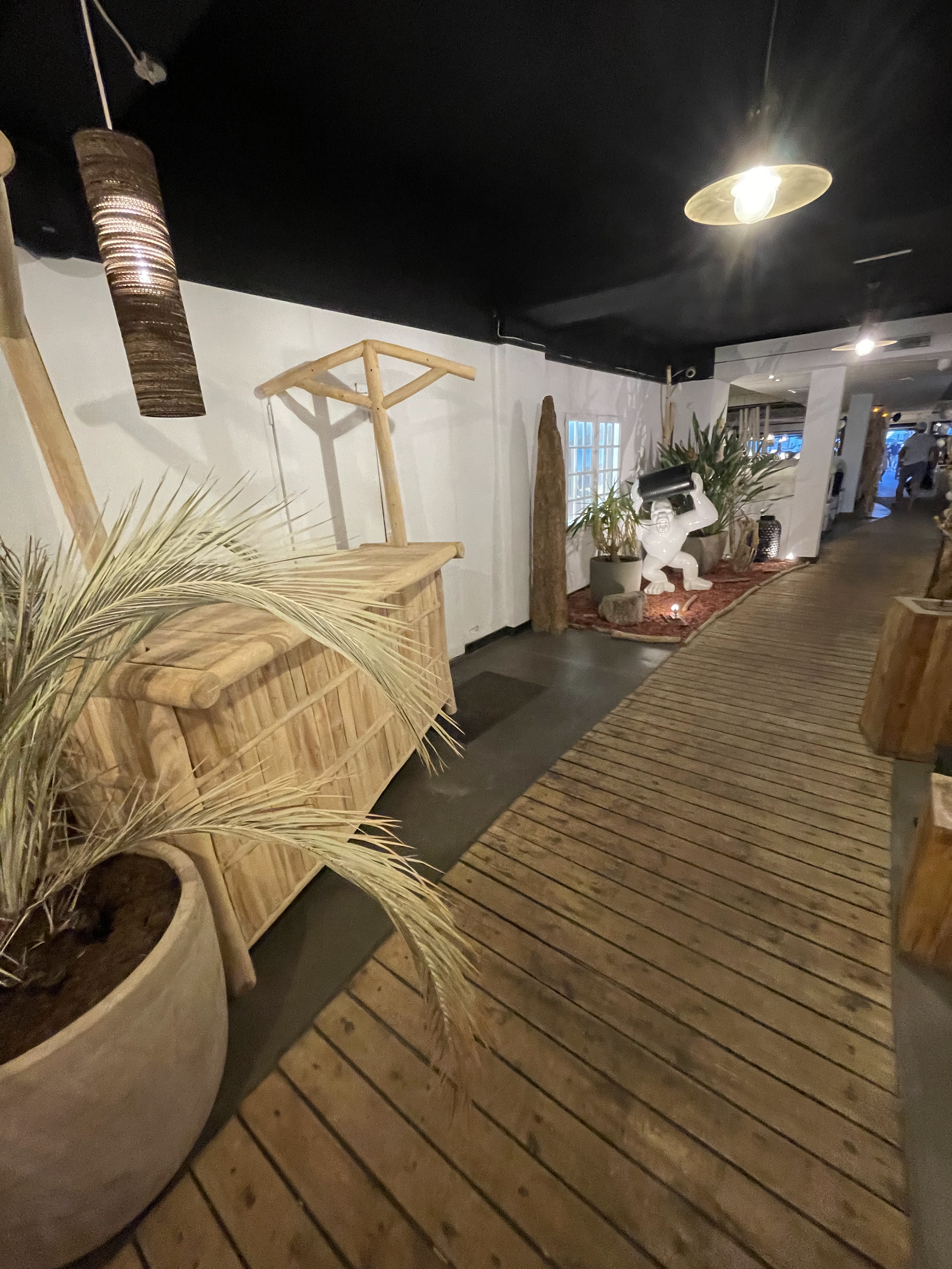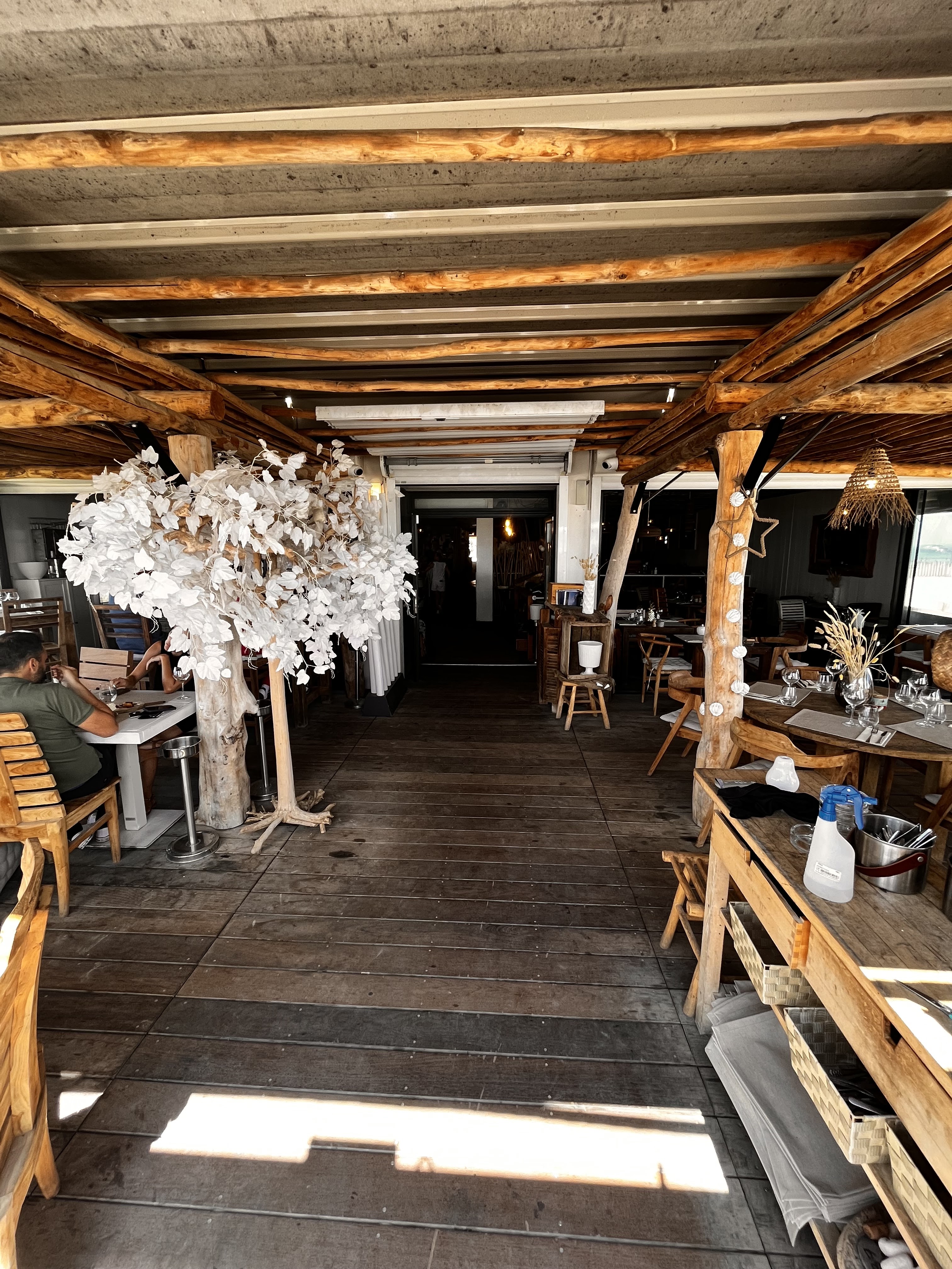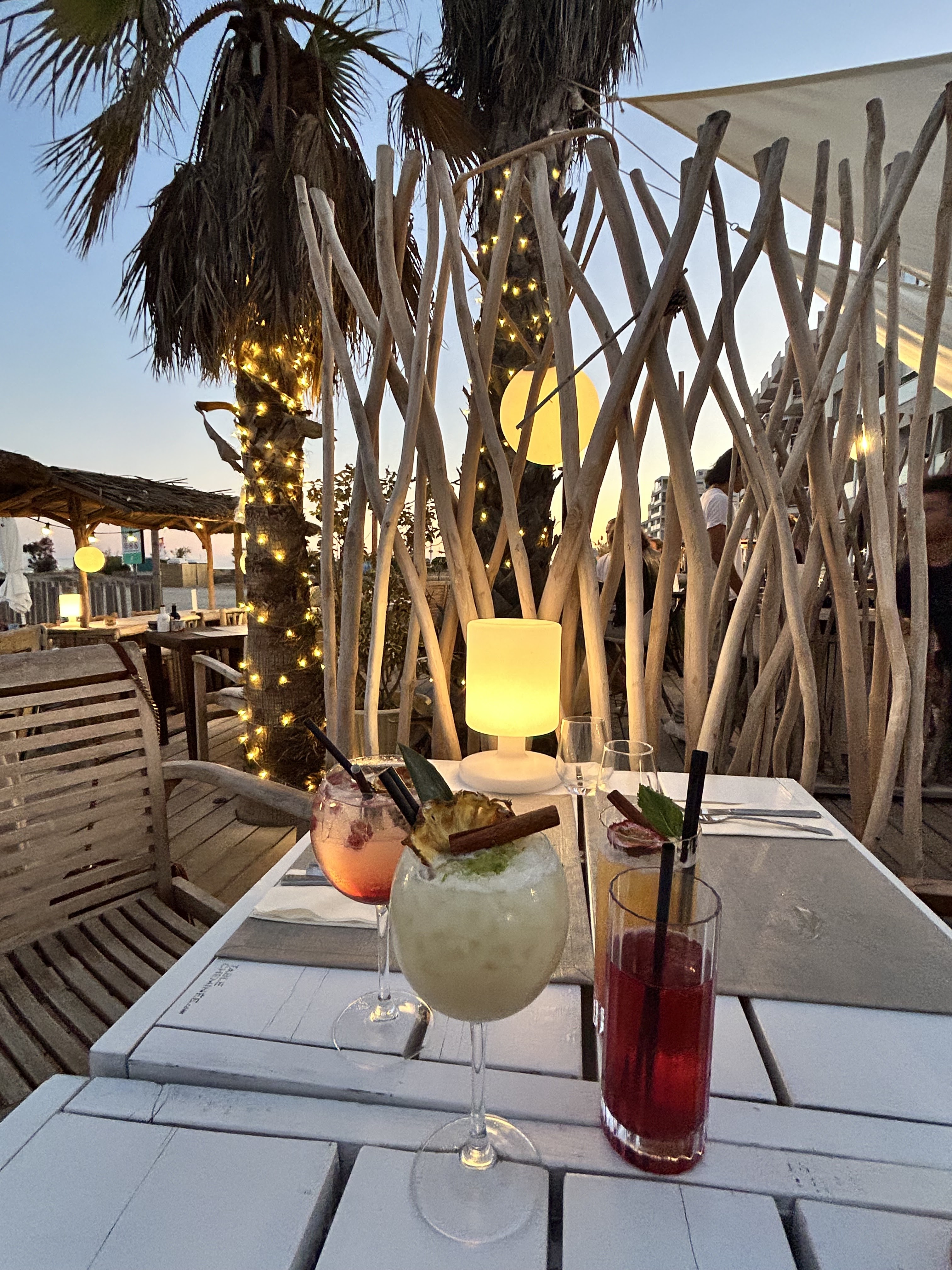 Joli cadre, belle déco. Par contre, trop cher par rapport au contenu de l'assiette : quantités minimales, produits annoncés comme frais alors que congelés. Grillades pêche du jour alors que saumon servi (??? Pêché en méditerranée ??) et gambas surgelées pleines d'eau et caoutchouteuses. Sans parler de l'accompagnement servi : un malheureux bol de salade et un de frites. On nous a dit accompagnement à volonté, mais en fait on nous a fait payer les 3 petits bols de frites demandés en plus 3x4€ (12€) pour des frites ! Malgré toute la bonne volonté des serveurs incapables d'expliquer les plats mais désirant faire plaisir aux clients malgré tout, le service était déplorable. Les accompagnements sont servis 30 min après l'arrivée du plat, le grill ne fonctionne pas (changement de la bouteille de gaz sous nos pieds alors que le plat est déjà servi), beaucoup d'attente pour nos demandes, erreur de service... Sans compter le mobilier pas net (tables dont la peinture est abîmée, tabourets hauts sales dont la galette d'assise est tachée. Nous avons transmis ces remarques de vive voix mais la direction présente n'est même pas venue nous voir pour s'expliquer ni faire un geste commercial. Bref restaurant à fuir absolument, un réel attrape touristes. Pour le même prix, il y a d'autres paillotes tellement mieux tout près.