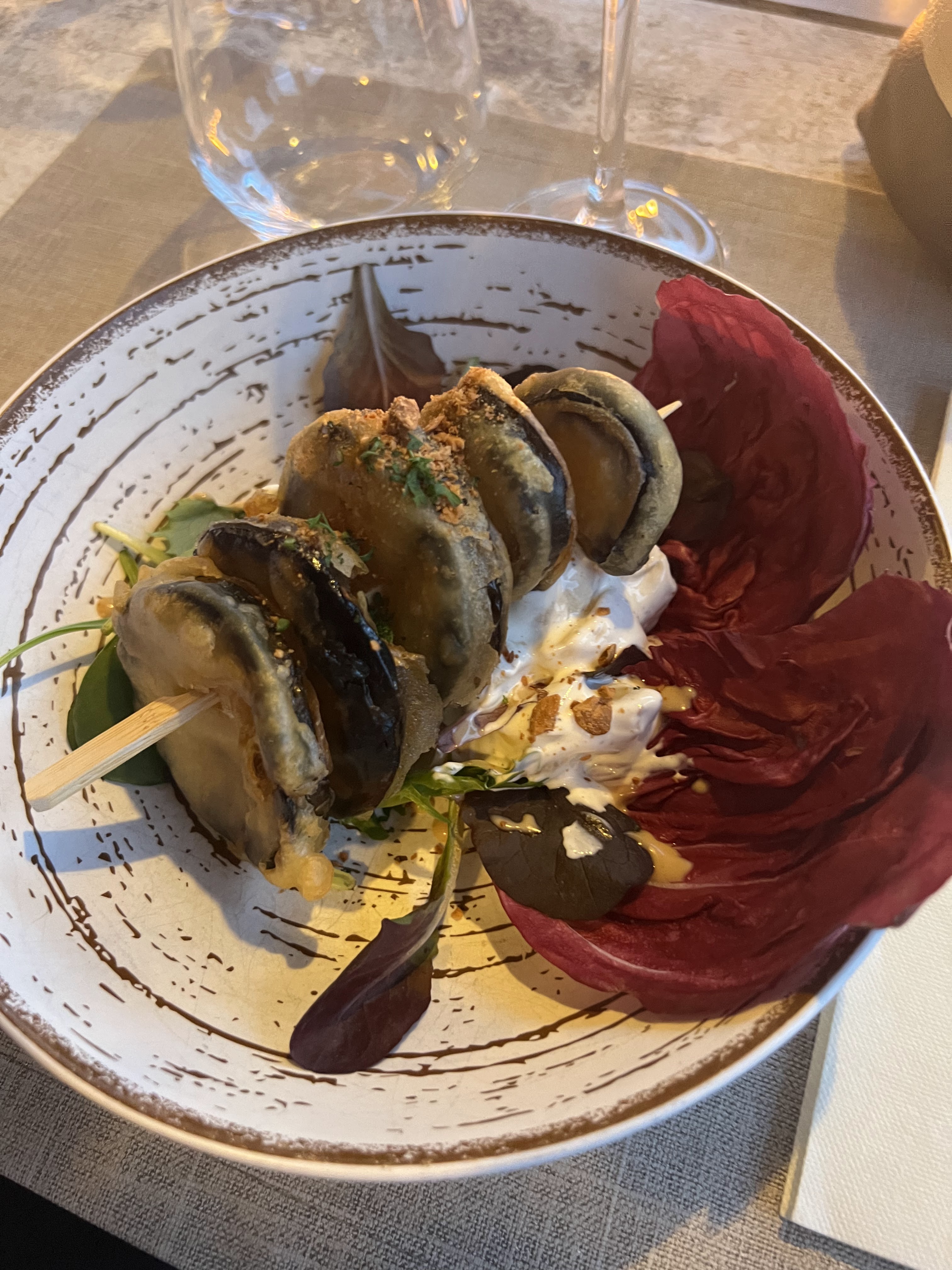 Endroit agréable . Table ronde demandée pour 5 et demande exaucée . Entrée moules couteaux et légumes grillés top ! Service assuré d’une main de maître par Romain ! Seule. Ombre au tableau .. attente longue oour le plat qui nous aura privé de dessert ! 😅 en même temps nous n’avions plus faim’!