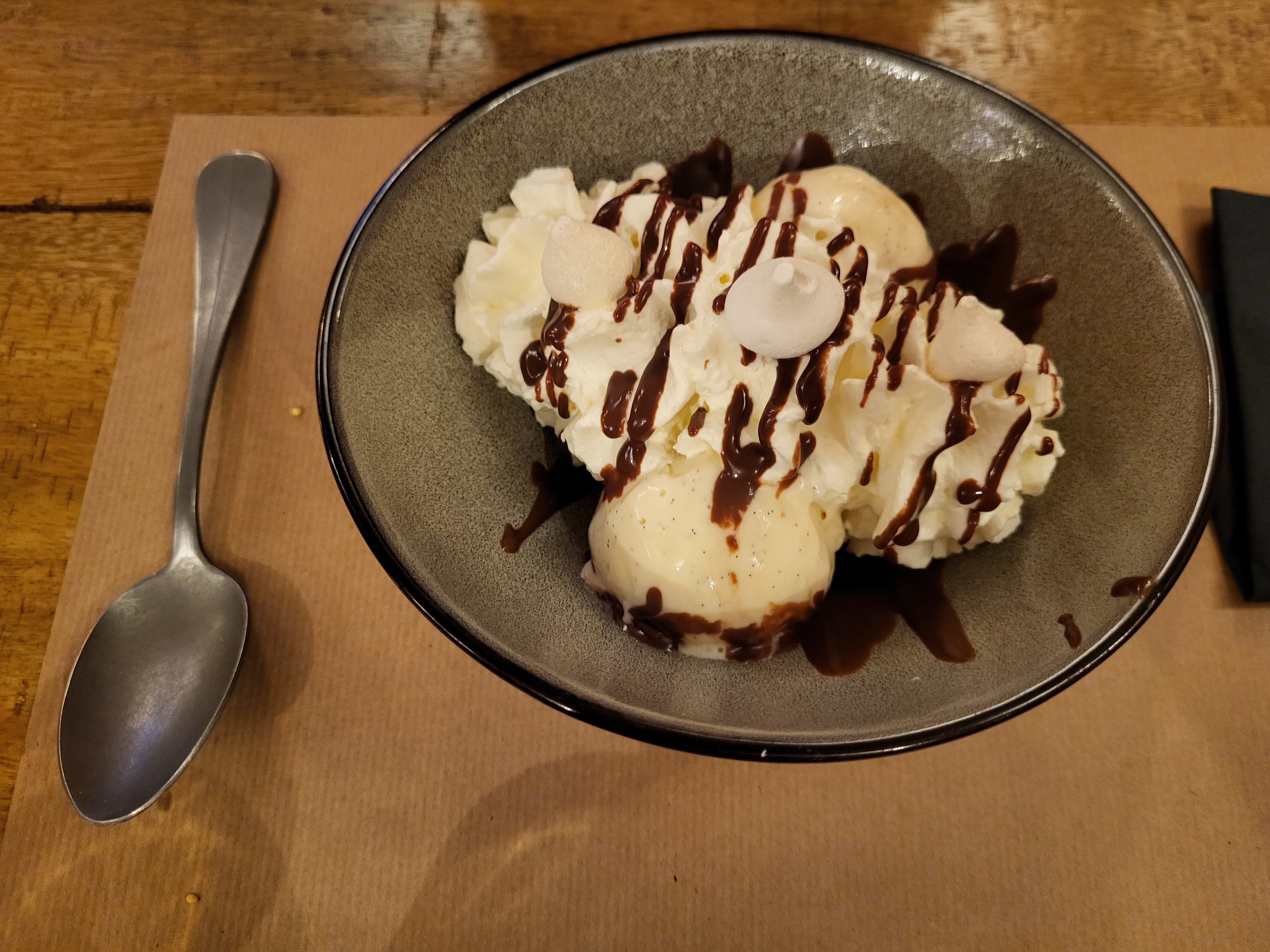 Cadre original. Burger poulet tandoori et sa salade verte très bon. Dame blanche avec sa glace artisanale bonne. Service sympathique, de qualité . Merci à vous.