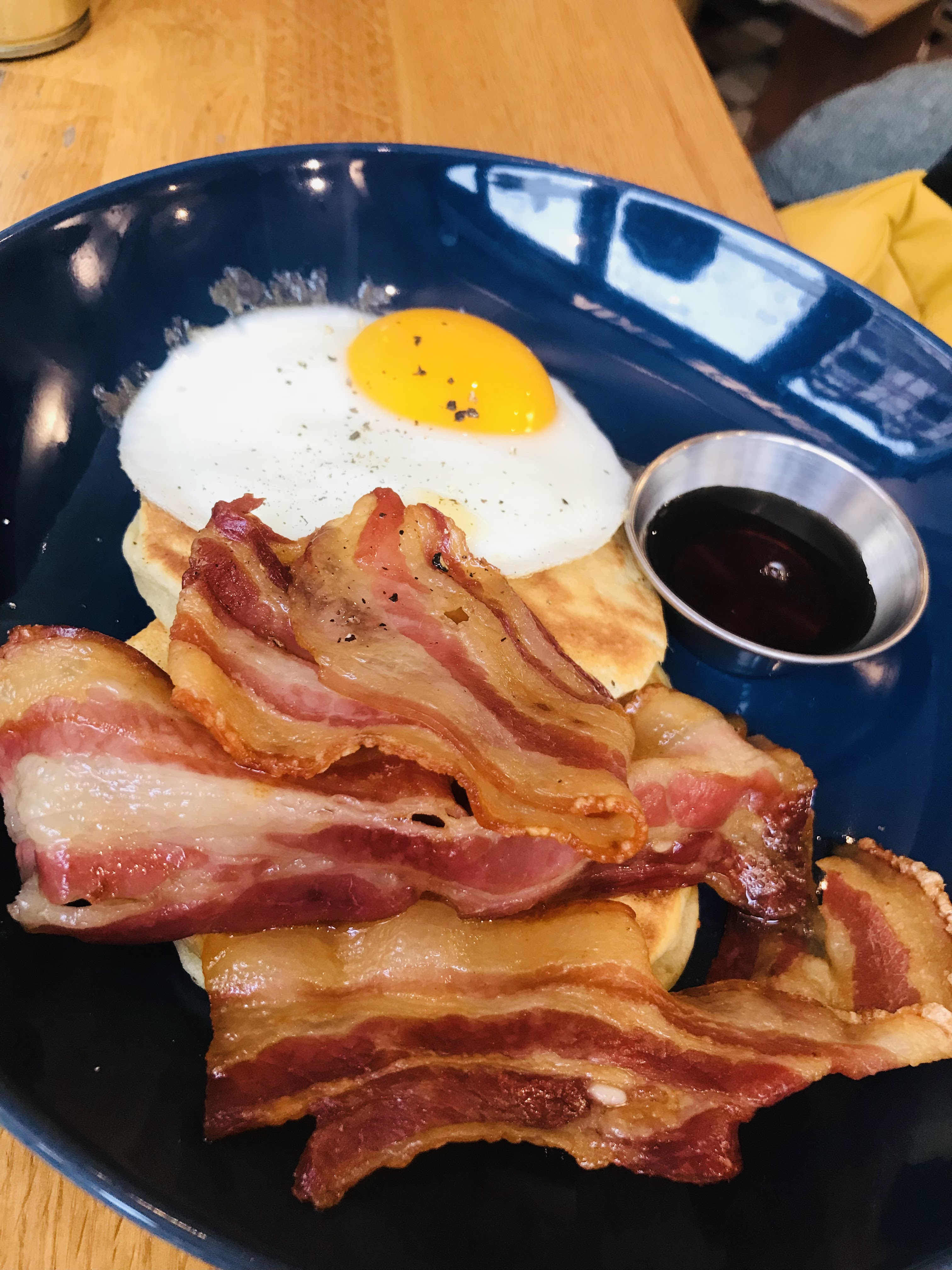 Pas de formule cette fois-ci mais un plat unique avec une boisson car nous manquions de temps. Jus du jour et cappuccino excellents. Pancakes salés délicieux, truite pour l'un et bacon pour l'autre. Petite étoile en moins pour la cuisine car c'est la 1ere fois que j'ai une telle différence dans l'assiette au Coffee Ekia. L'assiette des pancakes salés bacon se limitait à 2 beaux pancakes, du bacon et un œuf au plat! Pas de fioritures, pas d'agréments, pas de salade, ...rien de rien...12,90€ me semblent un peu onéreux pour une simplicité aussi radicale. Mais, c'est bon alors...je reviendrai.