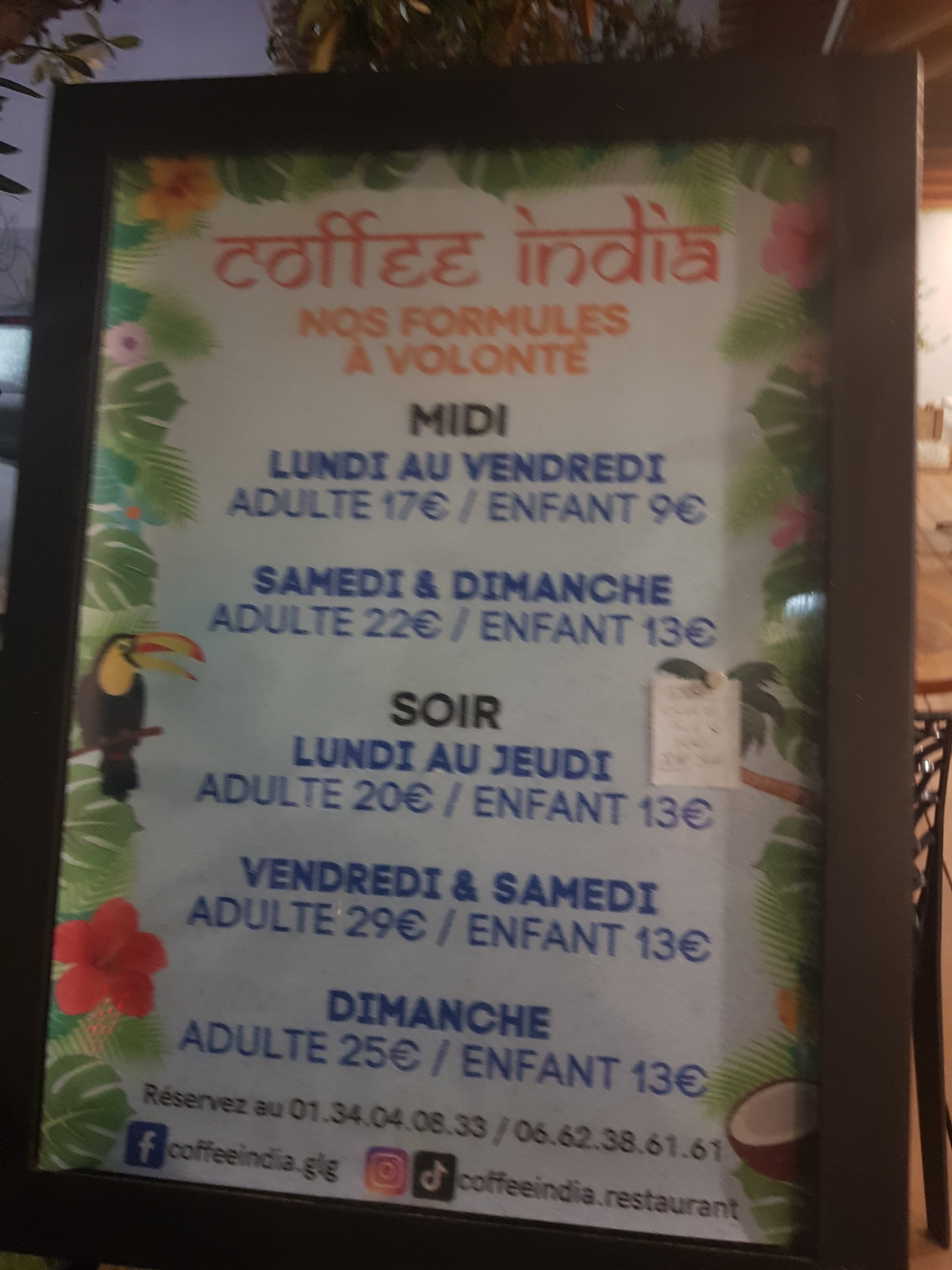 Buffet à volonté pour adultes 19,90€ Enfants jusqu'à 12 ans 11,00€ Cuisines: Indienne / Antillaise Plats incontournable : colombo de cabri ( le top): Riz haricots rouges ( très bien): Accras du morue ( bien): poulet roussi (pas mal). Les plats : sont préparés par le Chef / Charles. Les animations le vendredi et samedi soir sont assurées par PIPO ( et avec l'ami PIPO il n'y a pas de pipo)